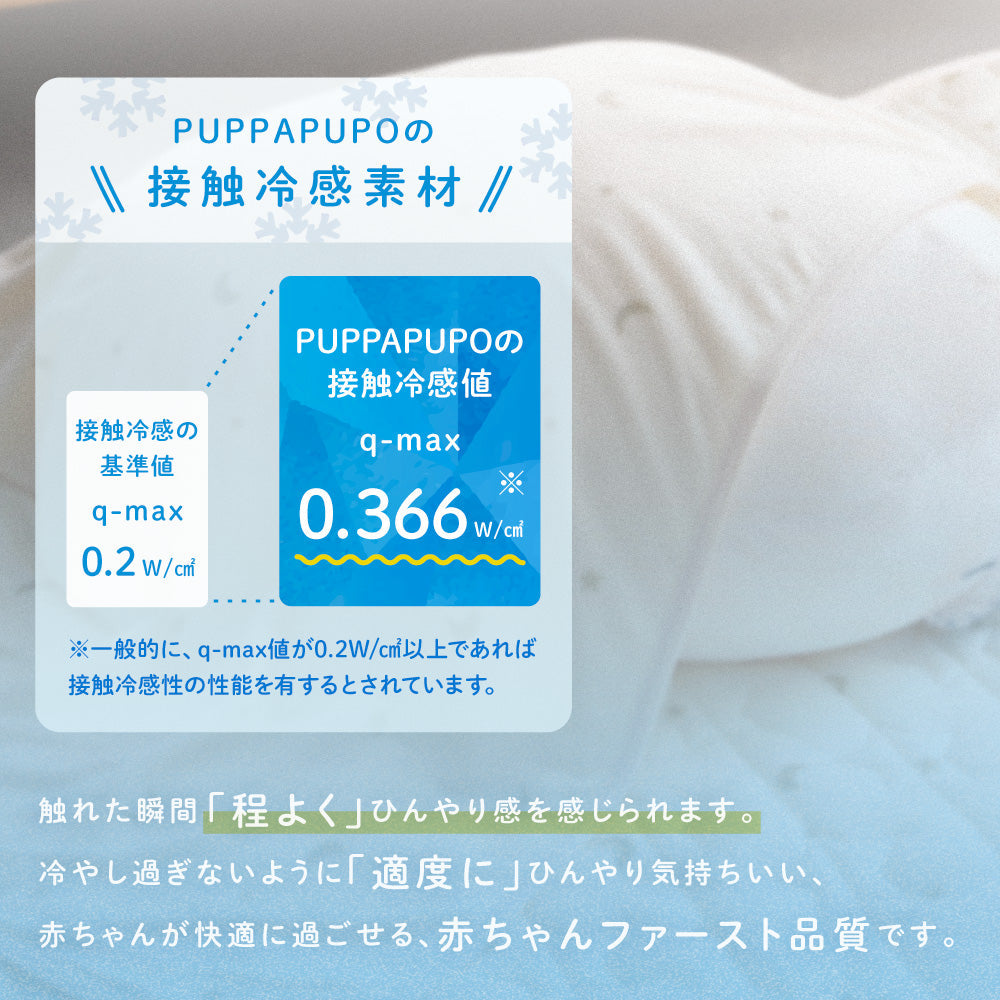 PUPPAPUPOの接触冷感素材はq-max値【約0.366 W/cm² 】で触れた瞬間「程よく」ひんやり感を感じられます。冷やし過ぎないように「適度に」ひんやり気持ちいい、赤ちゃんが快適に過ごせる、赤ちゃんファースト品質です。※一般的に、q-max値が0.2W/㎠以上であれば、接触冷感性の性能を有するとされています。