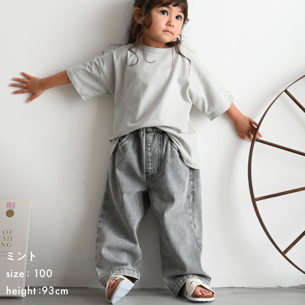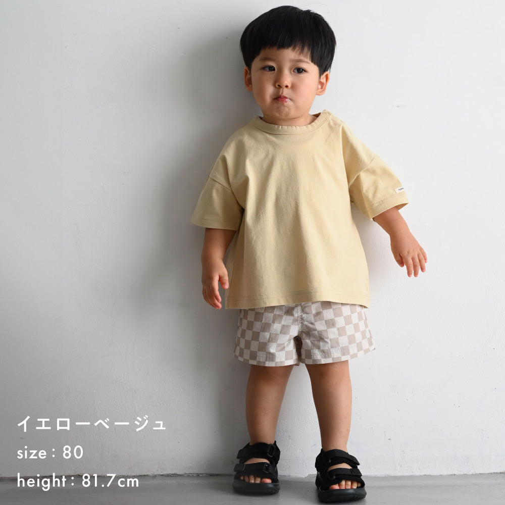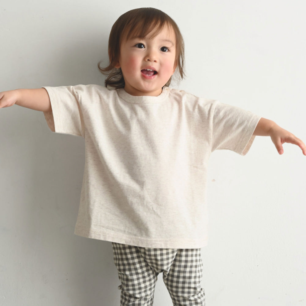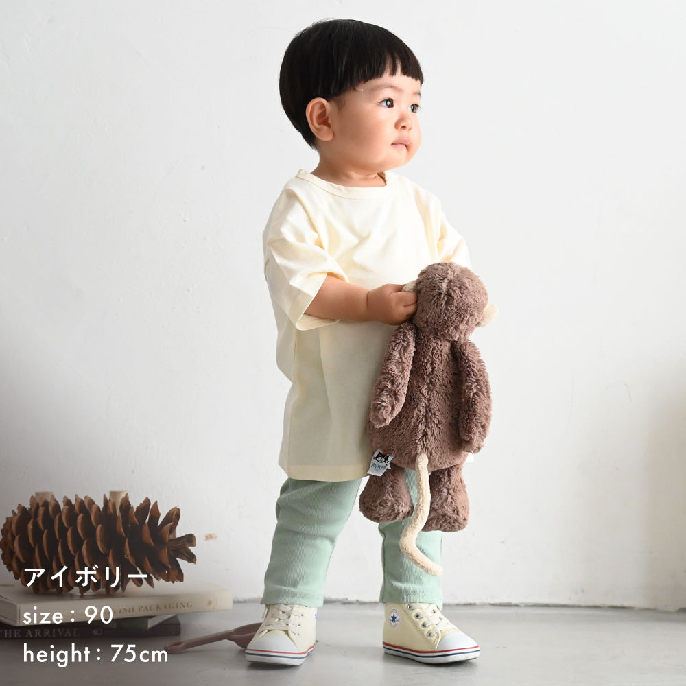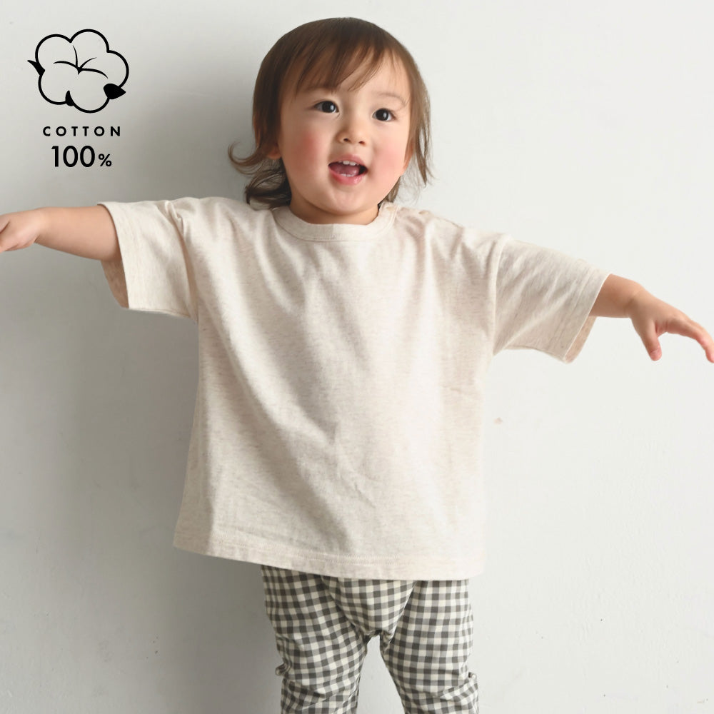 キッズもママも嬉しいコットン100%の天竺素材で、さらっと、やわらかな肌触り。ベビー服・キッズ服として程よい厚さで、長いシーズンお使いいただけます。(こちらは衿ぐりも含めてすべて綿100%です。)