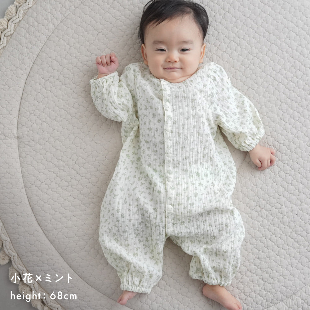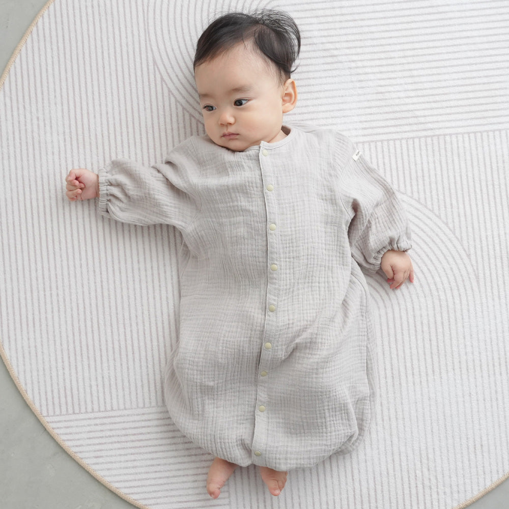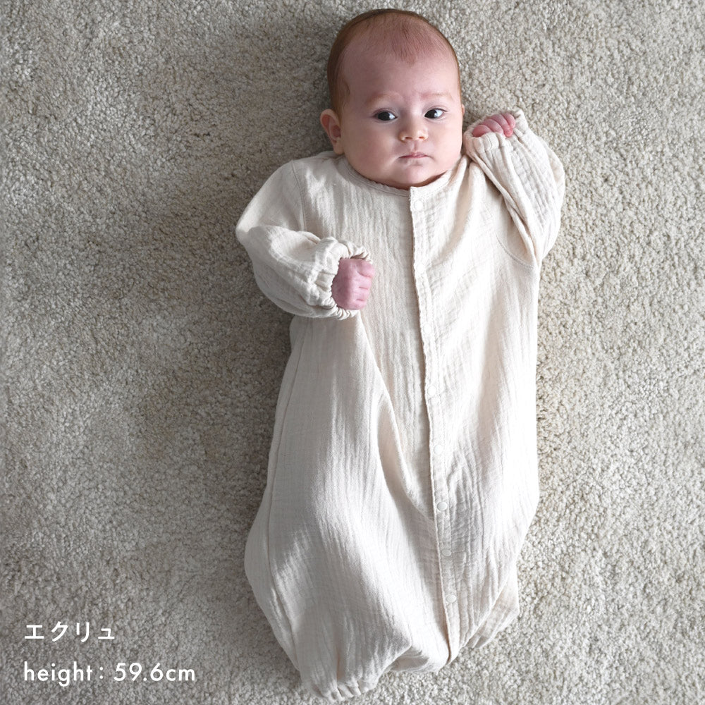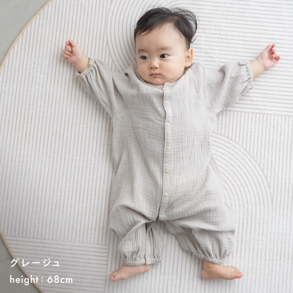 洗う度に風合いが増すふわっとやわらかコットン100%のしわ感がおしゃれなダブルガーゼカバーオール。通気の良さや汗をかいても乾きやすいなどの特長があり春・夏・秋・冬、長いシーズンお使いいただけます。