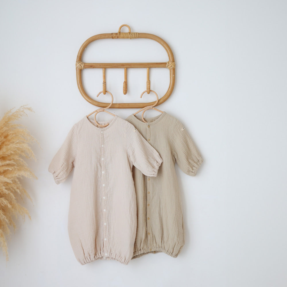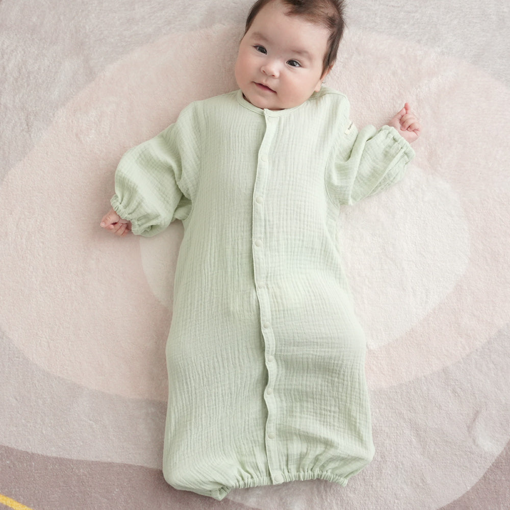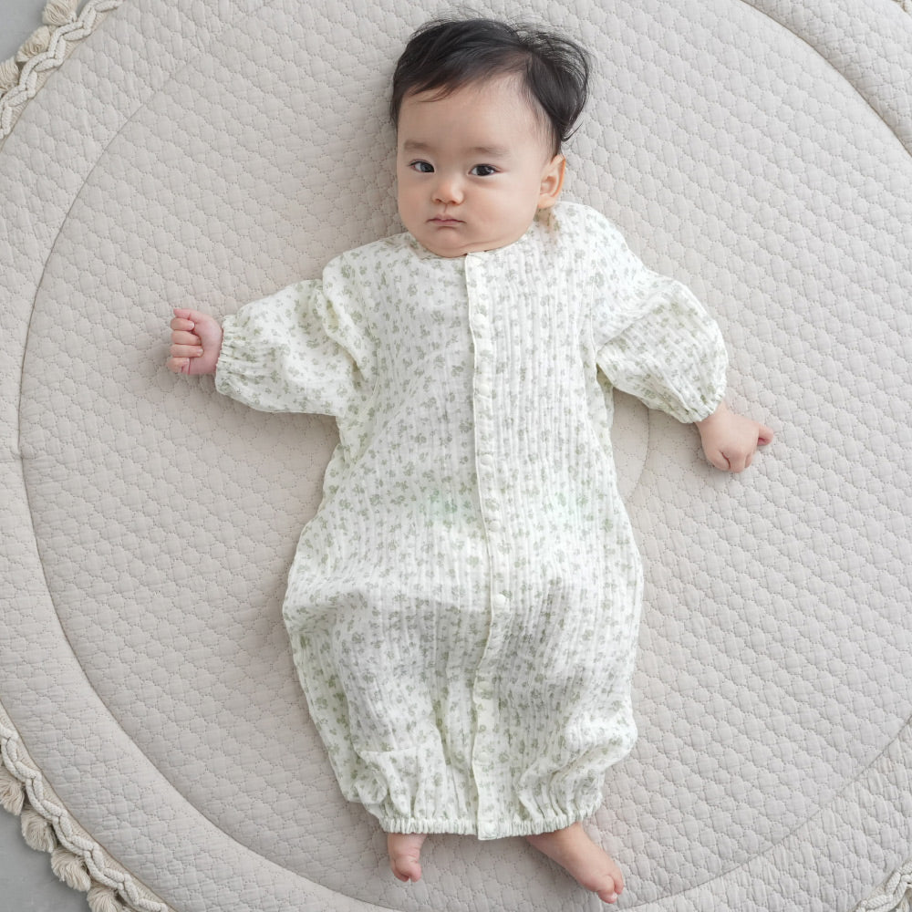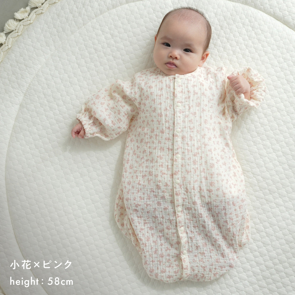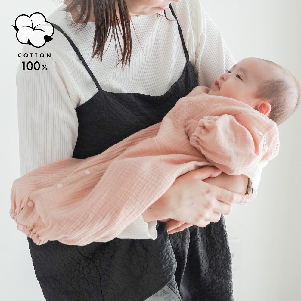 洗う度に風合いが増すふわっとやわらかコットン100%のしわ感がおしゃれなダブルガーゼカバーオール。通気の良さや汗をかいても乾きやすいなどの特長があり春・夏・秋・冬、長いシーズンお使いいただけます。