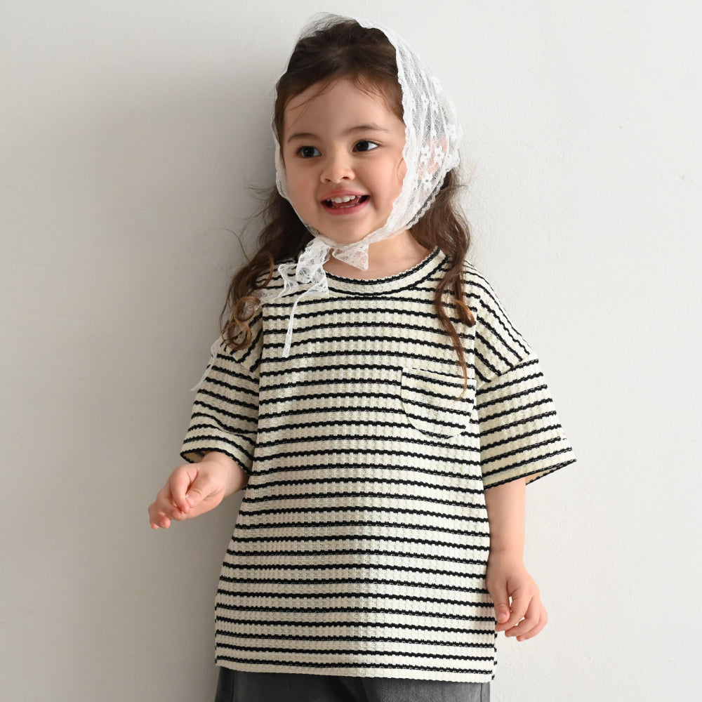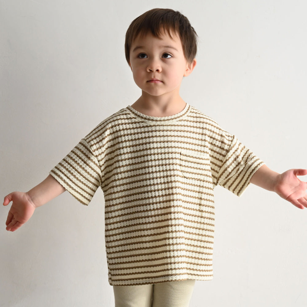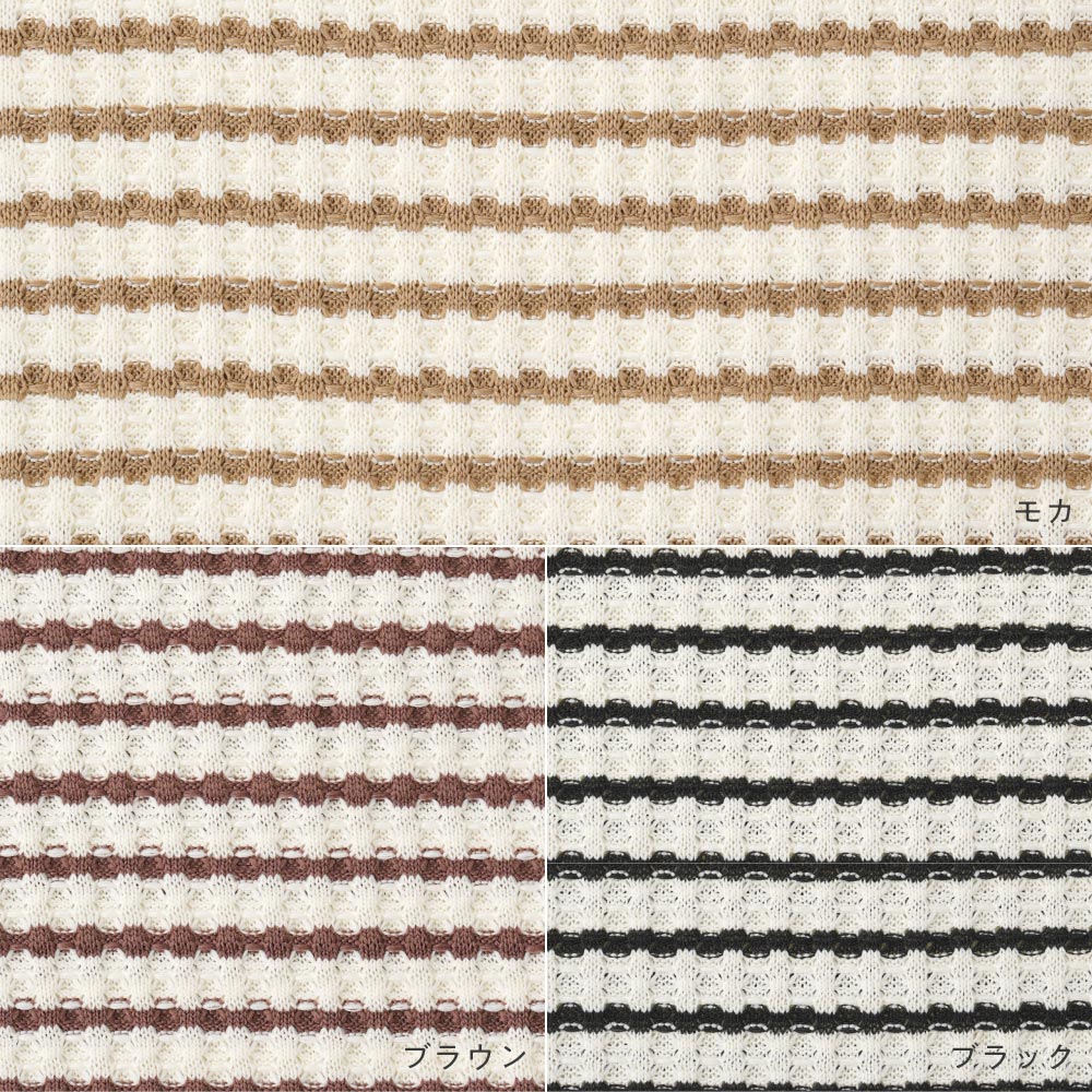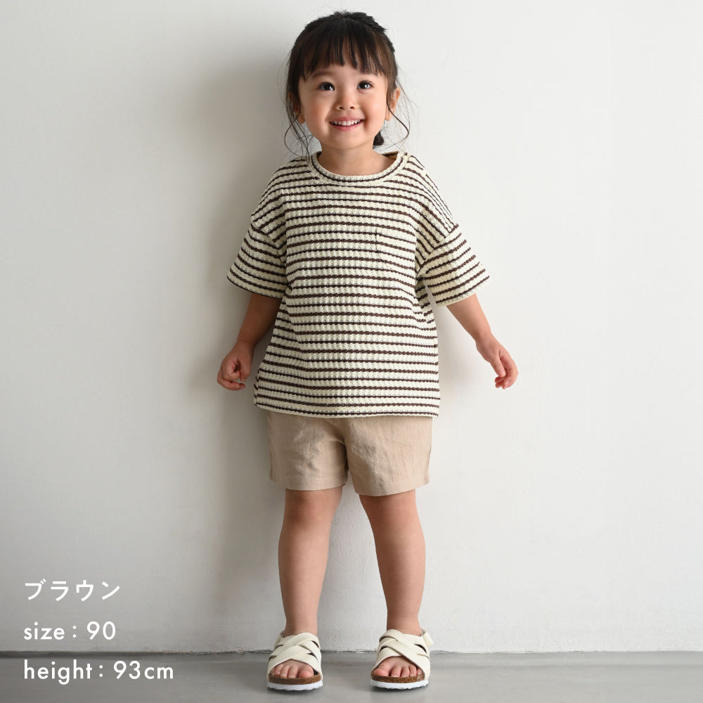 伸縮性のある夏にぴったりな涼し気ざっくりワッフル素材で、さらっと軽く、ゴワゴワしないやわらかな肌触り。ベビー服・キッズ服として程よい厚さで、長いシーズンお使いいただけます。