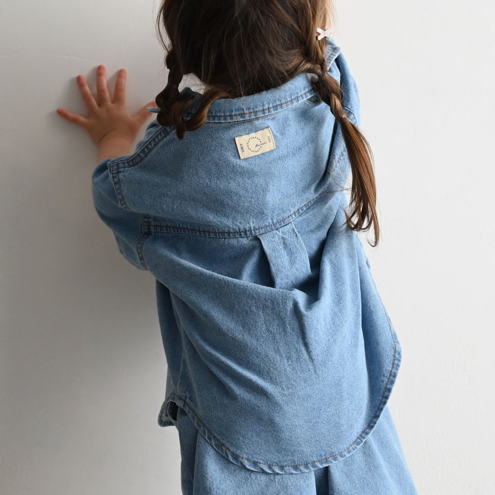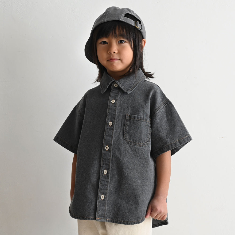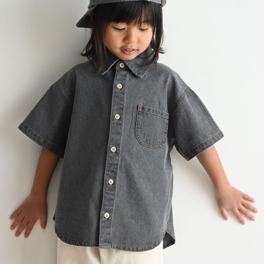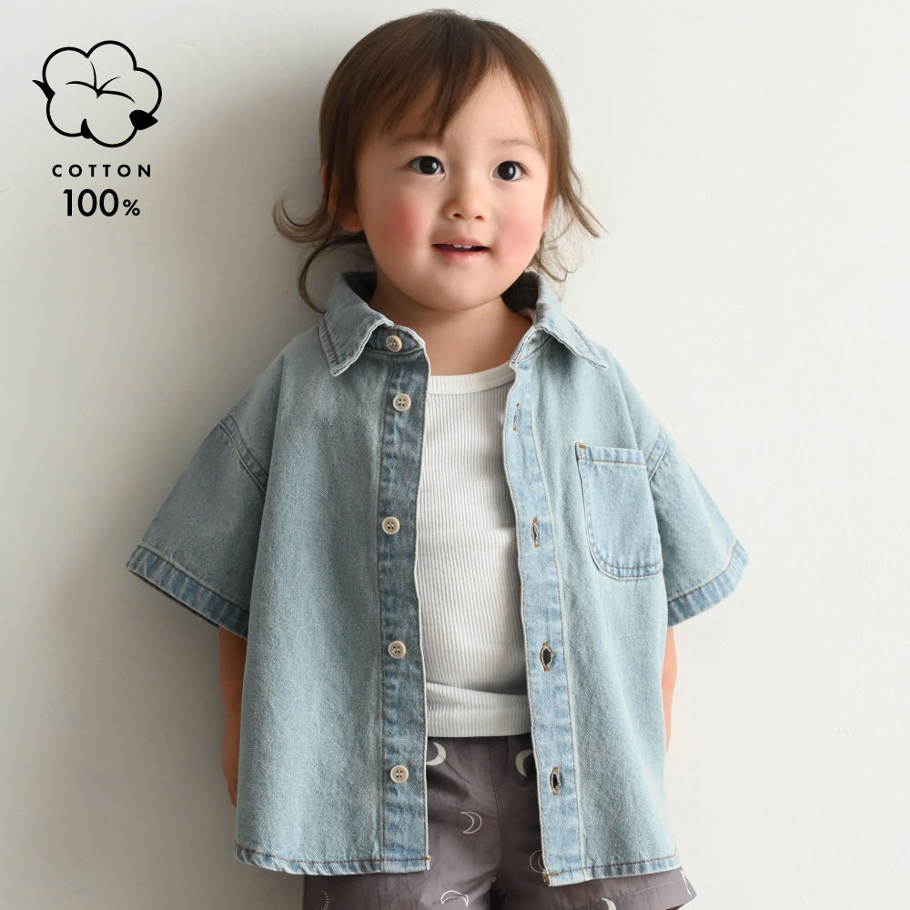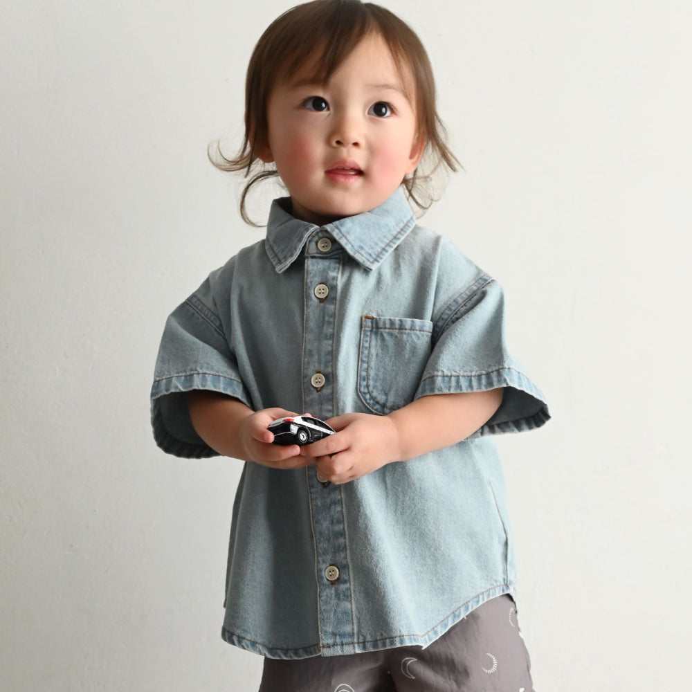 子供服なのに本格的なステンカラーデザインのデニムシャツは着た時のシルエットにこだわりました。ゆったりシルエット+背中のタックでこなれ感も◎