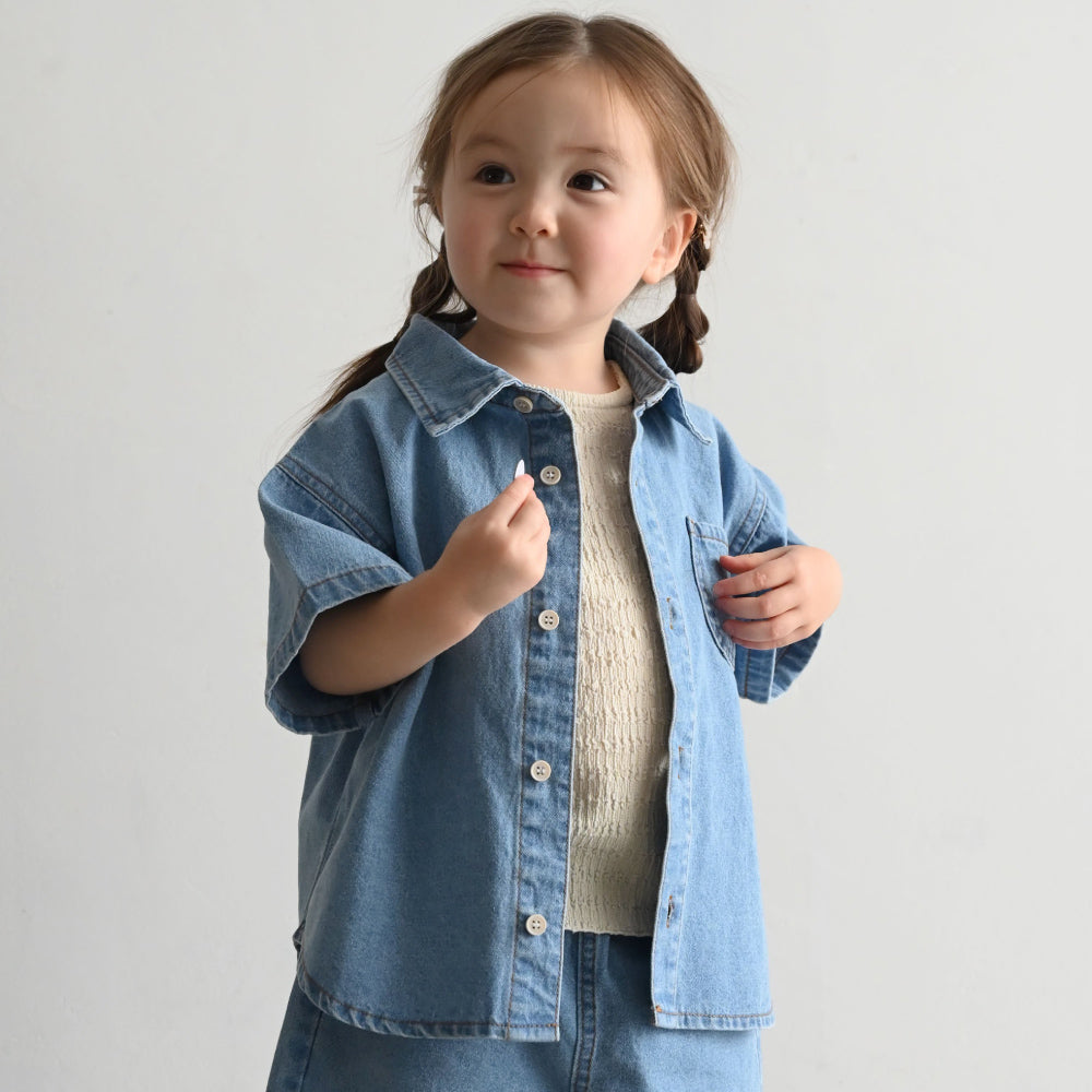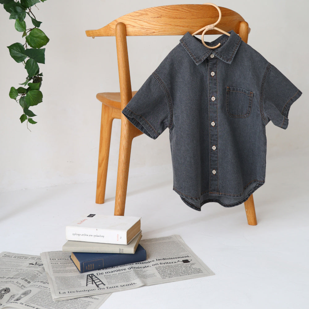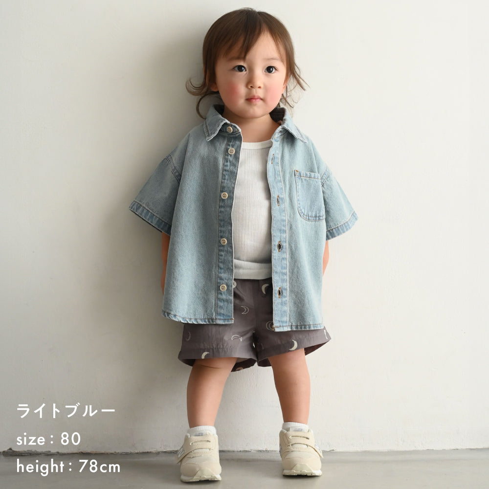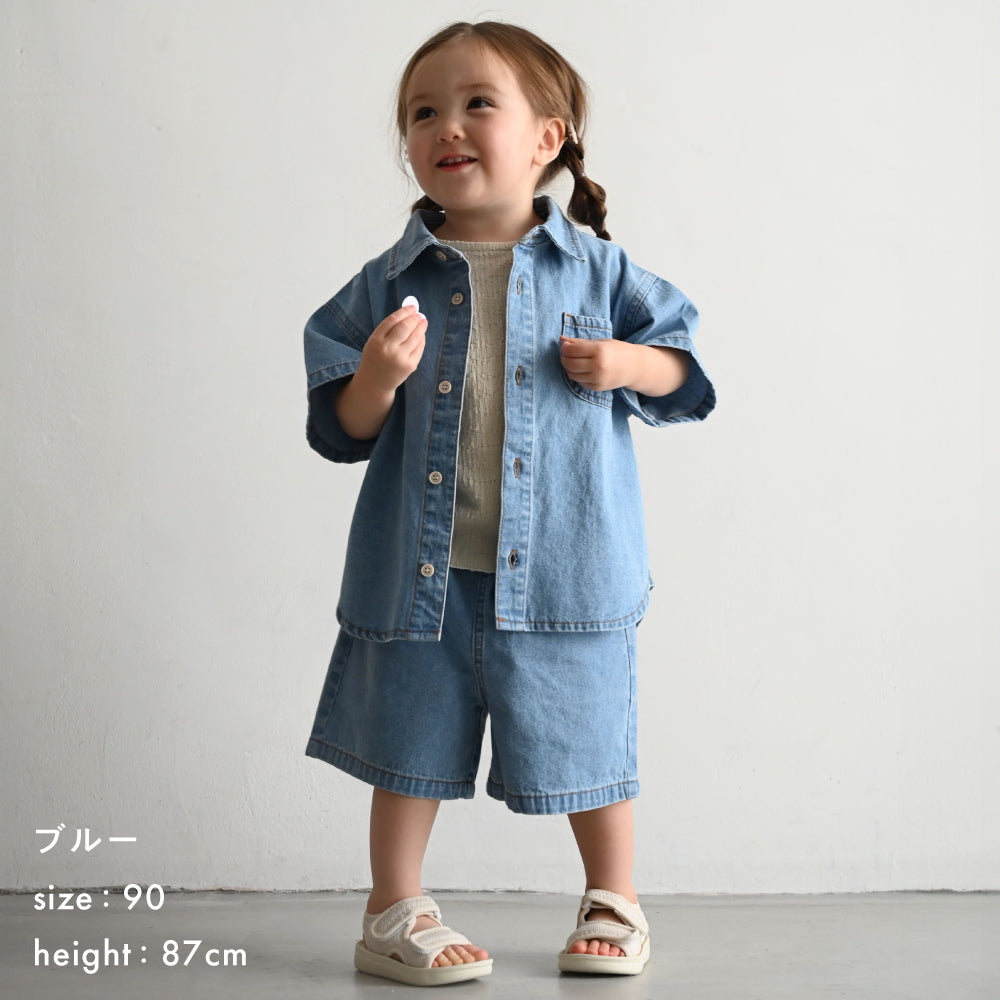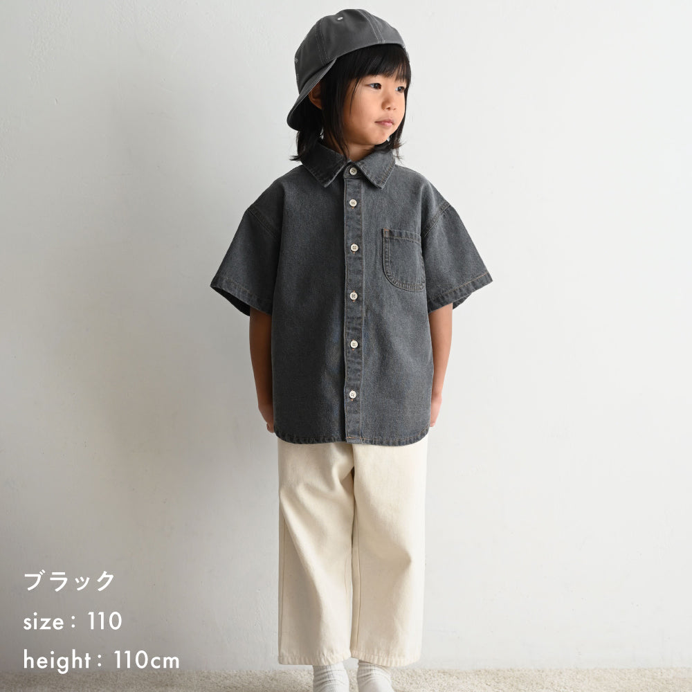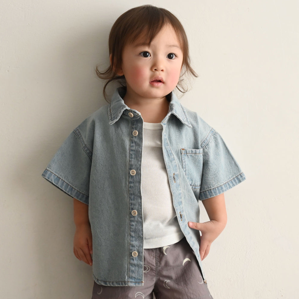 子供服なのに本格的なステンカラーデザインのデニムシャツは着た時のシルエットにこだわりました。ゆったりシルエット+背中のタックでこなれ感も◎