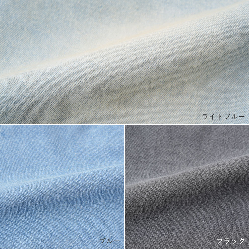 嬉しいコットン100%のデニム素材で、ヴィンデージ風の色落ち加工がおしゃれ。着心地や動きやすさにもこだわり、やわらかく厚すぎないオールシーズン向けのデニムを使用。(1点ずつ加工しているため、製品ごとに色に個体差があります。)