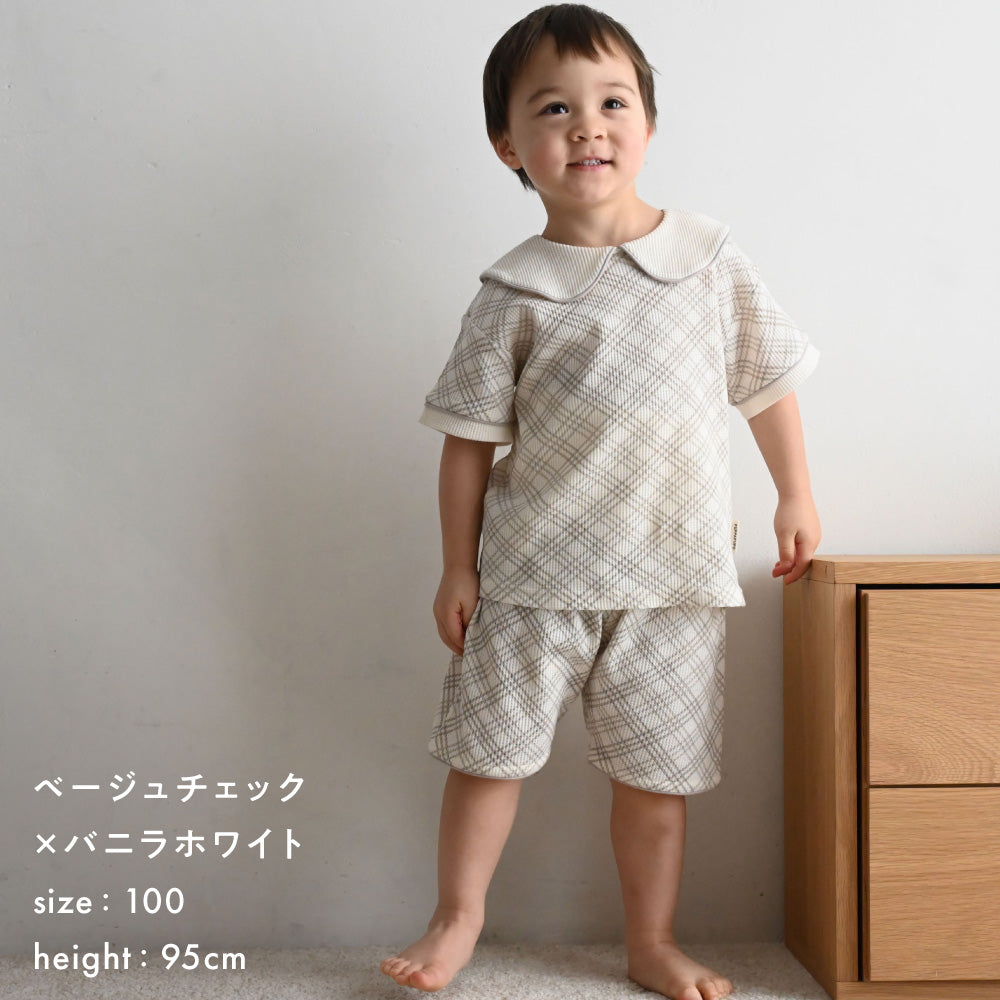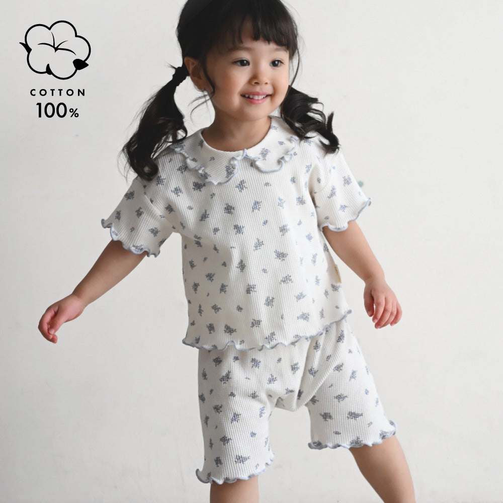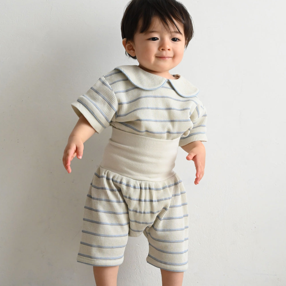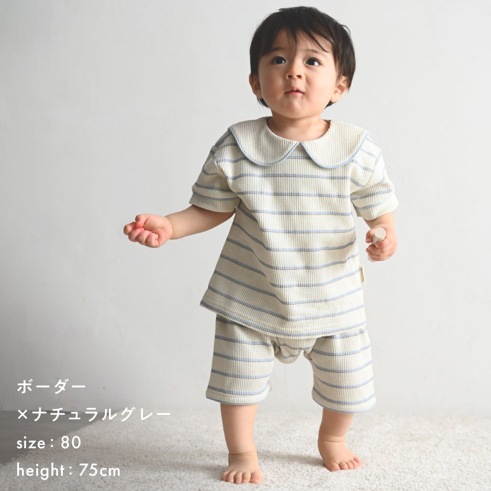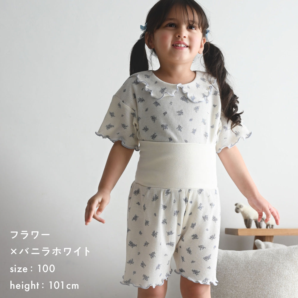 肌触りの良いワッフル生地を使用した、おしゃれな襟付き半袖ベビー&キッズの子供用パジャマ。腹巻タイプのズボンは寝冷え対策にも。首元ゴムでボタン不使用のためお着替えしやすいです。やさしくかわいらしいデザインと着心地の良さで、涼しい春先から暑い夏、秋口まで長く着ることができ、エアコンの効いた室内でも、やさしく包み込んでくれます。