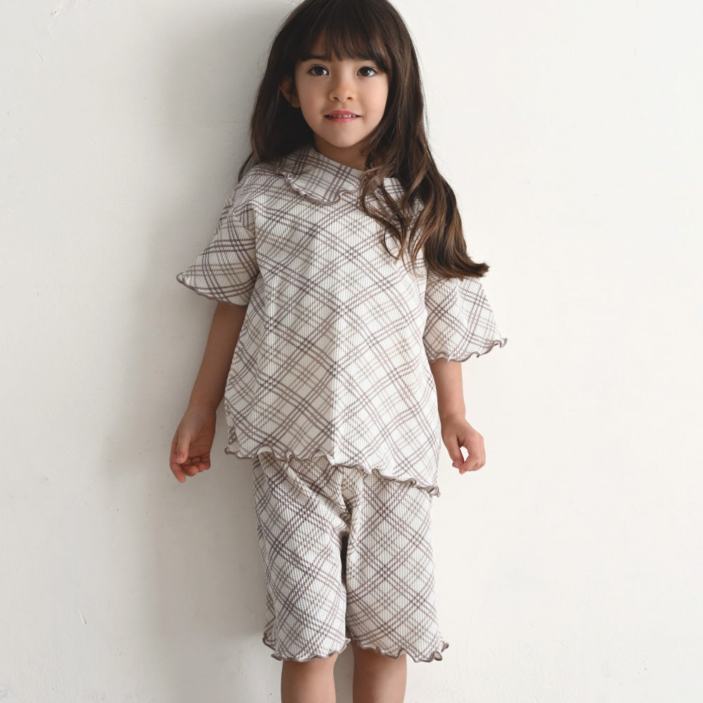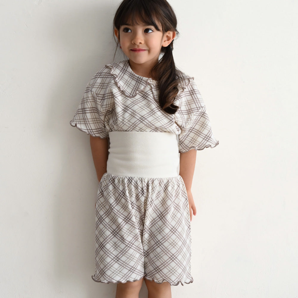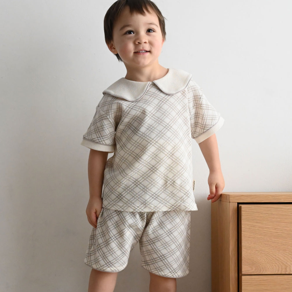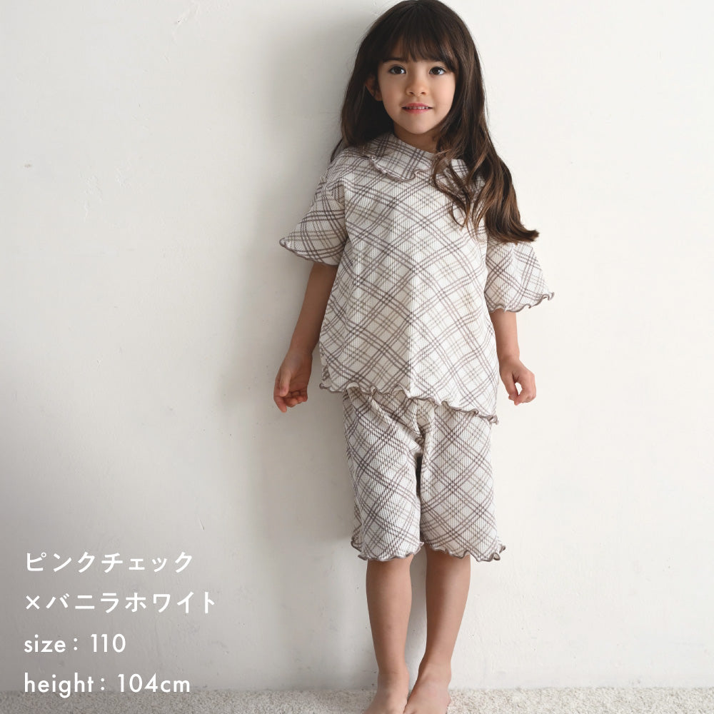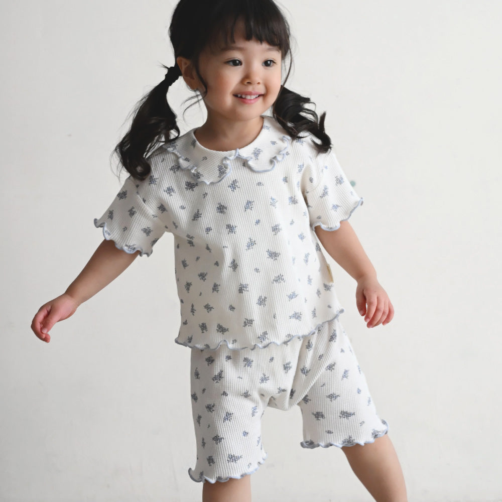 肌触りの良いワッフル生地を使用した、おしゃれな襟付き半袖ベビー&キッズの子供用パジャマ。腹巻タイプのズボンは寝冷え対策にも。首元ゴムでボタン不使用のためお着替えしやすいです。やさしくかわいらしいデザインと着心地の良さで、涼しい春先から暑い夏、秋口まで長く着ることができ、エアコンの効いた室内でも、やさしく包み込んでくれます。