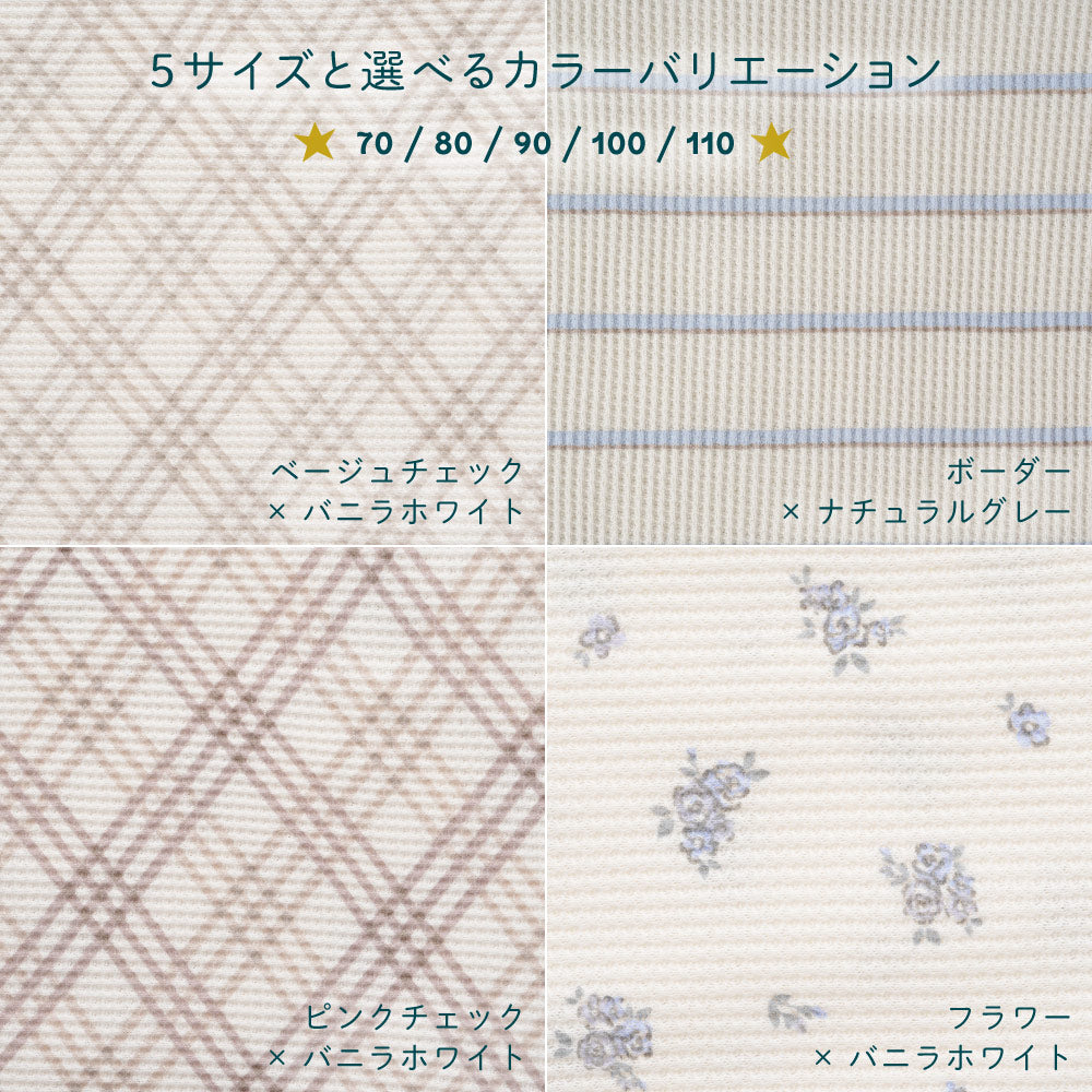 かわいらしいピンクチェックとフラワーの2柄は袖口・裾・足口柔らかメロー始末。シック系にスッキリなら、ベージュチェックとボーダー。男の子も女の子もそれぞれお好みに合わせて少しデザインの異なる仕上がりに。