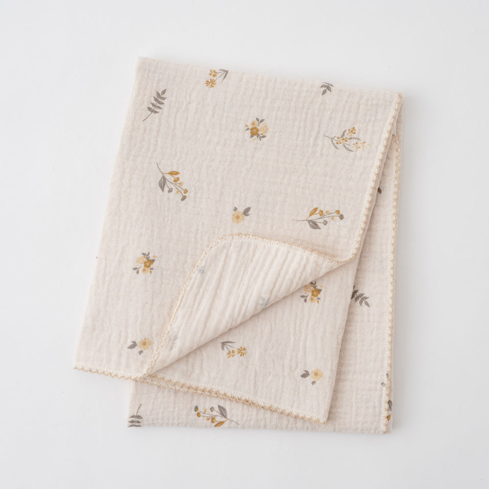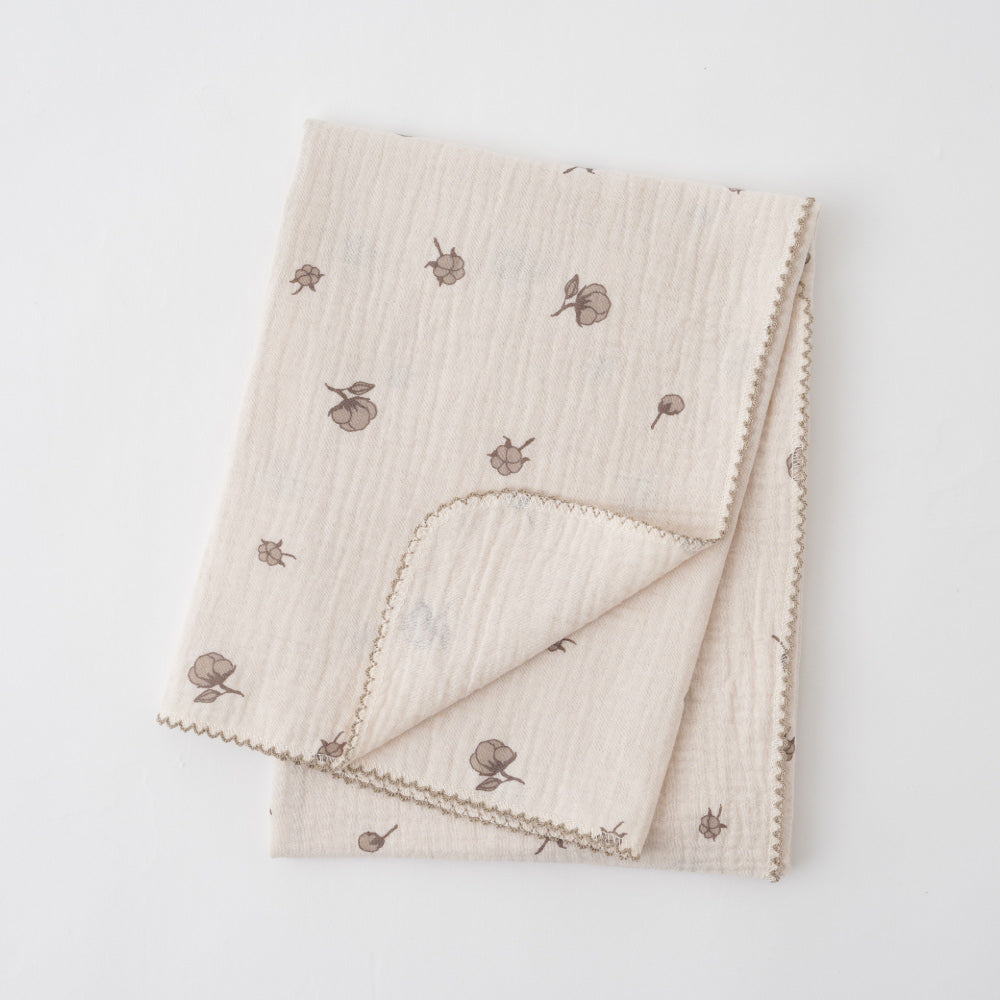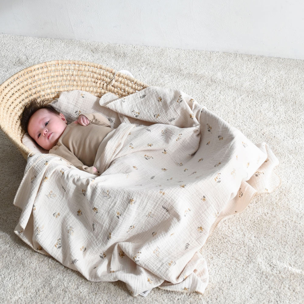 出産準備の人気の定番アイテム、見た目もかわいい綿100%の2重ガーゼブランケット。しわ感のある生地にナチュラルでどこかクラッシックなボタニカル柄や北欧風なデザインがとてもおしゃれなんです。洗う度に風合いが増すふわっとやわらか綿100%のダブルガーゼ。春~秋にかけて使える涼しい季節にピッタリの薄さです。