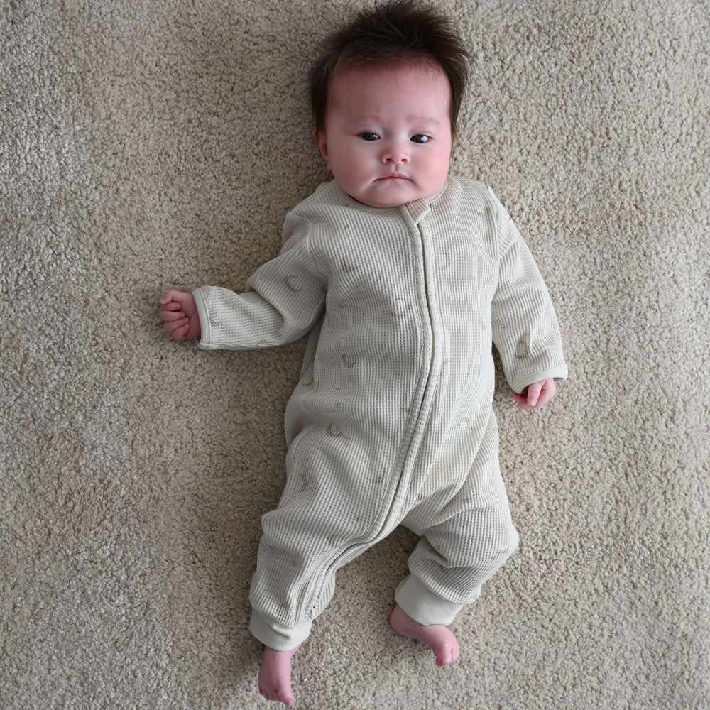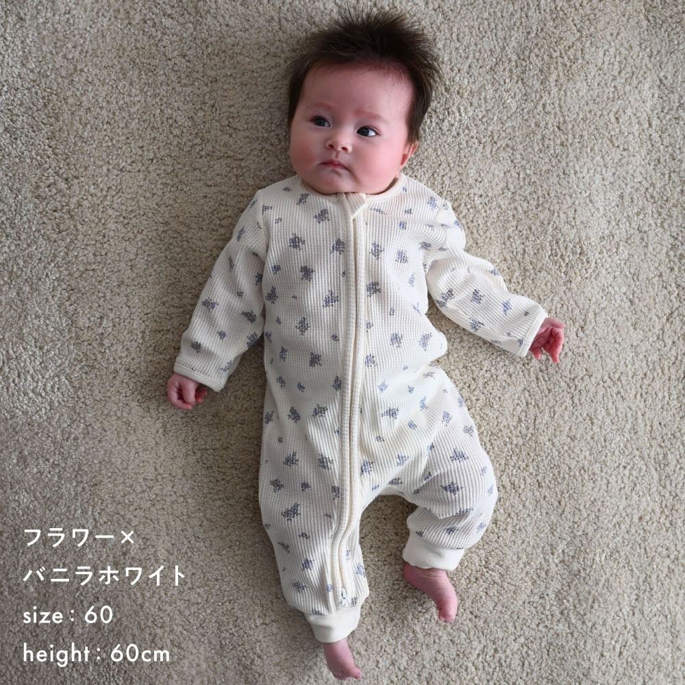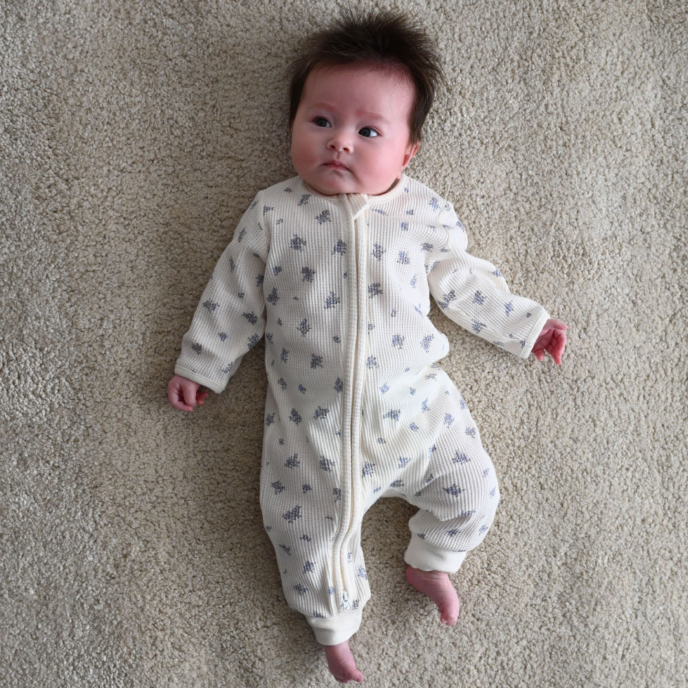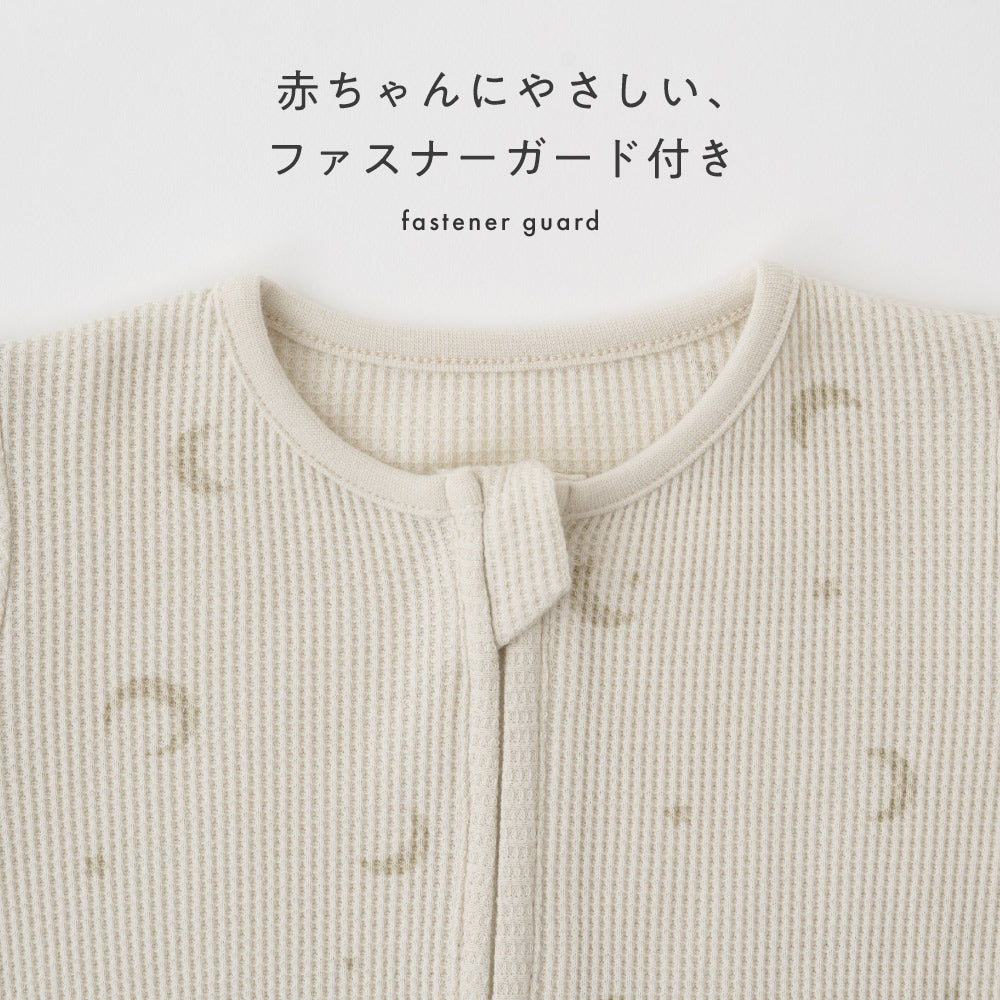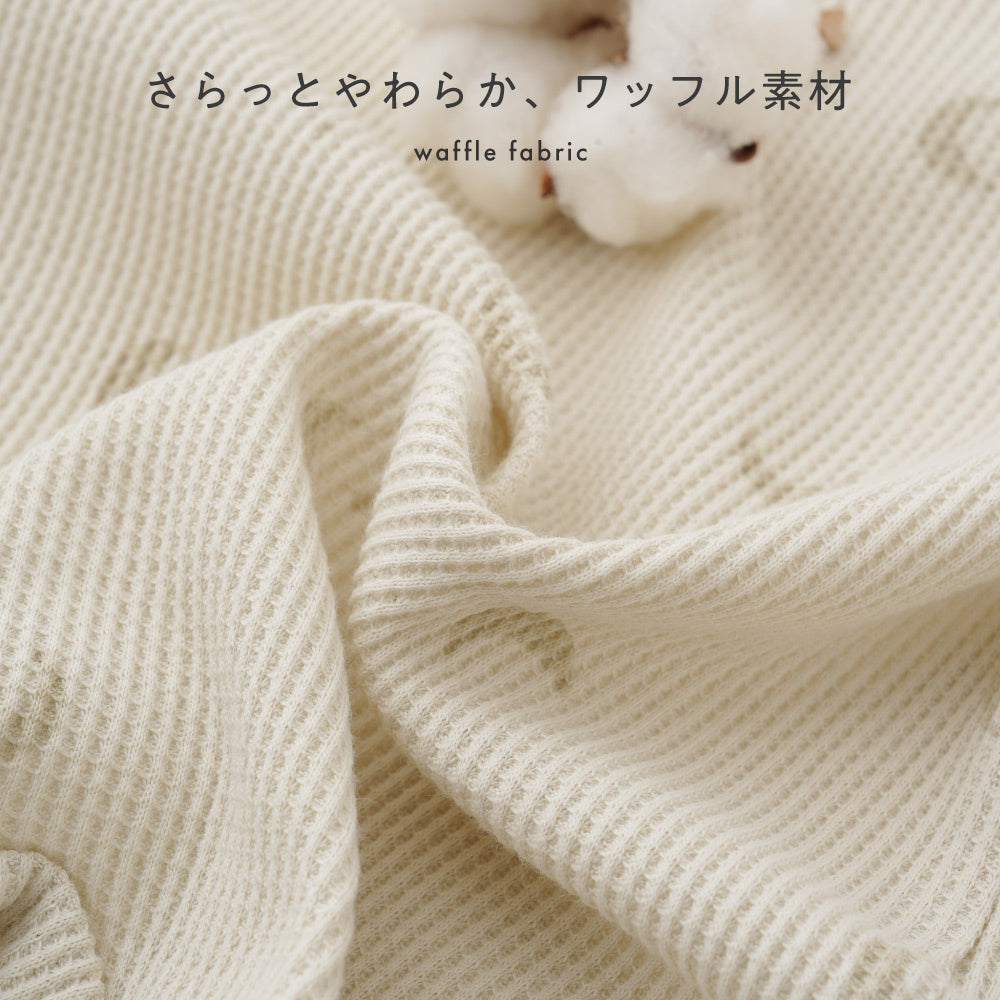 伸縮性のあるワッフル素材で、さらっと軽く、ゴワゴワしないやわらかな肌触り。柄プリントは綿100%。※ボーダーは綿100%ではありません。こちらの製品は柄によって組成が異なります。ベビー服・キッズ服として程よい厚さで、長いシーズンお使いいただけます。