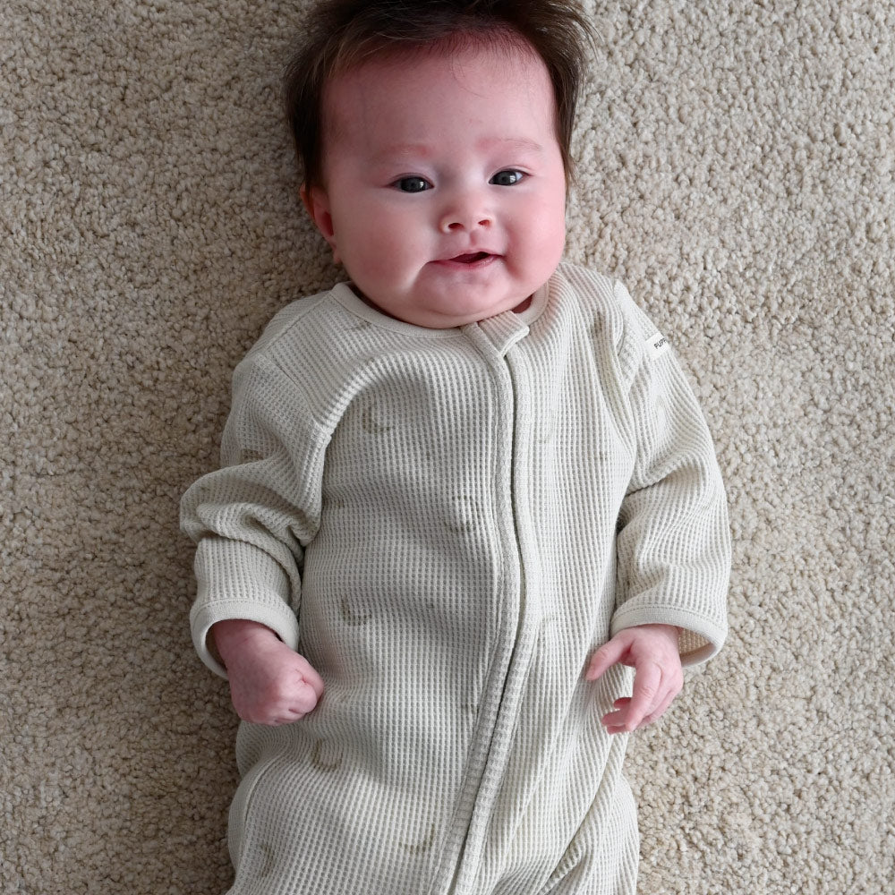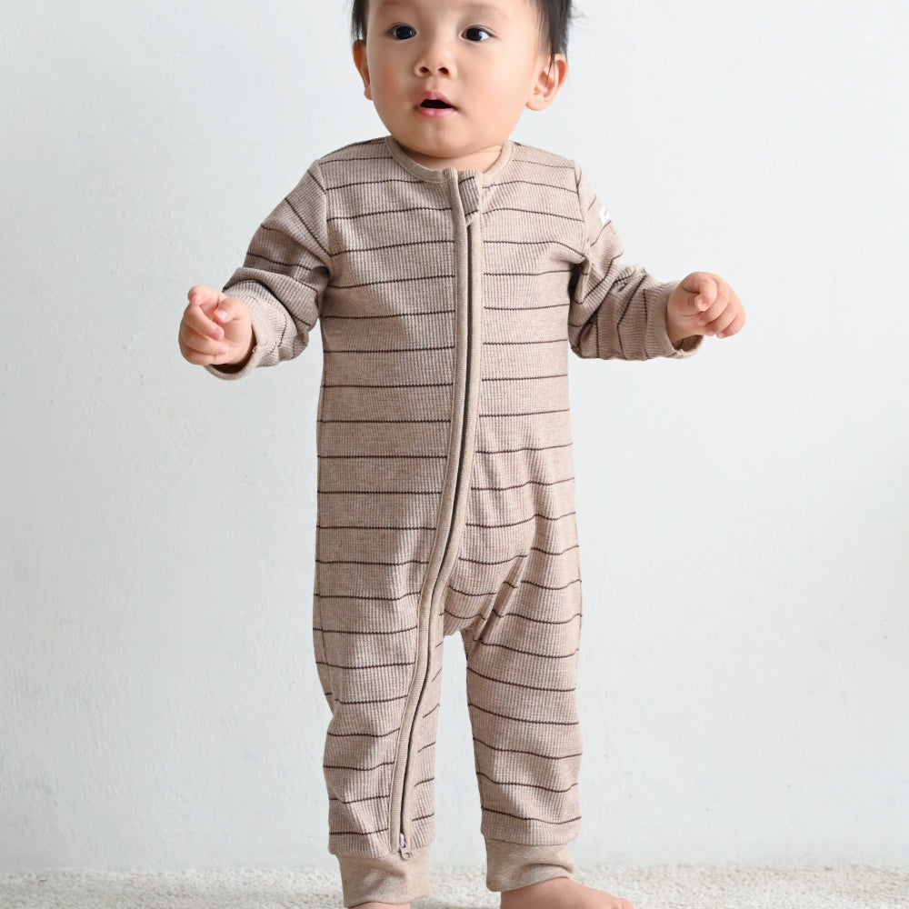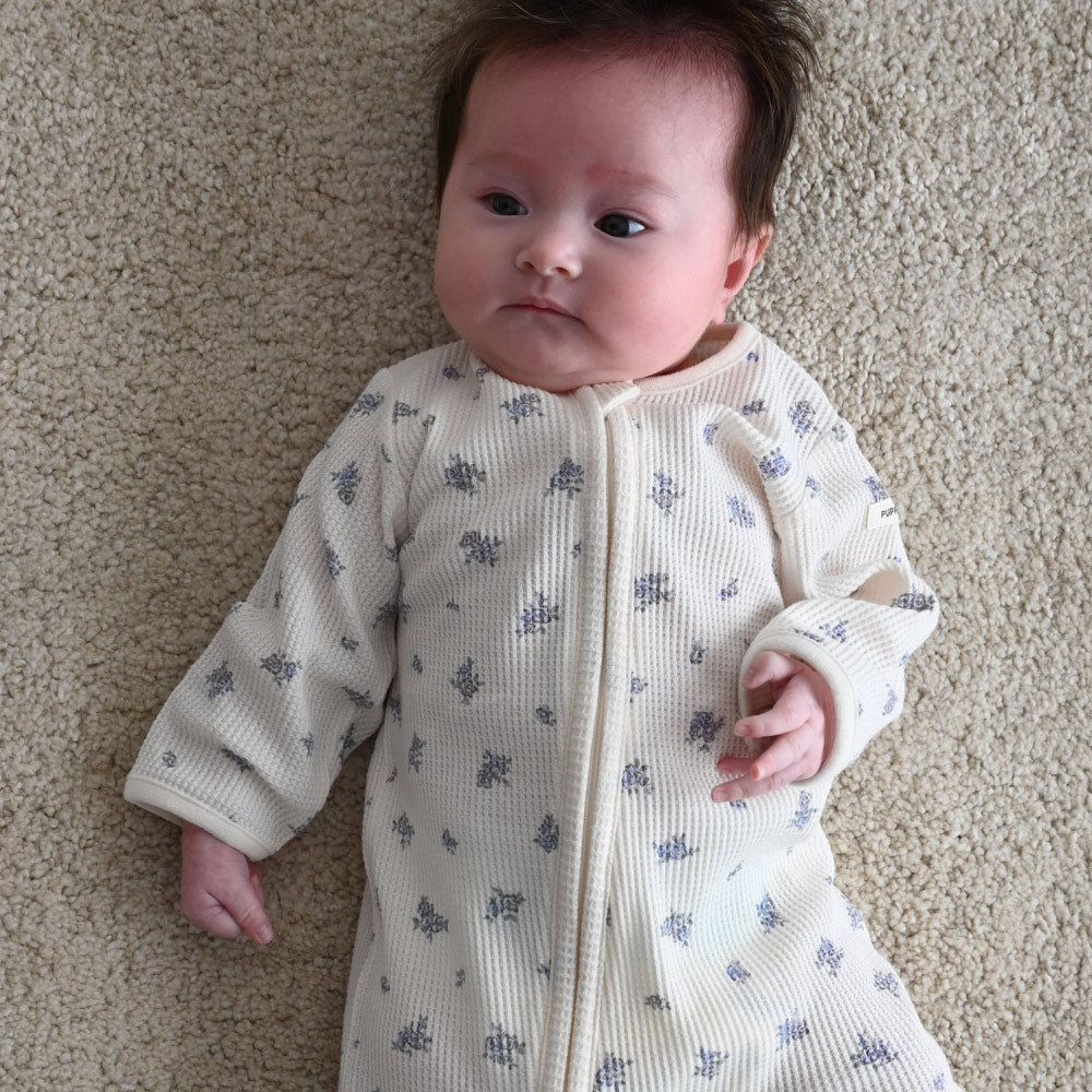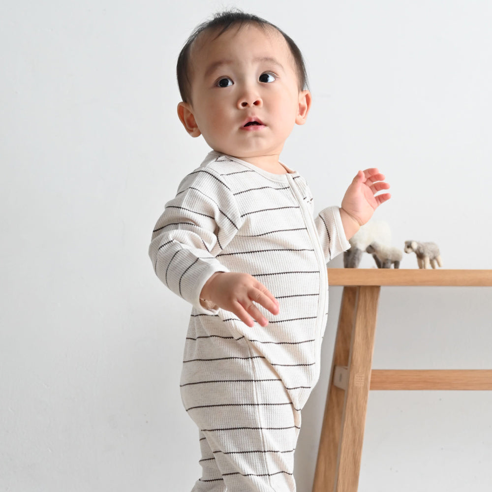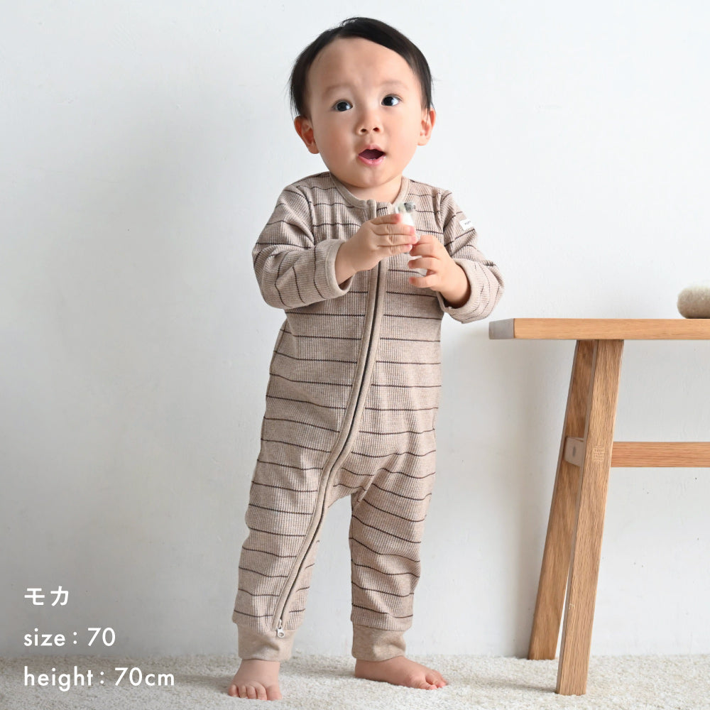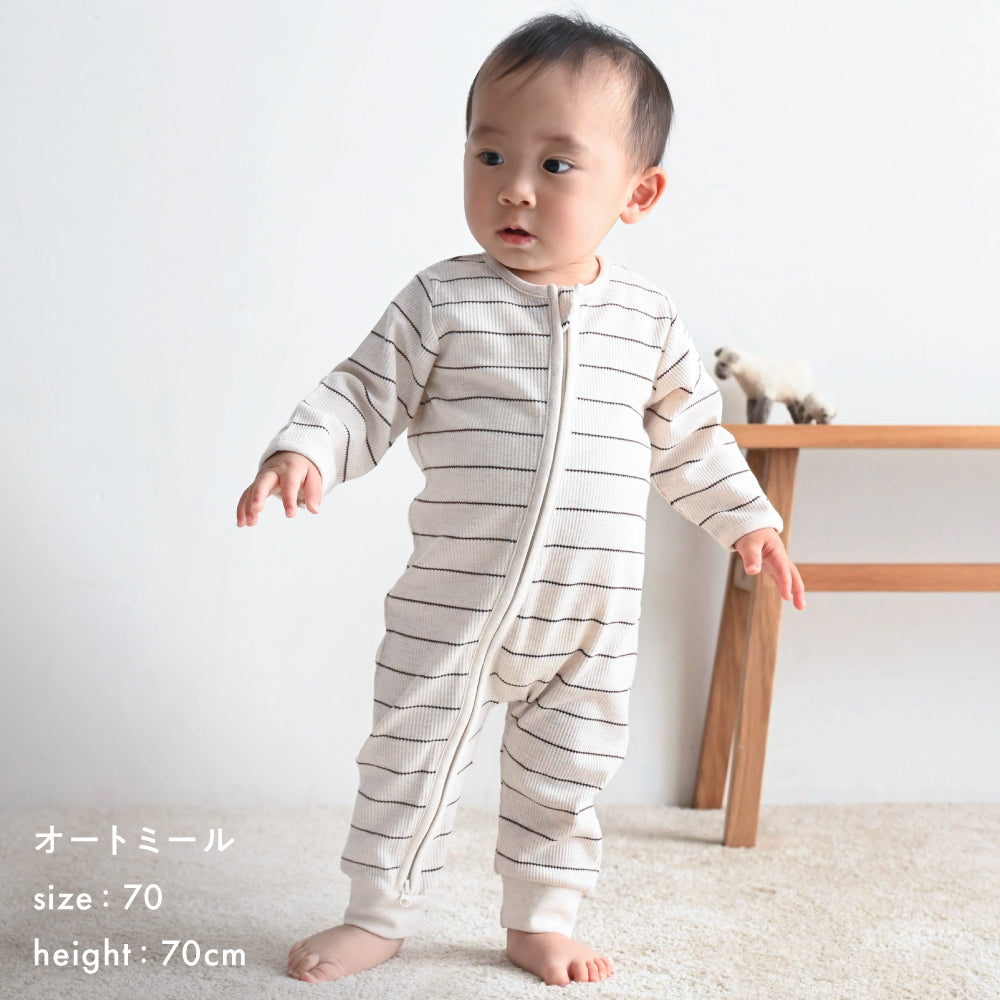伸縮性のあるワッフル素材で、さらっと軽く、ゴワゴワしないやわらかな肌触り。柄プリントは綿100%。※ボーダーは綿100%ではありません。こちらの製品は柄によって組成が異なります。ベビー服・キッズ服として程よい厚さで、長いシーズンお使いいただけます。