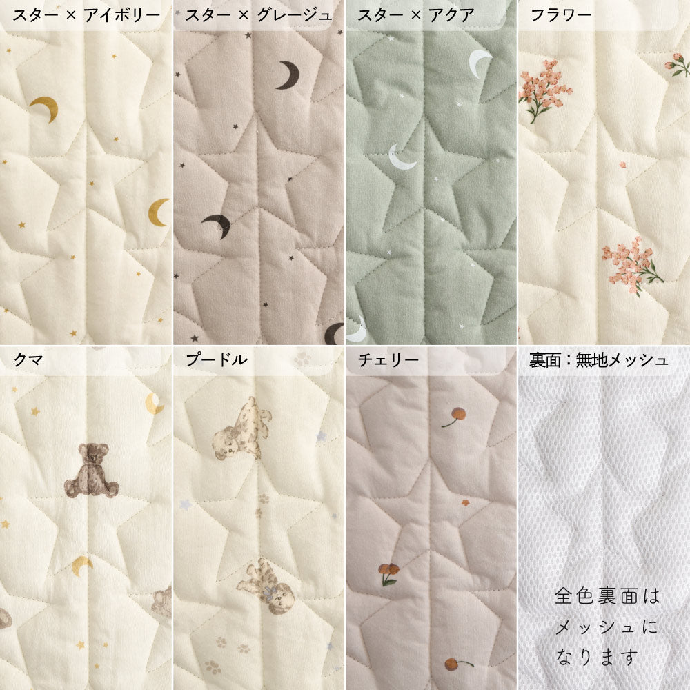 立体感のある中綿入りのふんわりキルティング仕様でたくさん汗をかくお子さまの「汗取りパッド」としての役割も果たします。適度な厚みがあるため、寝心地が柔らかいのが特長です。ふんわりあたたかいのにしっかり通気性もあるので1年中快適にご使用いただけます。キルティング加工をすることで中綿がよれにくく、生地の耐久性もよくなると言われております。