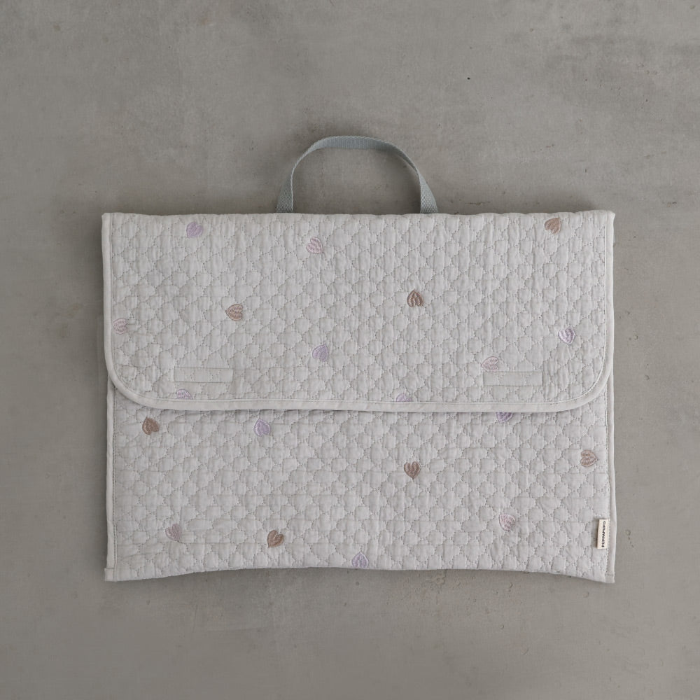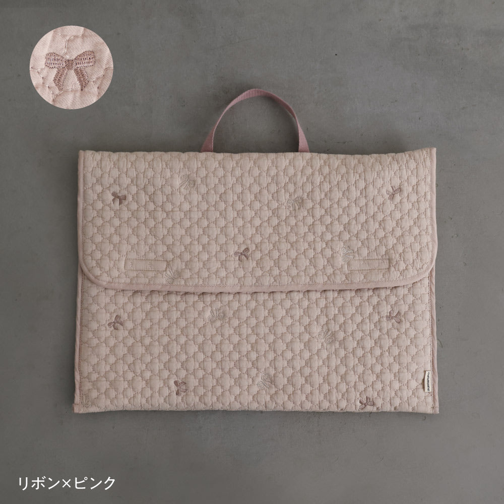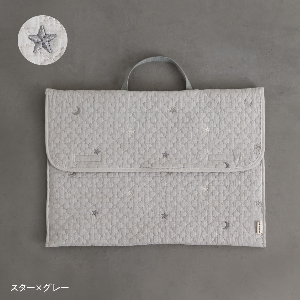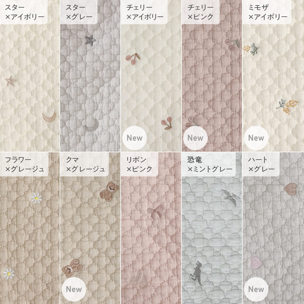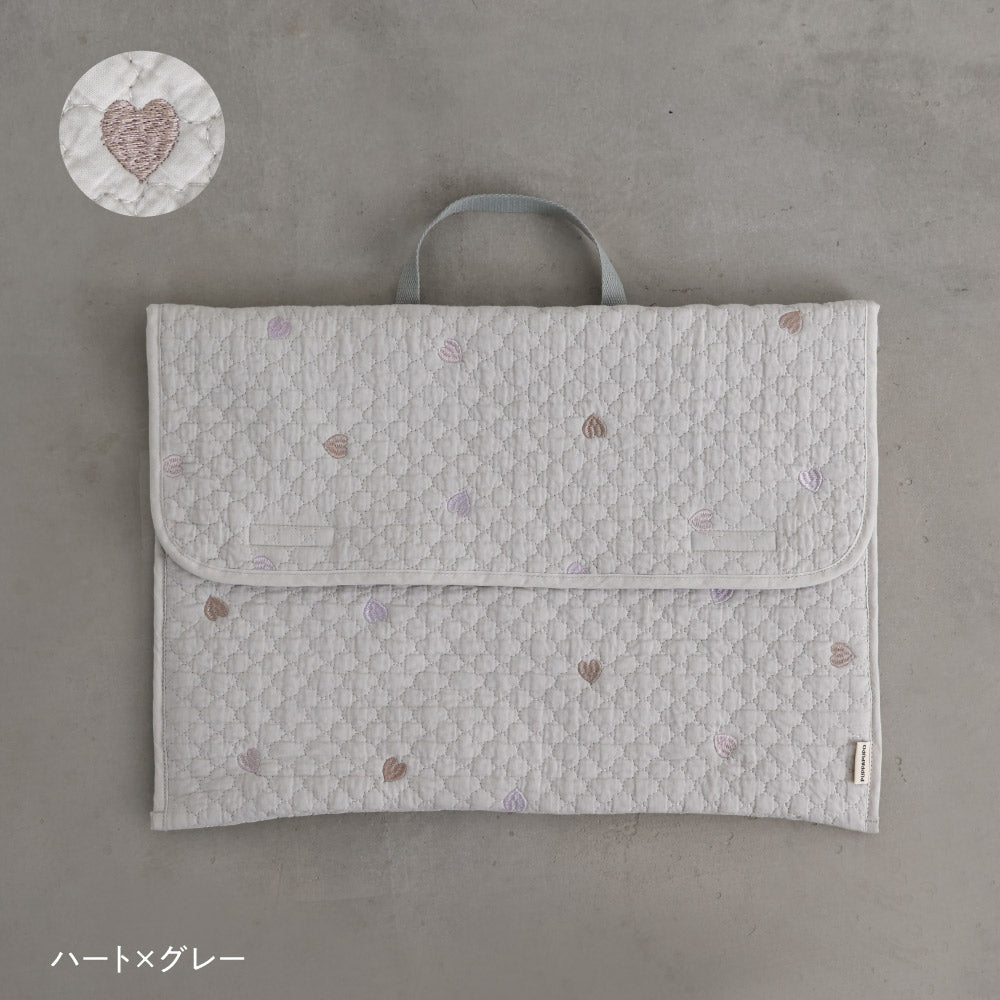 ナチュラルでやさしいくすみカラーのイブルキルトは、ふんわりとした肌触りが心地よく、小ぶりの刺繍がアクセントとなっています。おしゃれで可愛らしいシンプルなデザインは園児から高学年のお子様にも幅広い年齢層で長くお使いいだけるのも魅力です♪