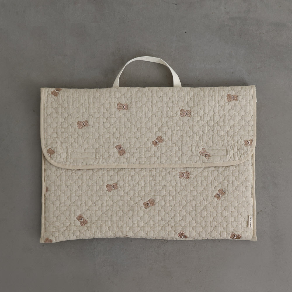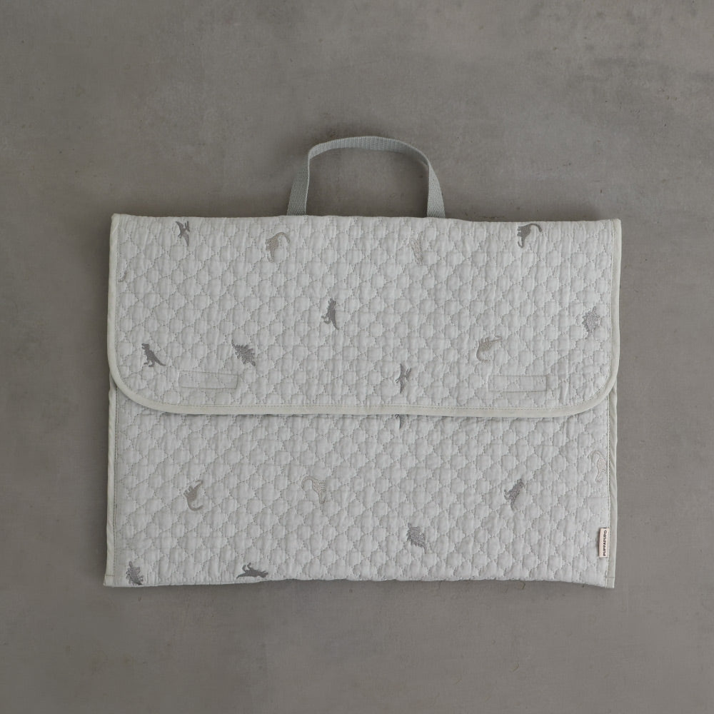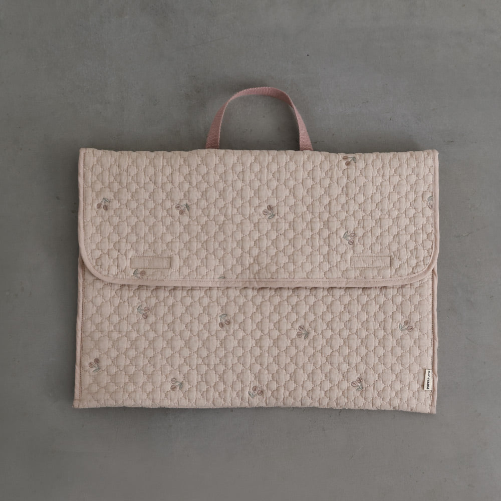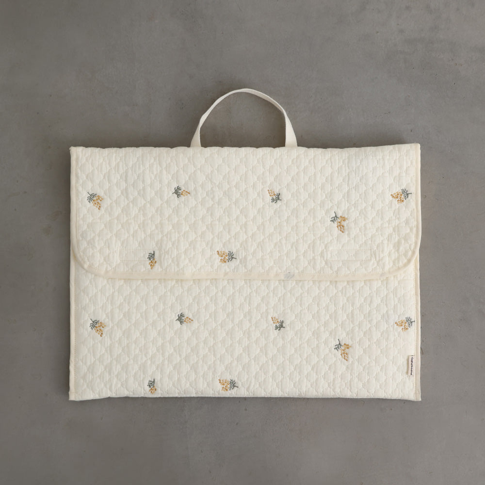 ナチュラルでやさしいくすみカラーのイブルキルトは、ふんわりとした肌触りが心地よく、小ぶりの刺繍がアクセントとなっています。おしゃれで可愛らしいシンプルなデザインは園児から高学年のお子様にも幅広い年齢層で長くお使いいだけるのも魅力です♪