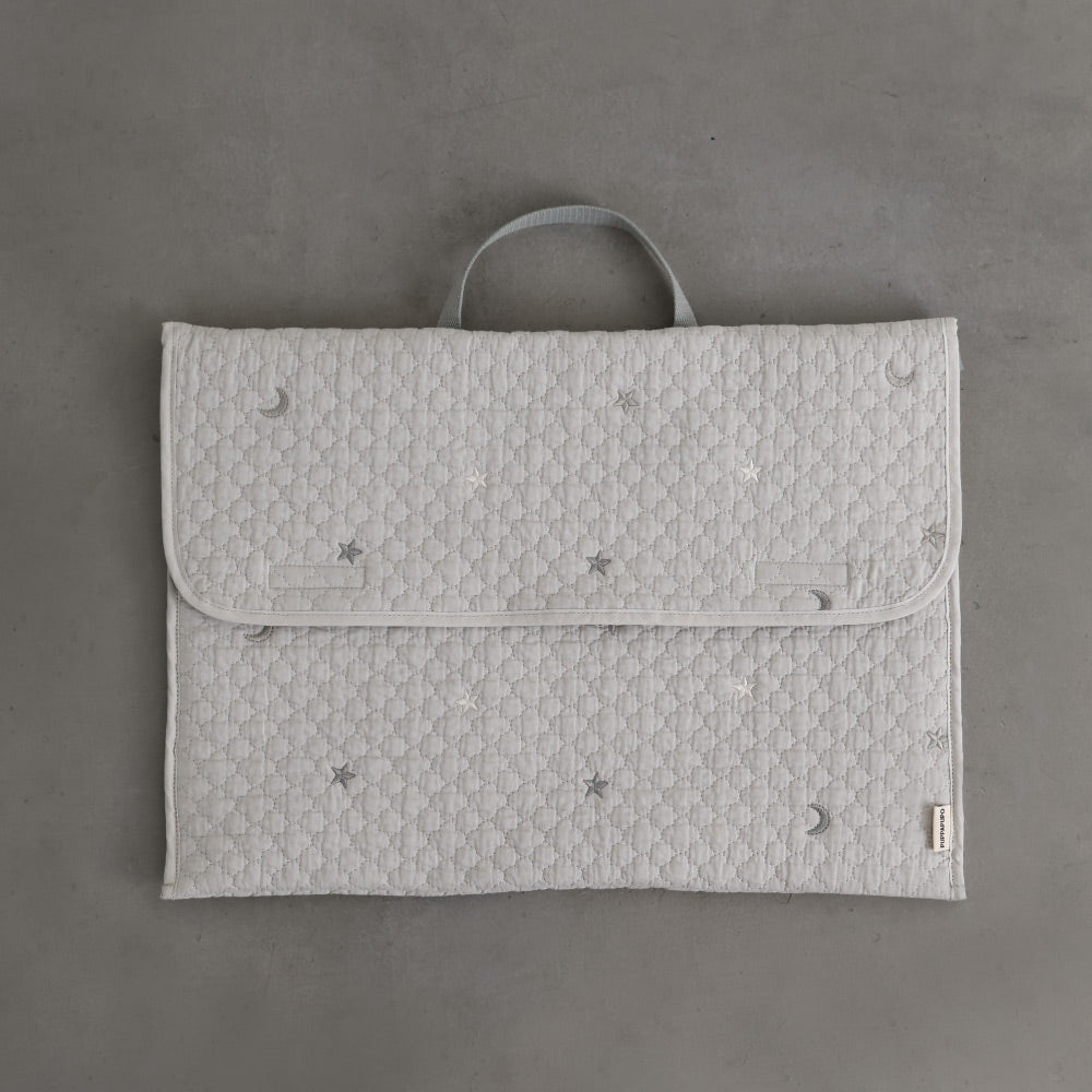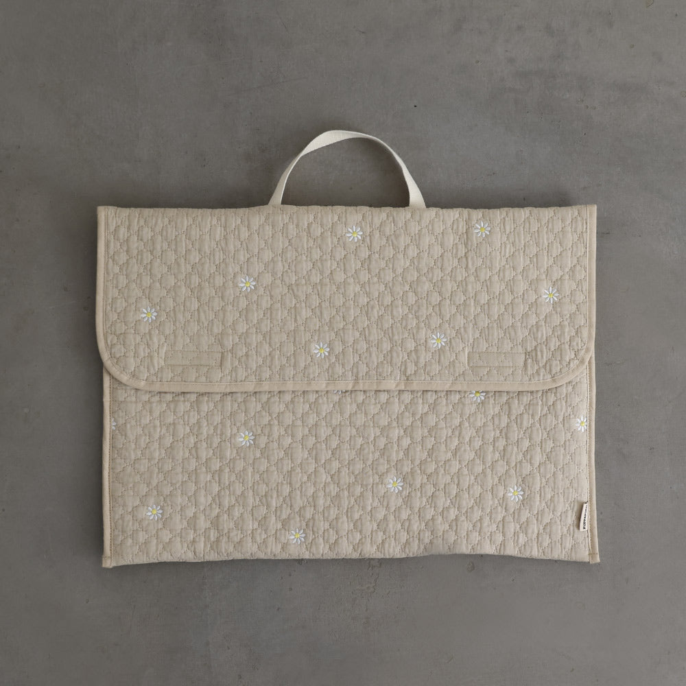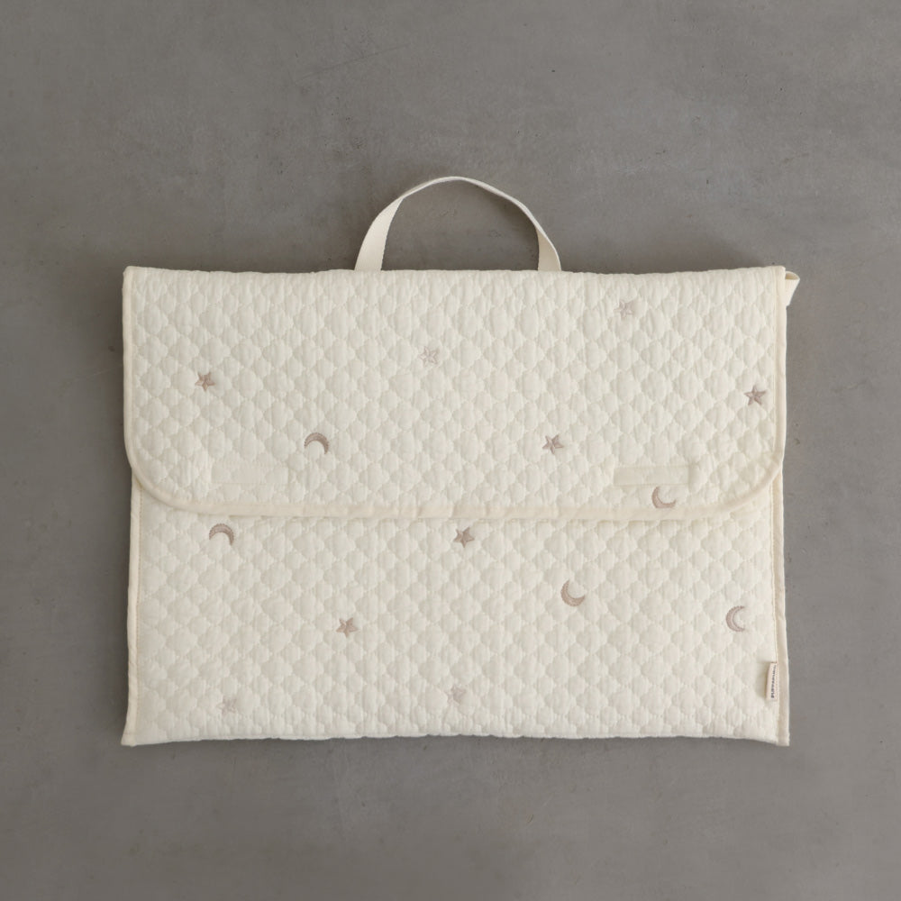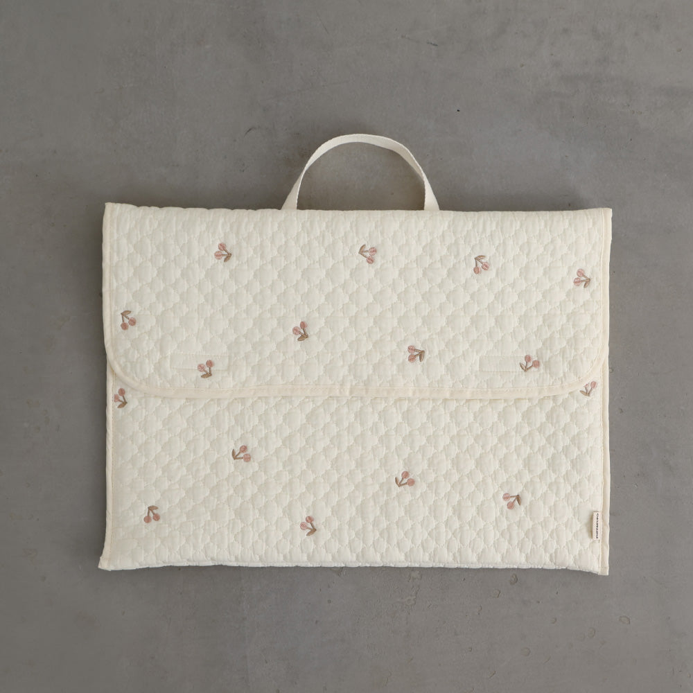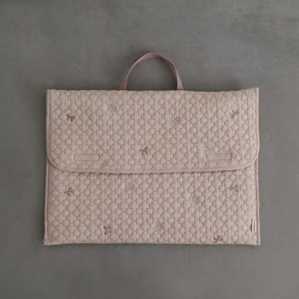 ナチュラルでやさしいくすみカラーのイブルキルトは、ふんわりとした肌触りが心地よく、小ぶりの刺繍がアクセントとなっています。おしゃれで可愛らしいシンプルなデザインは園児から高学年のお子様にも幅広い年齢層で長くお使いいだけるのも魅力です♪