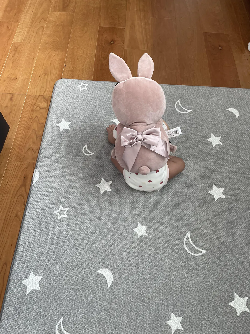 5ヶ月の孫ちゃんのお座り練習用にウサギさんを購入して装着!ユラユラしながら、うしろにコテン…。