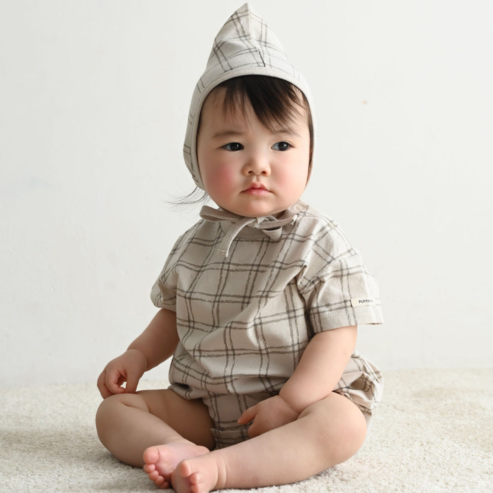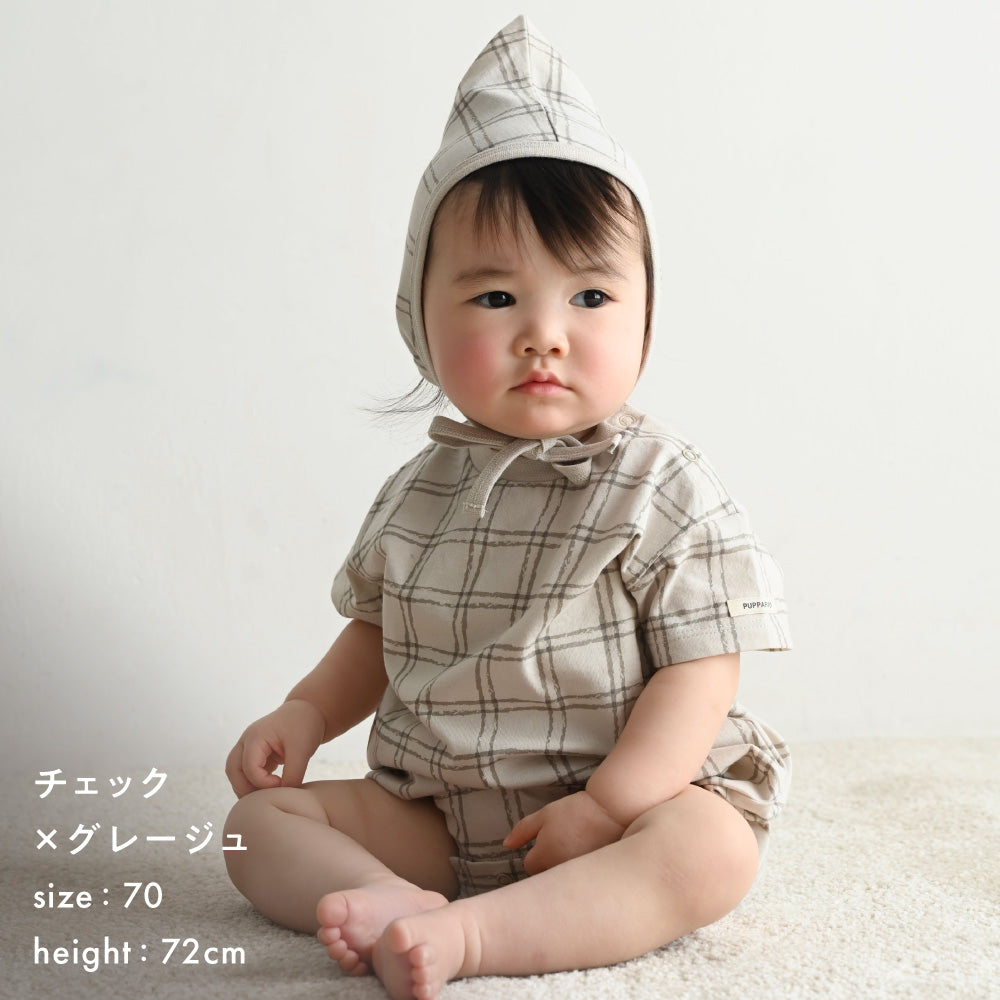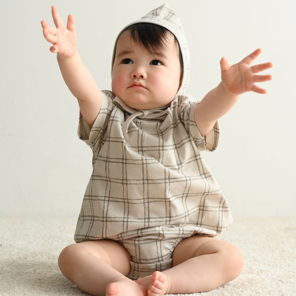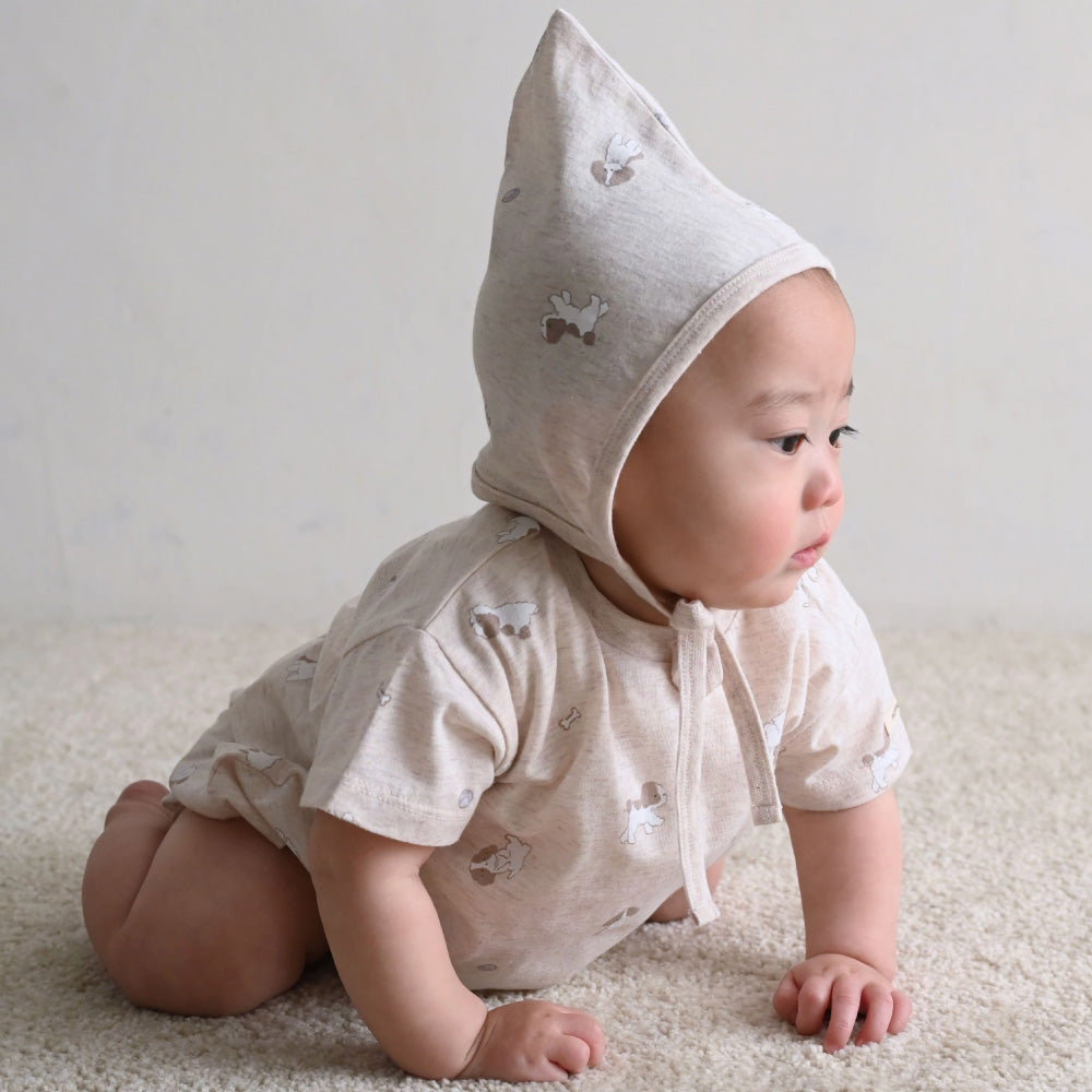 同素材、同デザインのボンネットがセットになったロンパース2点セット。ボンネットはちょっとしたおでかけやおうちフォトにも使えてかわいい。お耳まですっぽり隠れるから、ちょっとした冷房対策にも。