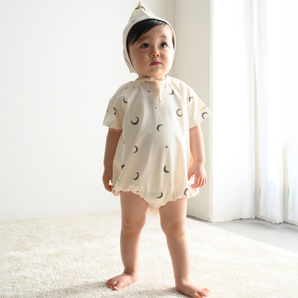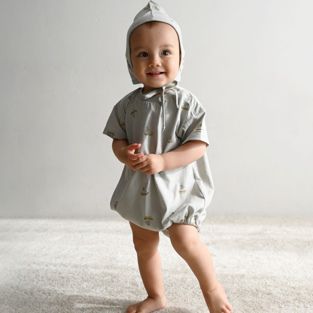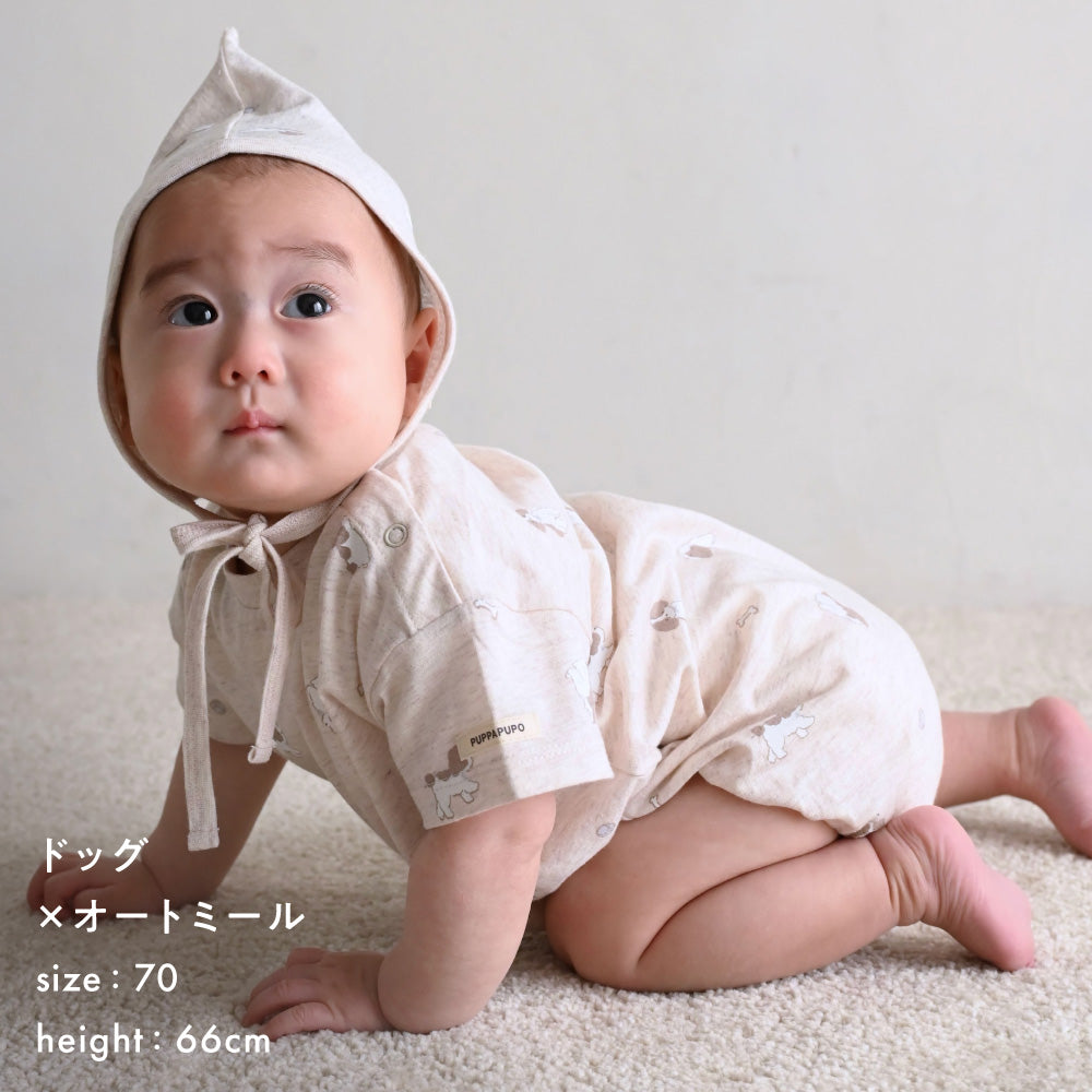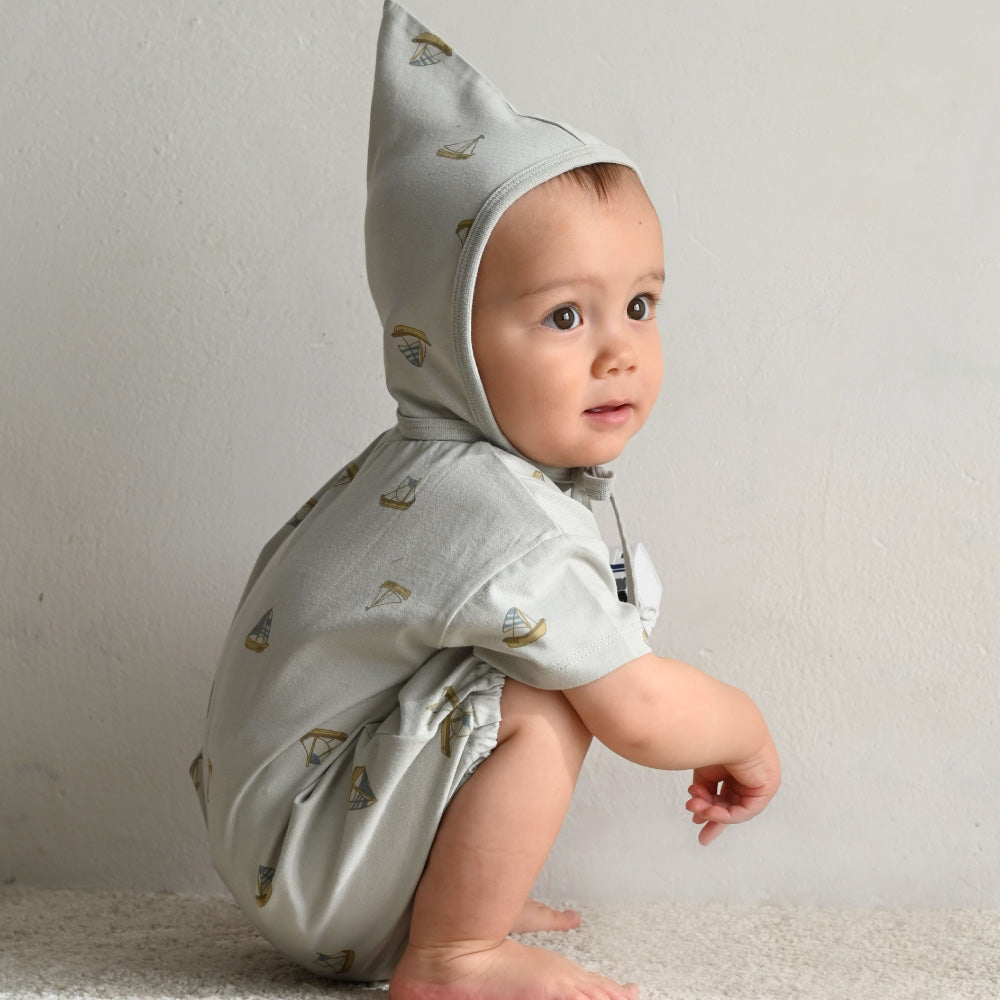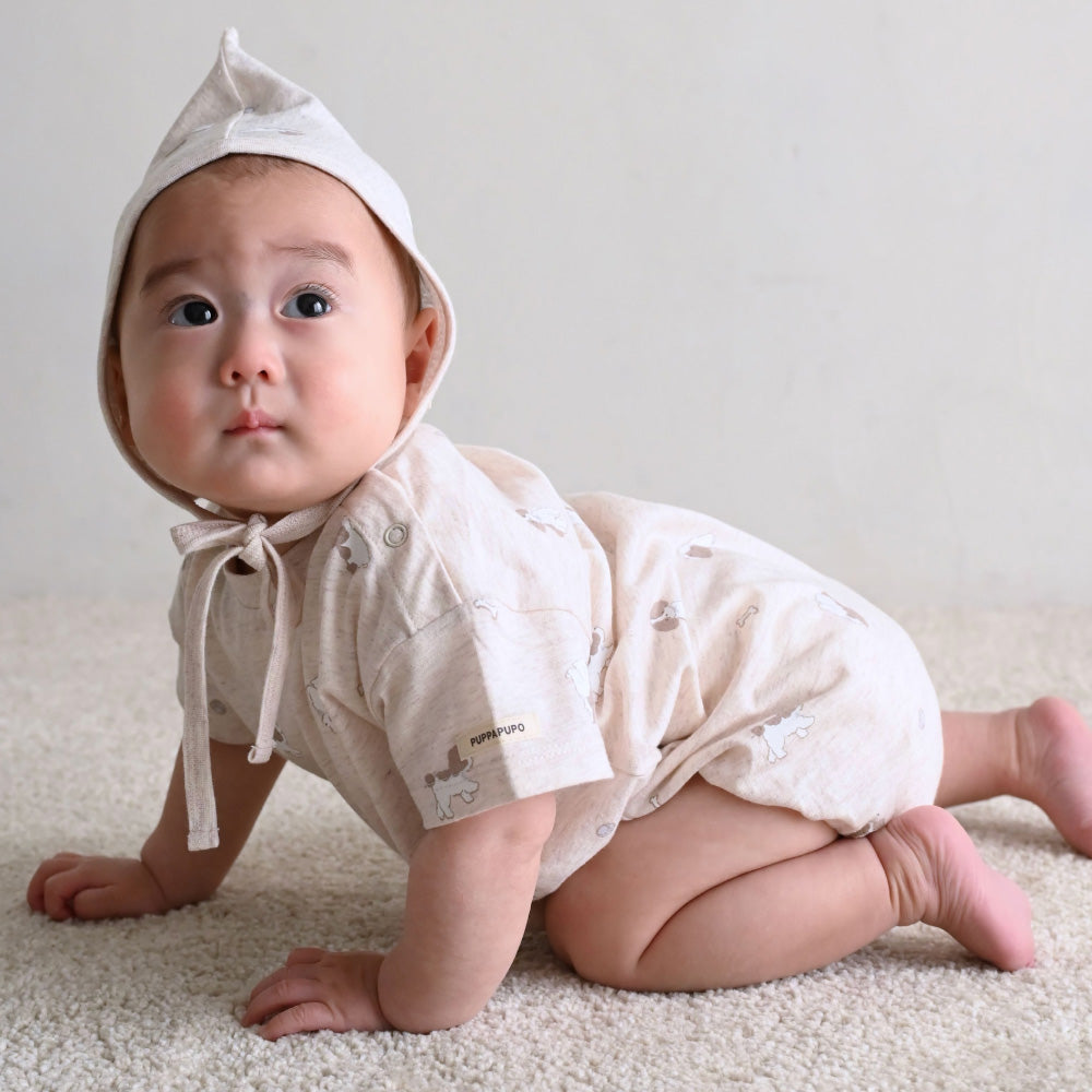 同素材、同デザインのボンネットがセットになったロンパース2点セット。ボンネットはちょっとしたおでかけやおうちフォトにも使えてかわいい。お耳まですっぽり隠れるから、ちょっとした冷房対策にも。