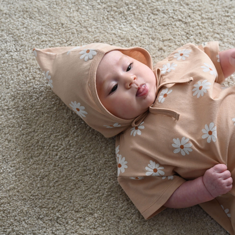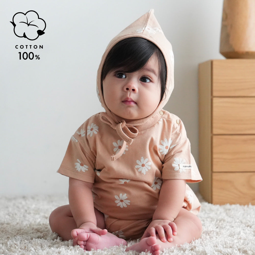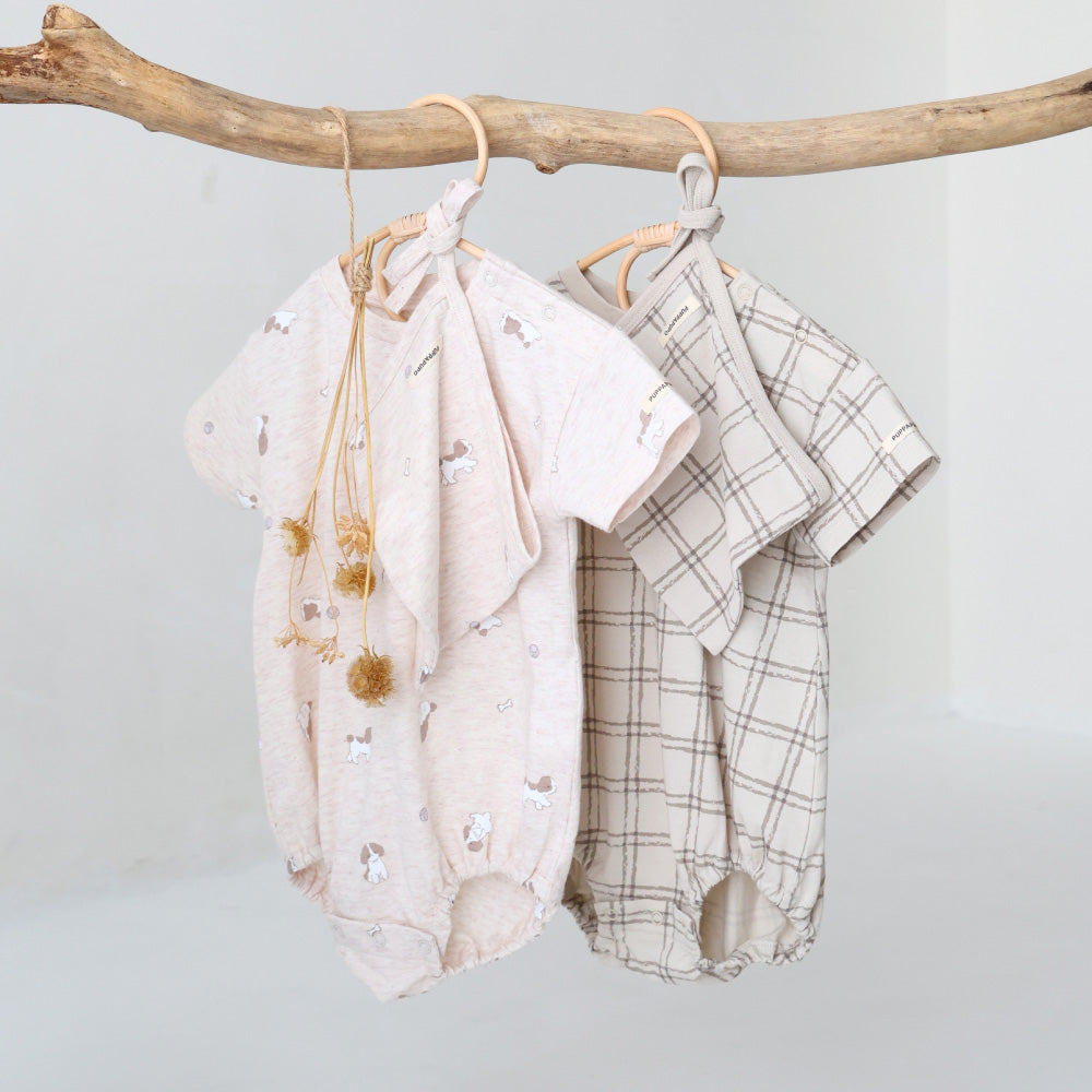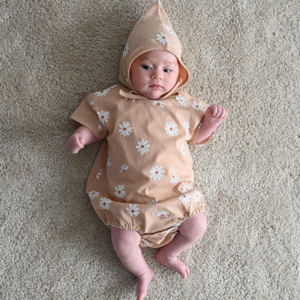 同素材、同デザインのボンネットがセットになったロンパース2点セット。ボンネットはちょっとしたおでかけやおうちフォトにも使えてかわいい。お耳まですっぽり隠れるから、ちょっとした冷房対策にも。