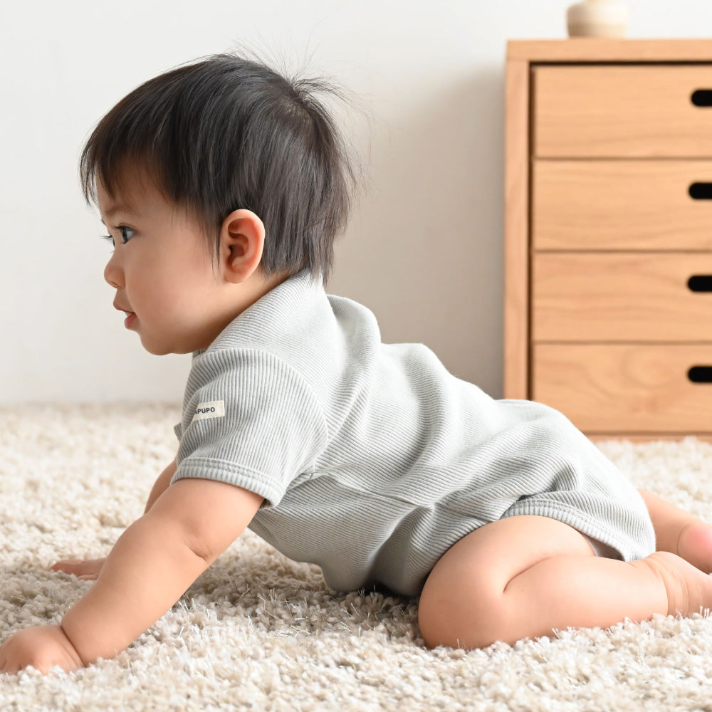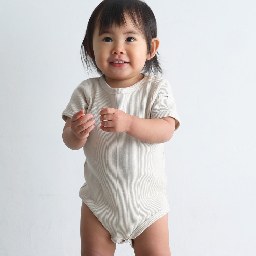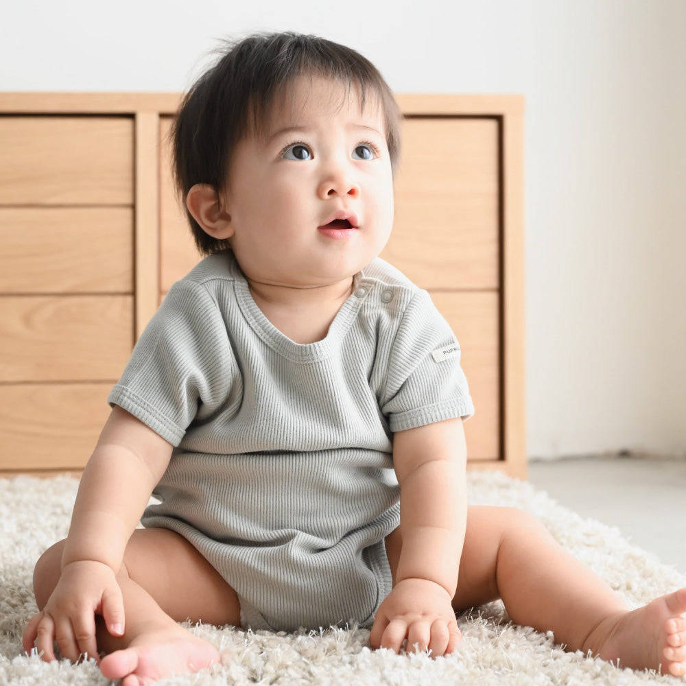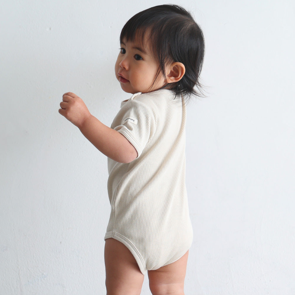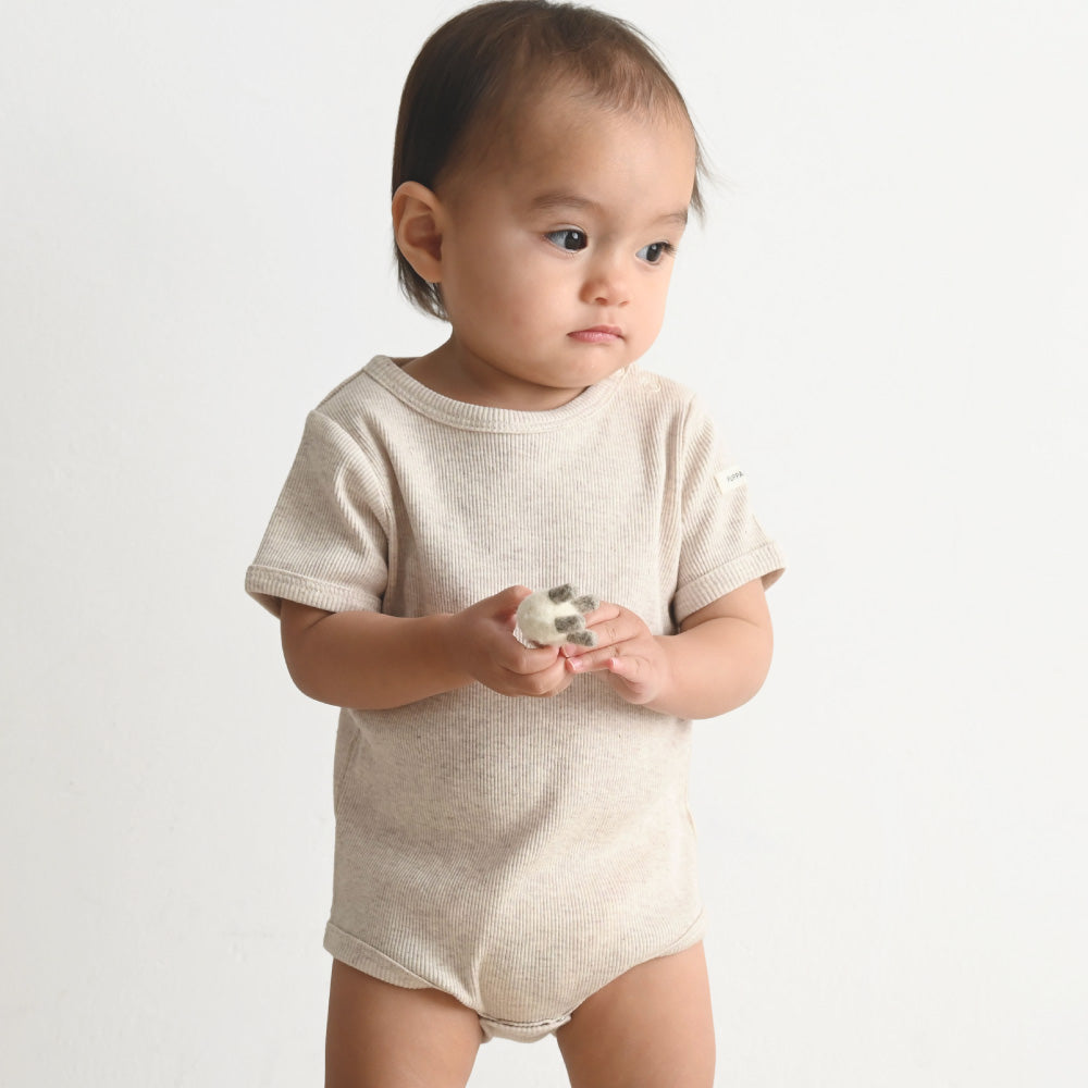 赤ちゃんのお洋服に欠かせないのが、おむつ替えやお着替えが楽にできる事。更には股ボタンのパッチン2重問題!肌着の上から着ることもあるロンパースはおむつ替えの際も股スナップボタンを2重に付け外しする事が大半の為、なるべく手間は少なく、でも形はきれいに見せたい、という思いからボタンは最小限の2つになりました。