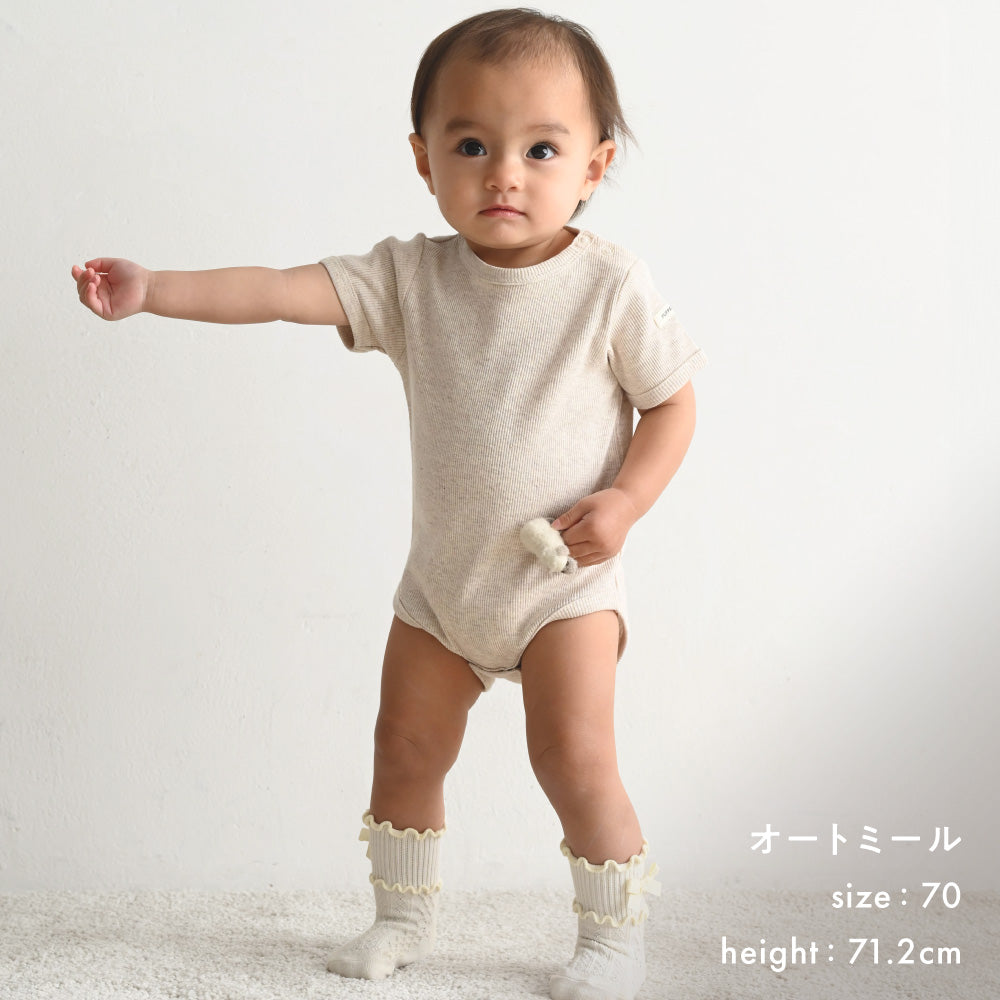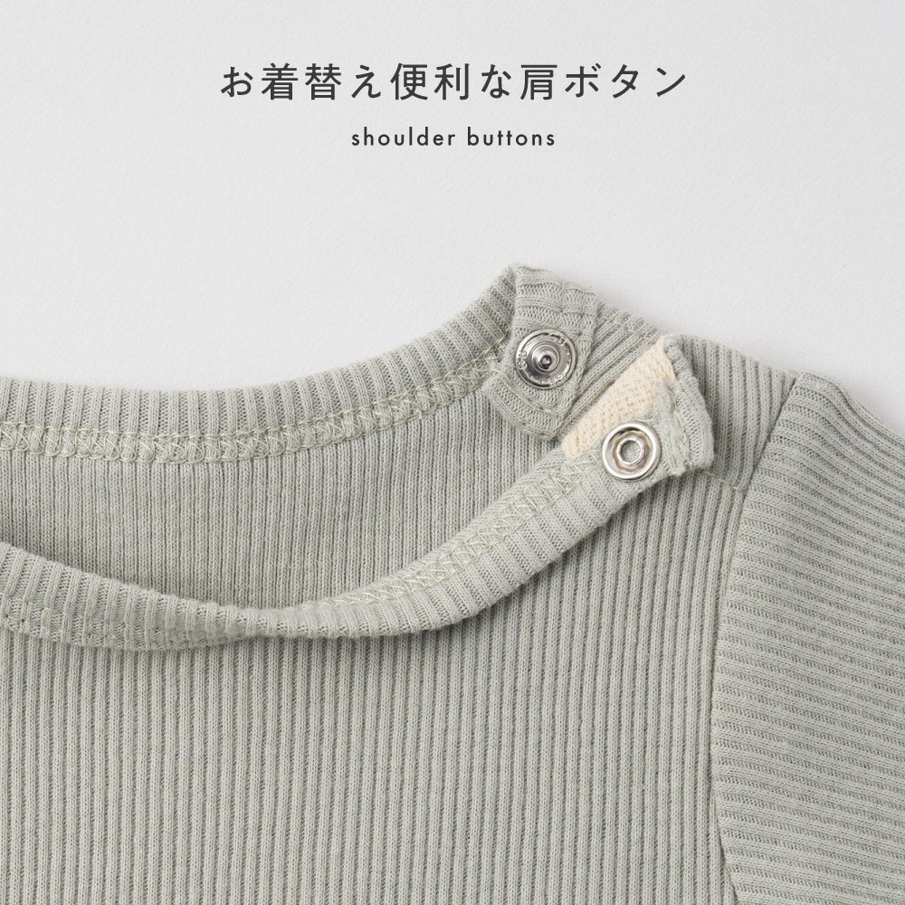 肩がスナップボタン仕様、かぶりの服でもボタンを外して着せられるので、襟元がよれにくくスムーズにお着替えができます。お着替え頻度の高い赤ちゃん服・ベビー服・子供服ではこの仕様がおすすめです。