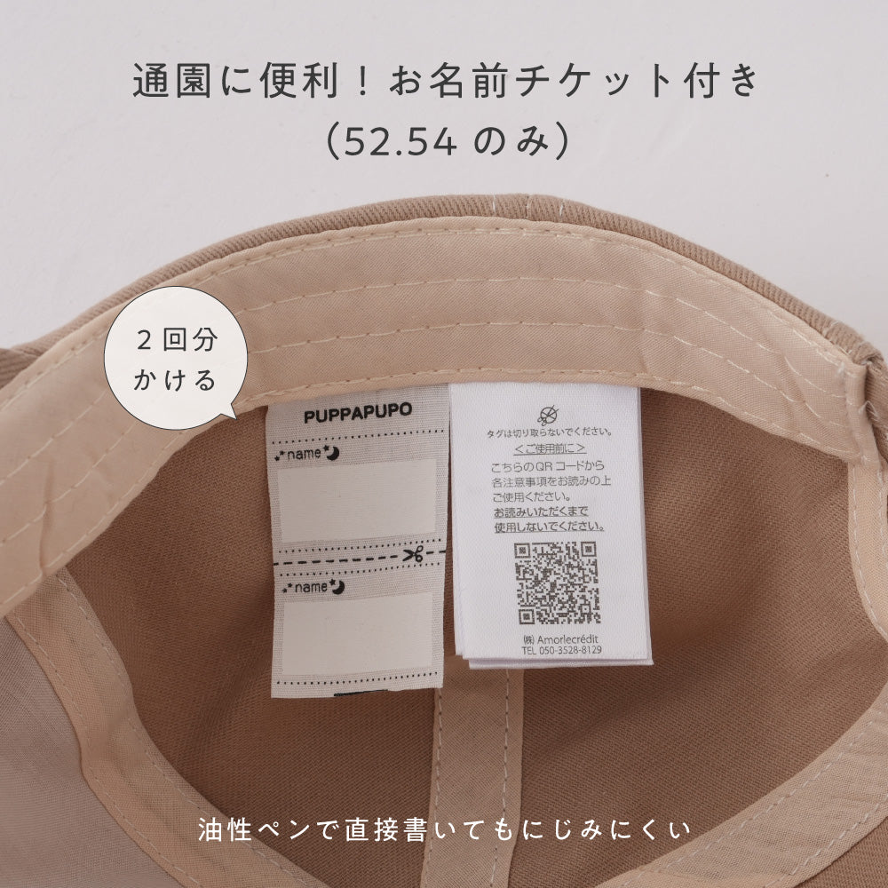 • 本体はふんわりやわらかく優しい被り心地のツイル素材。ベビー・キッズの帽子として、重すぎない程よい厚みなので、長いシーズンお使いいただけます。