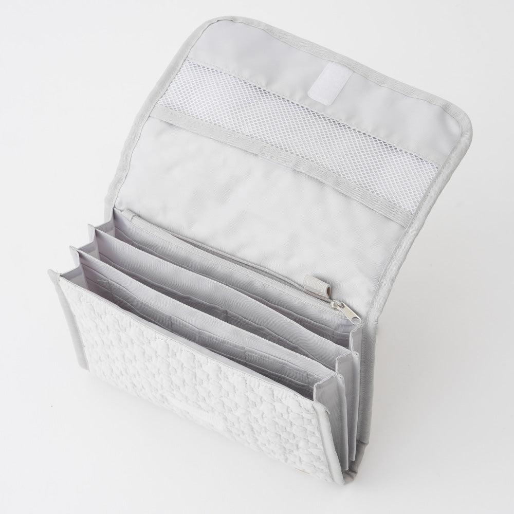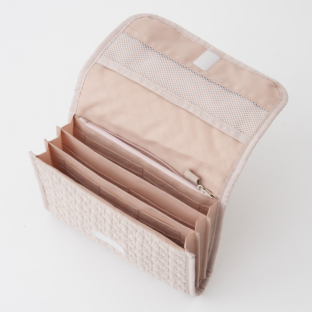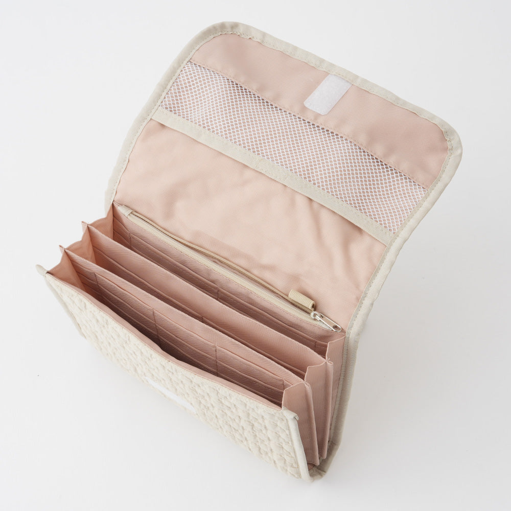 ガバっと広がり、中が見やすく取り出しやすいジャバラ型。母子手帳・お薬手帳・乳幼児医療証・保険証・診察券など、すっきり収納できる大容量タイプ。収納スペースが分かれているので、家族分の仕分けもできます。