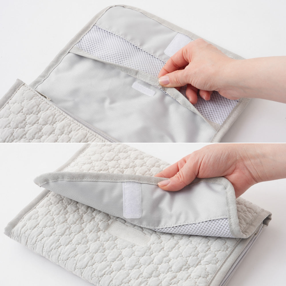 病院に渡すUSB・予備の現金・パスポート・お守り・印鑑などの細々した物も安心して一緒に持ち歩けるよう、貴重品の収納に便利なファスナー付きポケットを付けました。