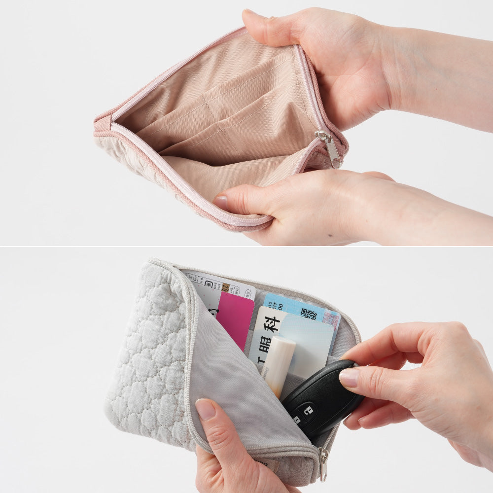 約16×12cm、パッと持ち運べるカードケース。カードポケットは4枚分。L字ファスナーで扱いやすく、カード入れとしてだけではなく、リップや鍵を入れてちょっとしたポーチとして使うのもオススメです。
