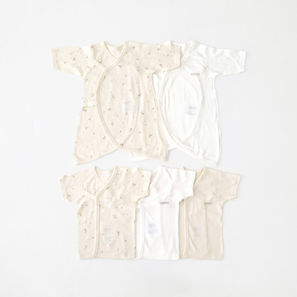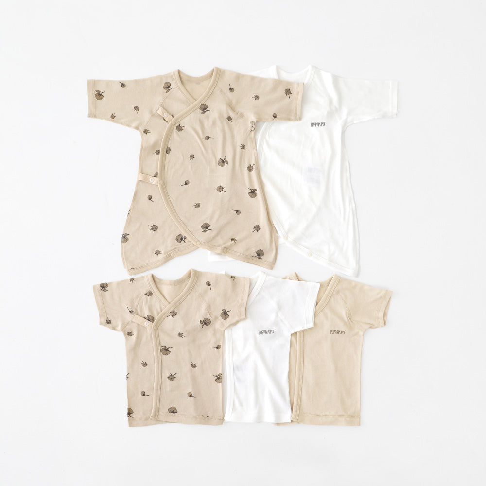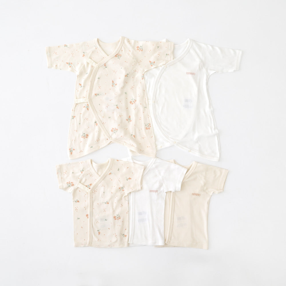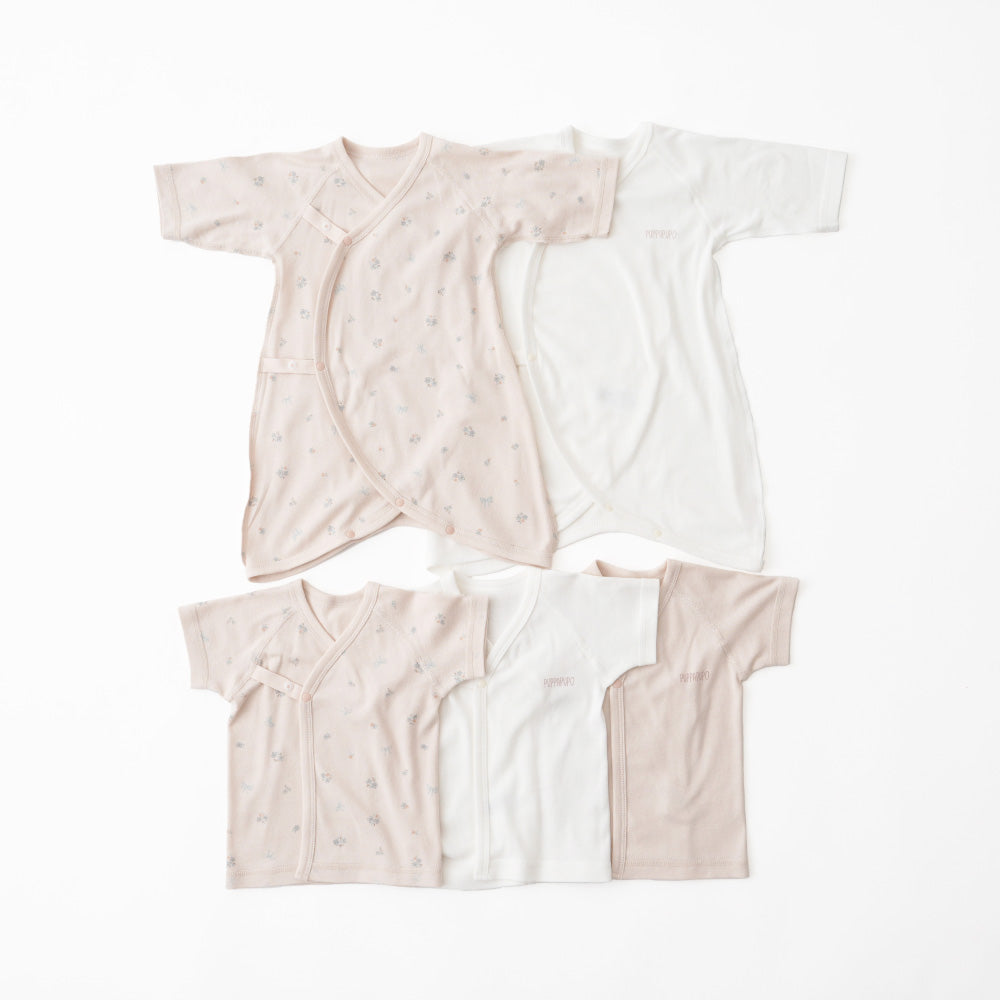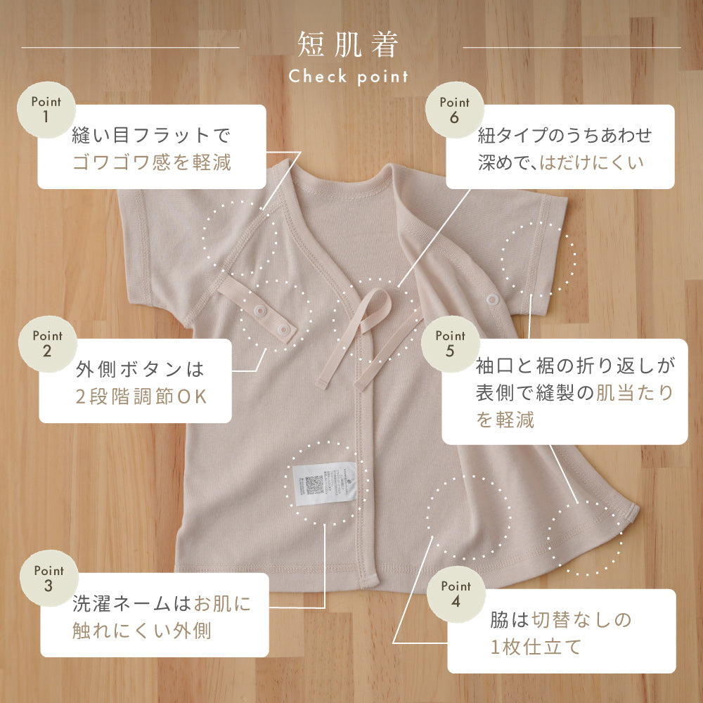 着丈が短く重ね着させやすいのが短肌着。前合わせタイプで、紐・ボタンで成長に合わせて調節することができます。1年中どの季節でも使えます。新生児の時期はほぼ毎日使う短肌着、出産後すぐから使用できるので、退院時のセレモニードレスの下にも着せられます。