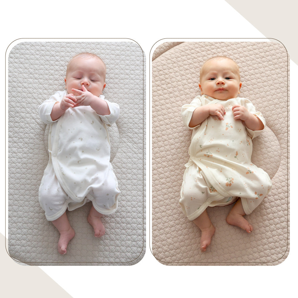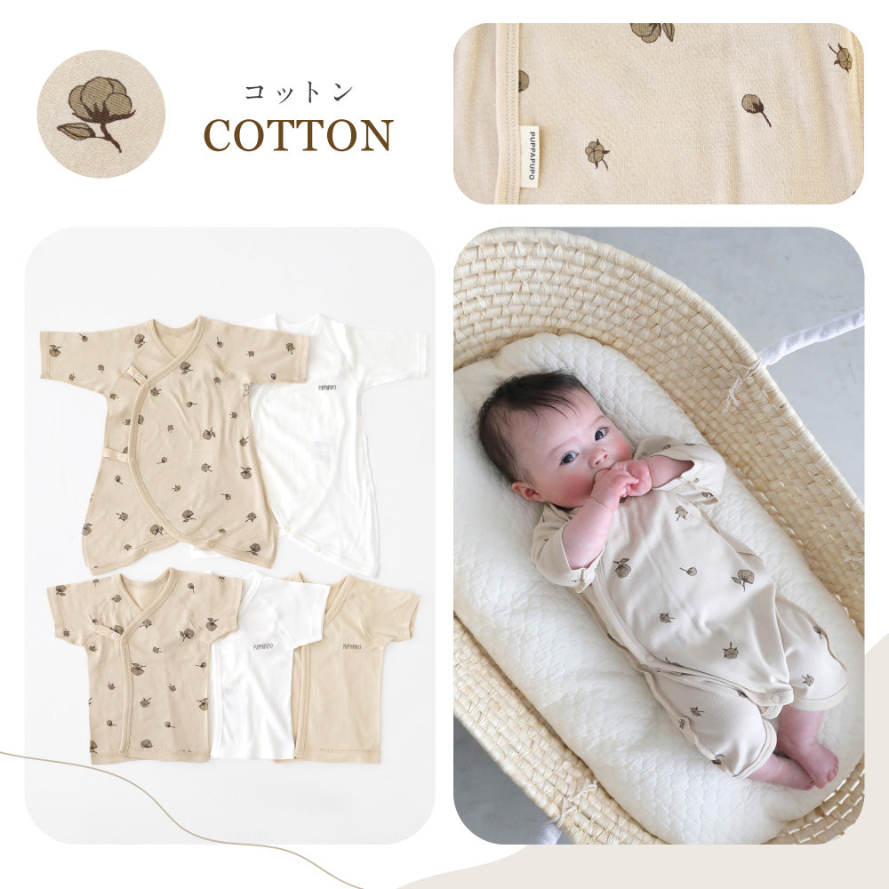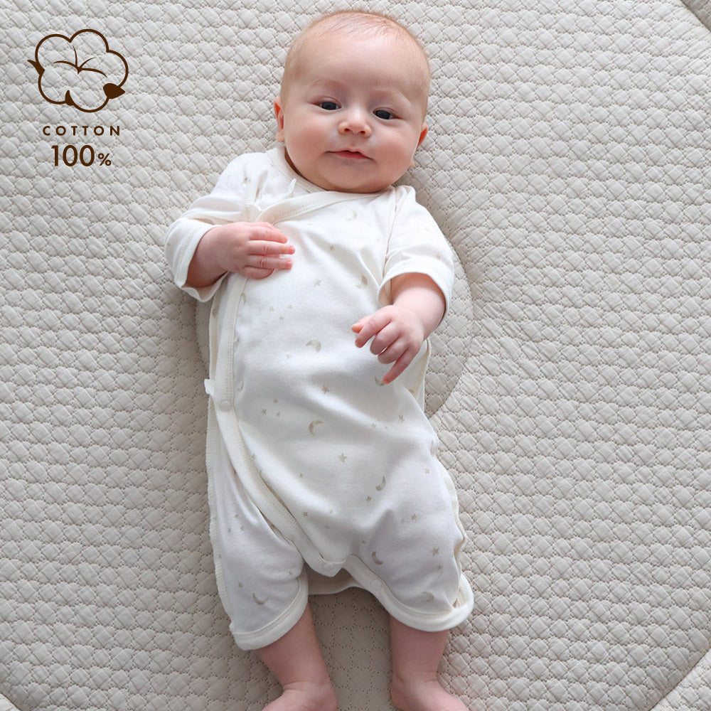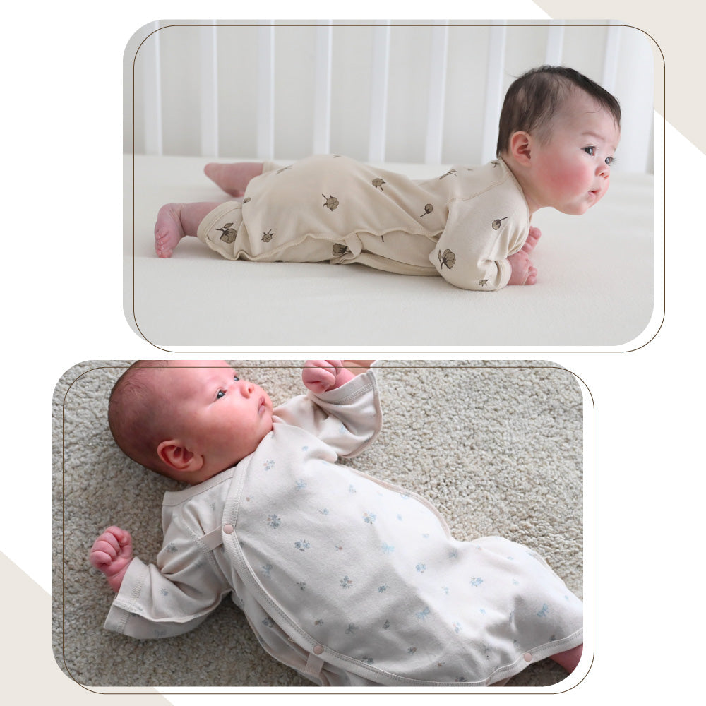 前開きが基本、股下をスナップボタンで留められるので、足をバタバタさせ始める頃からも足元がはだけにくく、とても便利。前合わせタイプは、紐・ボタンで成長に合わせて調節することができます。気温によってこれ1枚でも、短肌着と合わせてもお使いいただけます。