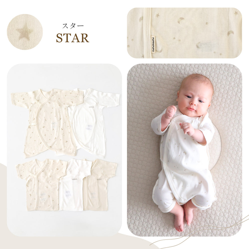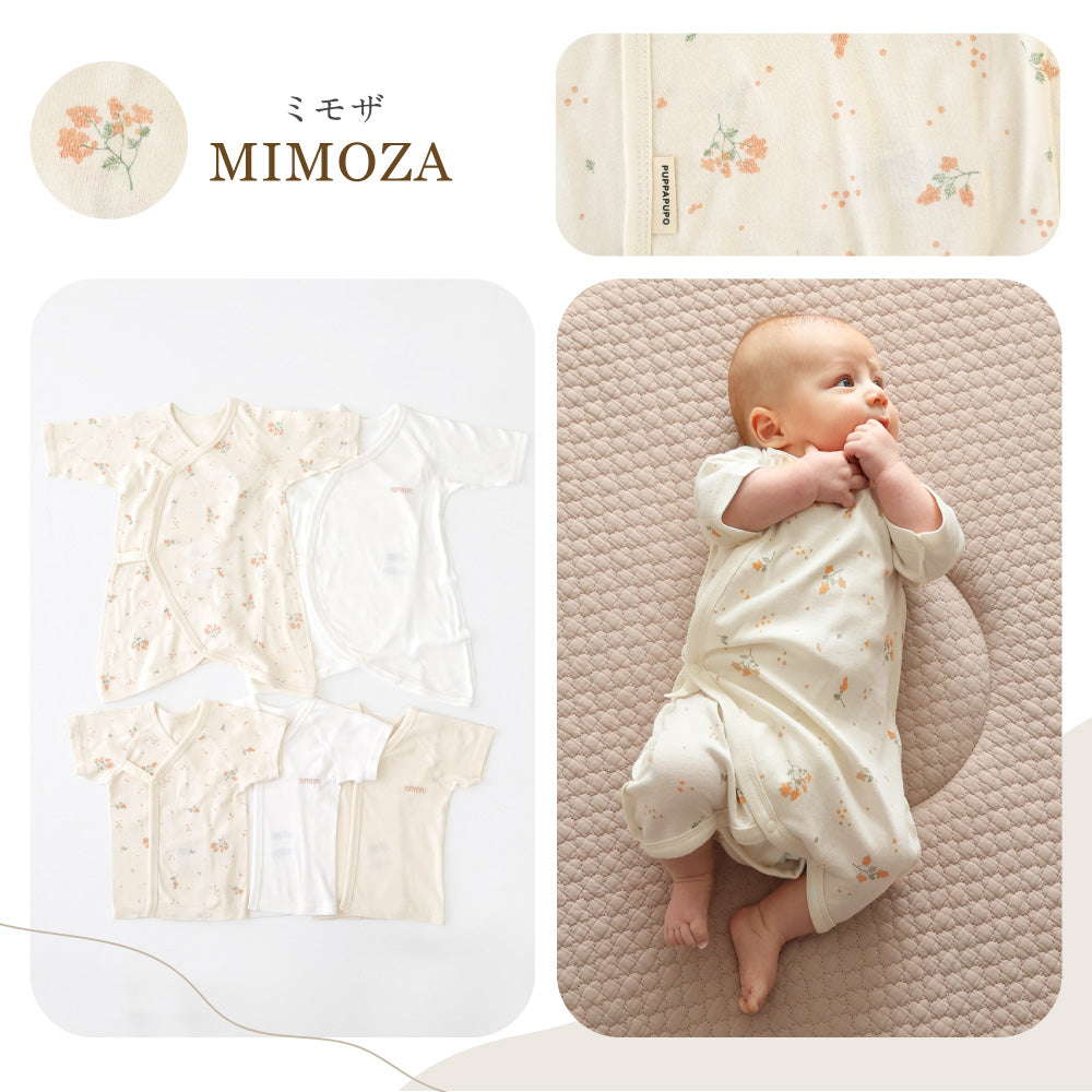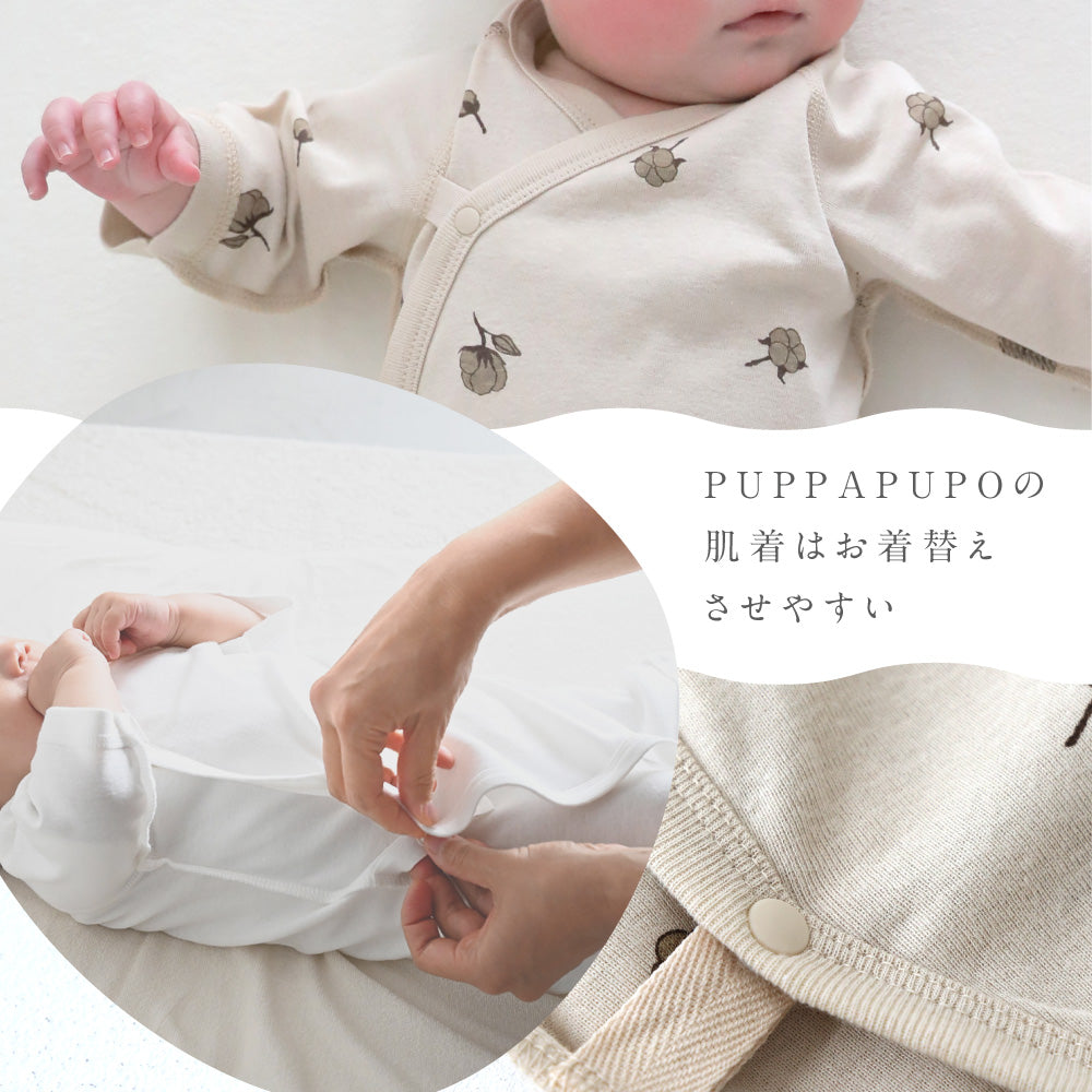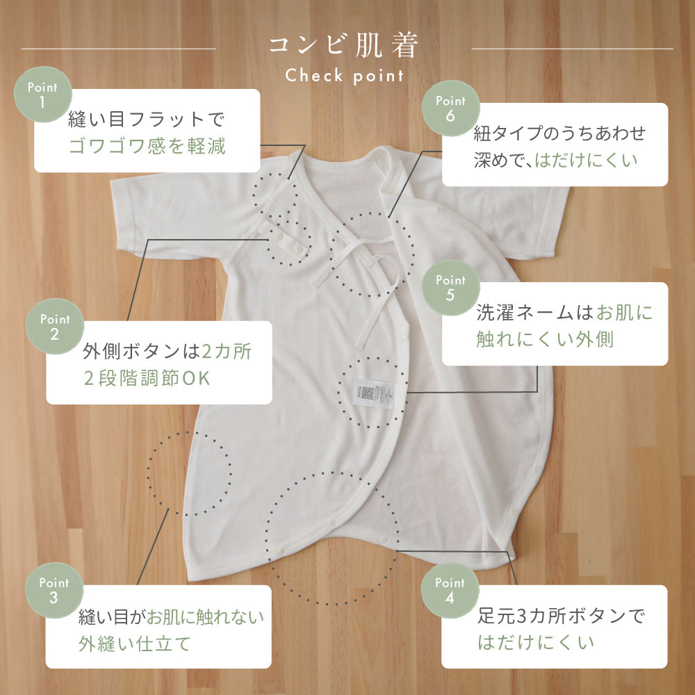 生まれてすぐでもお着替えしやすい、赤ちゃん服に多い「前開きタイプ」はもちろんのこと、お肌に触れる内側はお肌にやさしい紐タイプ、外側は着せ替えやすさにこだわってスナップボタンにしました。縫製部分も極力肌にあたる部分は少なく。1日に何度もお着替えする機会の多い新生児期、着せやすさは大事なポイント。