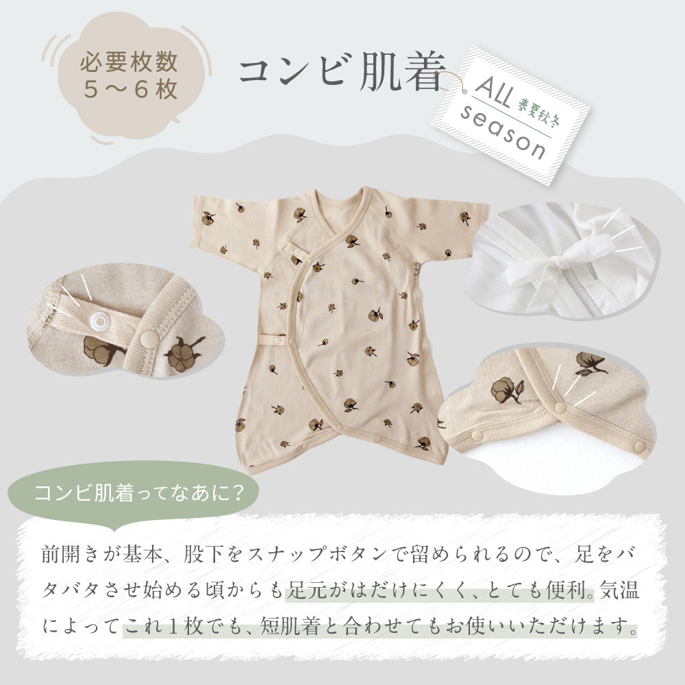 出産準備の必需品、ベビー肌着セット。肌着って種類が多すぎて何がいいのか迷ってしまいますよね。こちら先輩ママたちから聞いた「こんな組み合わせで使ったよ!」の意見を元に半袖の短肌着3枚+長袖のコンビ肌着2枚をセットにしました。暖かい春は短肌着+コンビ肌着、肌寒い春先、秋、冬なら短肌着+コンビ肌着に季節ウエア、夏は短肌着orコンビ肌着のみでもOK。水通しも考えて、肌着の購入はマタニティ期がおすすめです。