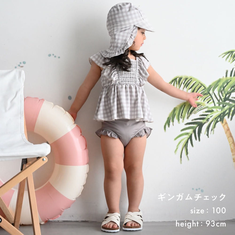 オシャレでキュートなセパレートタイプのベビー・キッズ水着+スイムキャップの2点セット。(スイムキャップは有り無しが選べます。)肩部分・足口フリルタイプ、胸元シャーリングのふんわりタンキニタイプのスイムウェア。保育園や幼稚園、海やプール、公園の噴水など子供達の大好きな水遊び。着てる姿を想像するだけでワクワクするような大人かわいいデザインです。