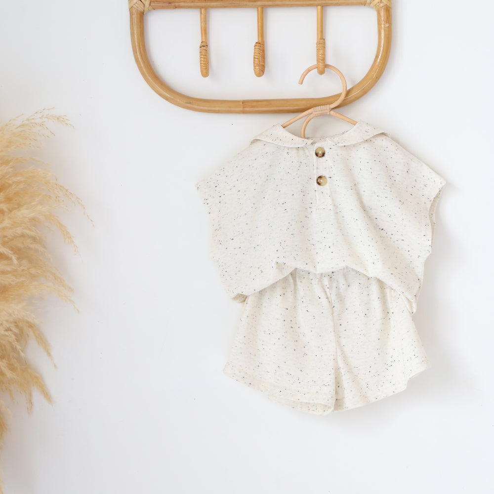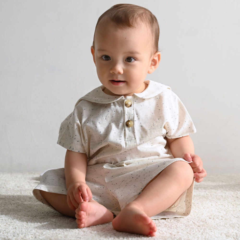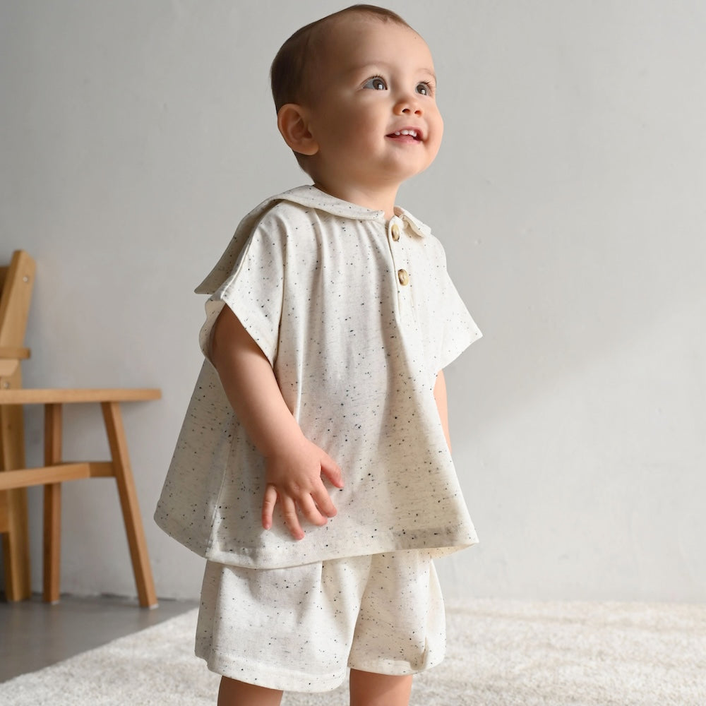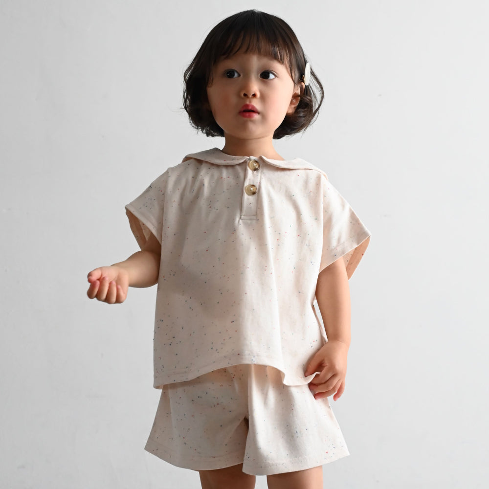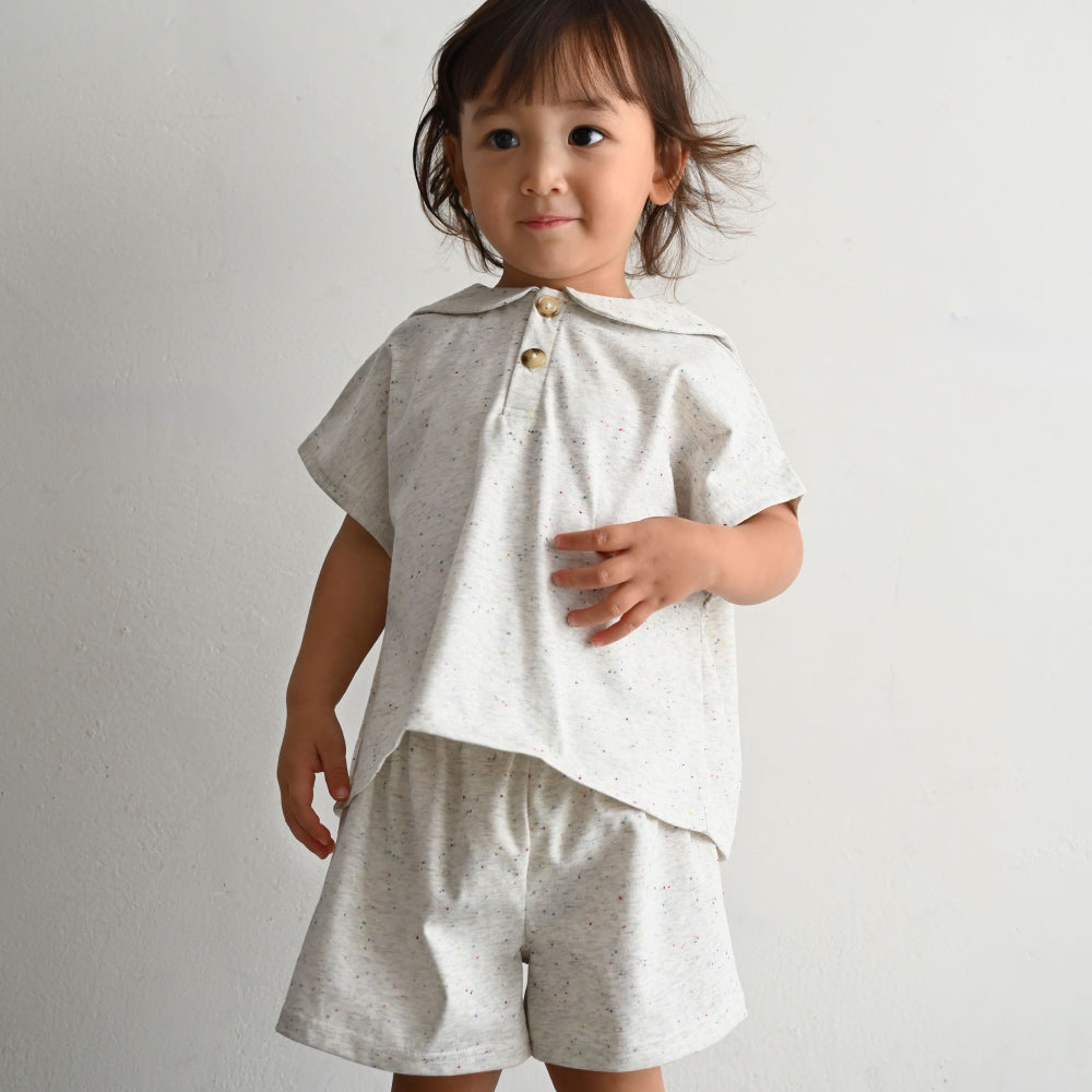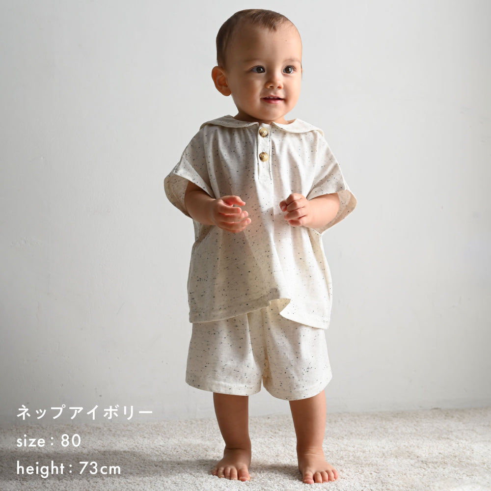 小さな子供でも脱ぎ着がしやすい前面ボタン開きのデザインです。細かいディティールにも子供服ならではの配慮を。