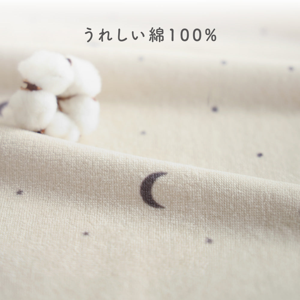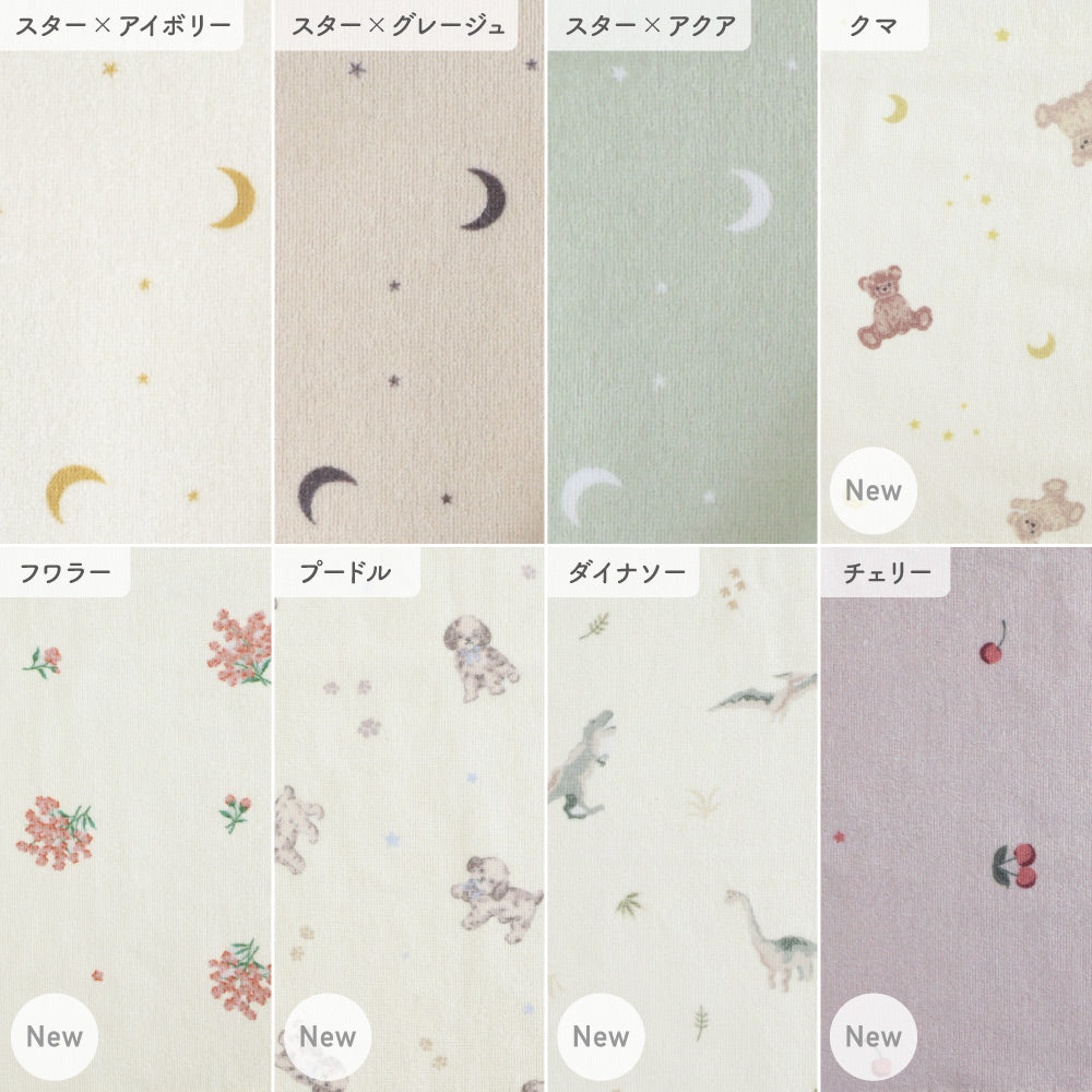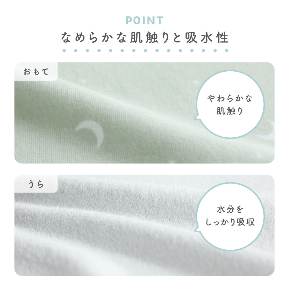 柄のある表面は、やわらかくなめらかな肌触りのシャーリング仕様。裏面のループ地はお肌に優しくフィットし、お子さまの汗も素早くしっかり吸収してくれます。