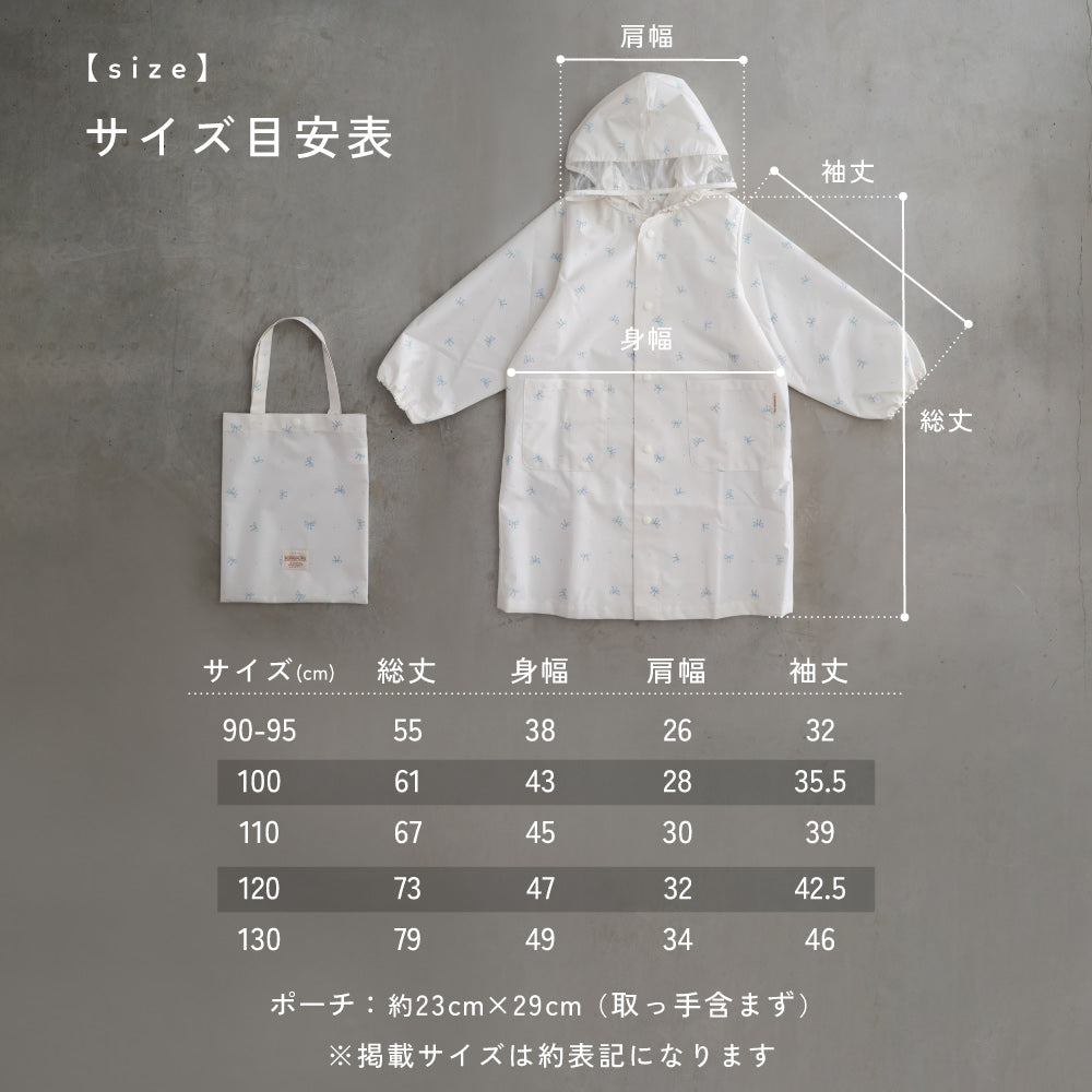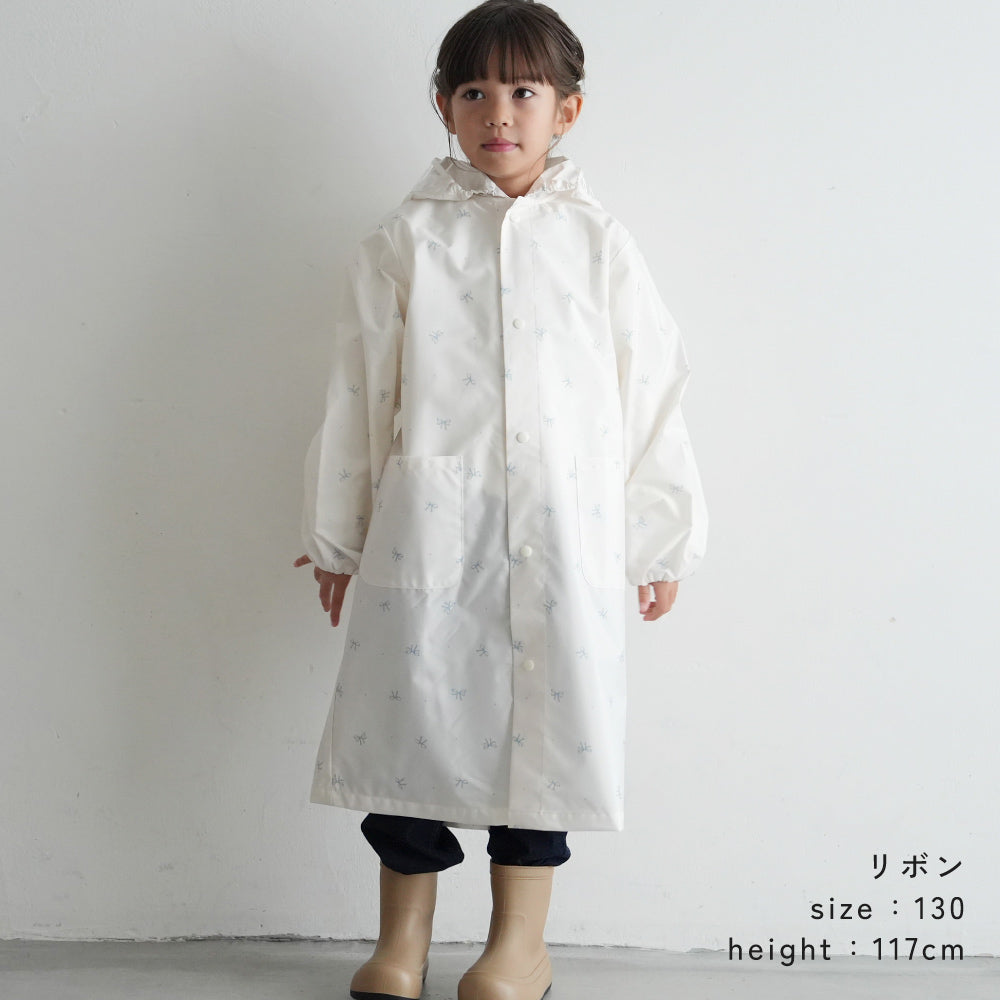 まだ4歳ですが身長が108cmあり130を購入。ランドセルを想定されていますが保育園のリュックを背負ったままでも大丈夫でした。丈が長めなので膝下まで隠れて濡れずにすみました。すこし大きめなので袖は捲っていますが、しっかりした作りなのでこのまま小学校でも使えそうです。
