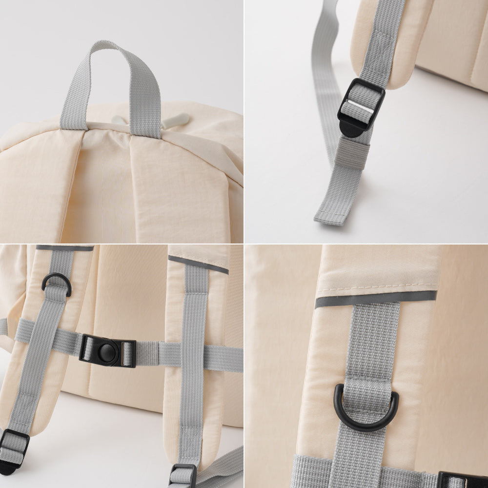 お弁当箱固定バンドや手提げ用の持ち手もついてます。背面・底部分はウレタン入り。肩ベルトに反射板機能(リフレクター)付き。中にネームホルダーもついてます。デイリュックとして通園時だけでなく、公園遊びや遠足、通学やピアノ、塾、旅行など幅広い用途や年齢で使える嬉しいポイントがたくさん。