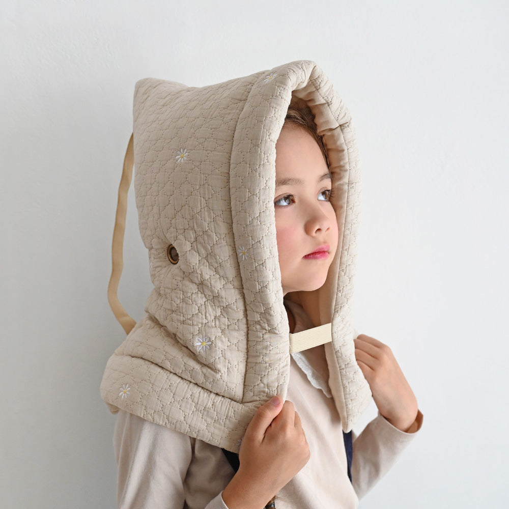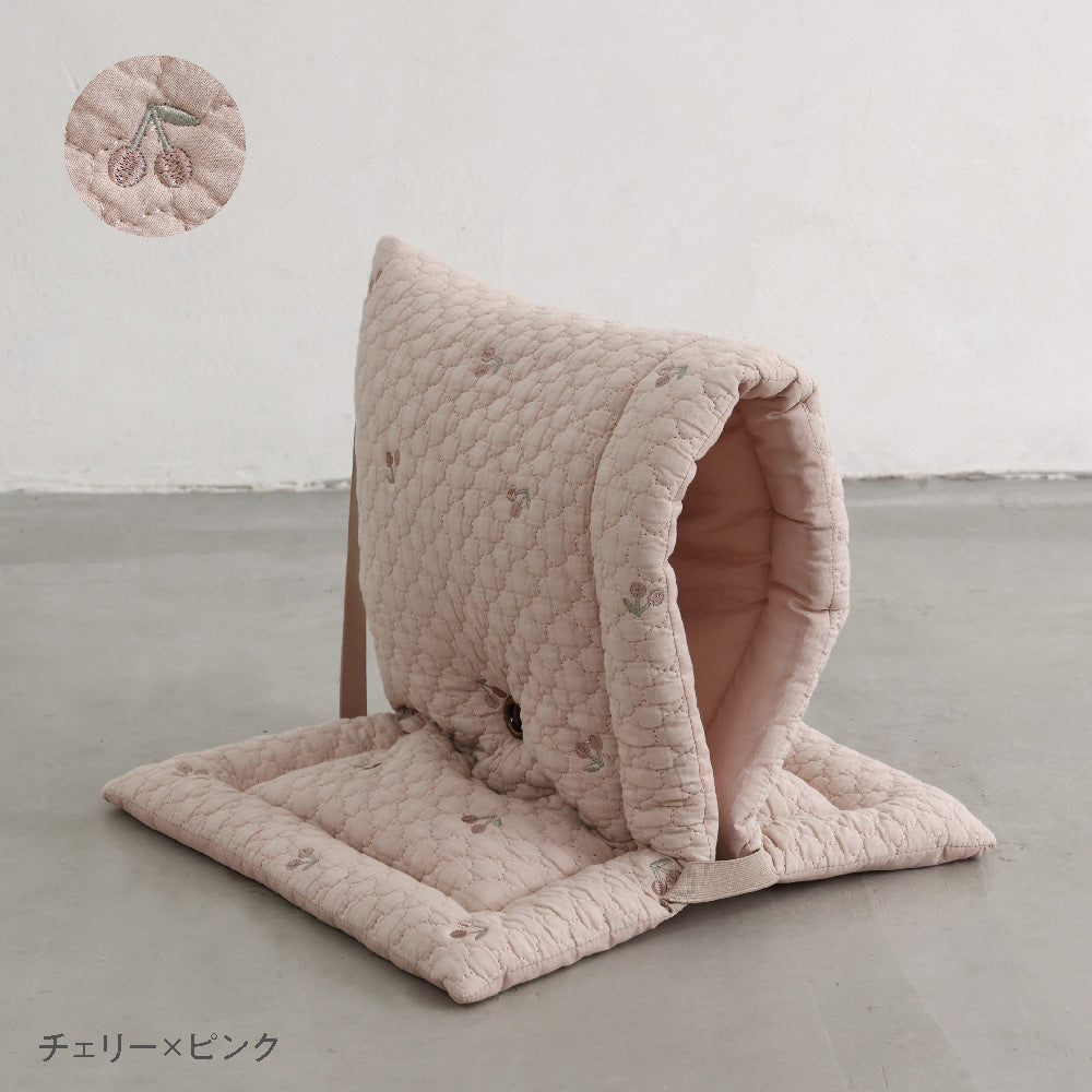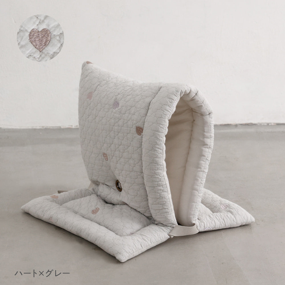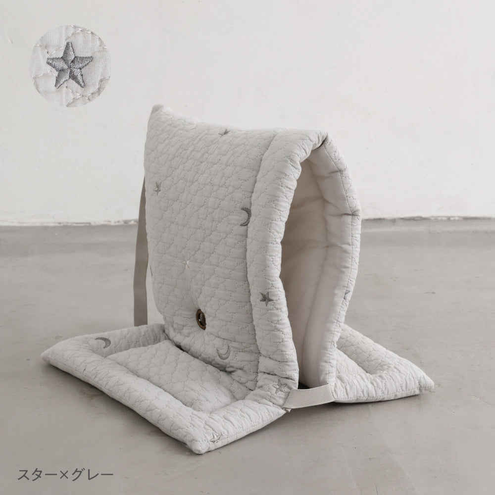 おしゃれな見た目なのにしっかりしたPUPPAPUPOオリジナル防災頭巾。中綿には燃えにくい難燃素材を使用(※表面のキルト生地は難燃ではありません)流行のくすみカラーのイブル生地に可愛らしい刺繍をプラスしたありそうでなかったおしゃれデザイン防災グッズ。ご自宅の子ども用の防災リュックに入れたり、園や学校など幅広くお使いいただけます。