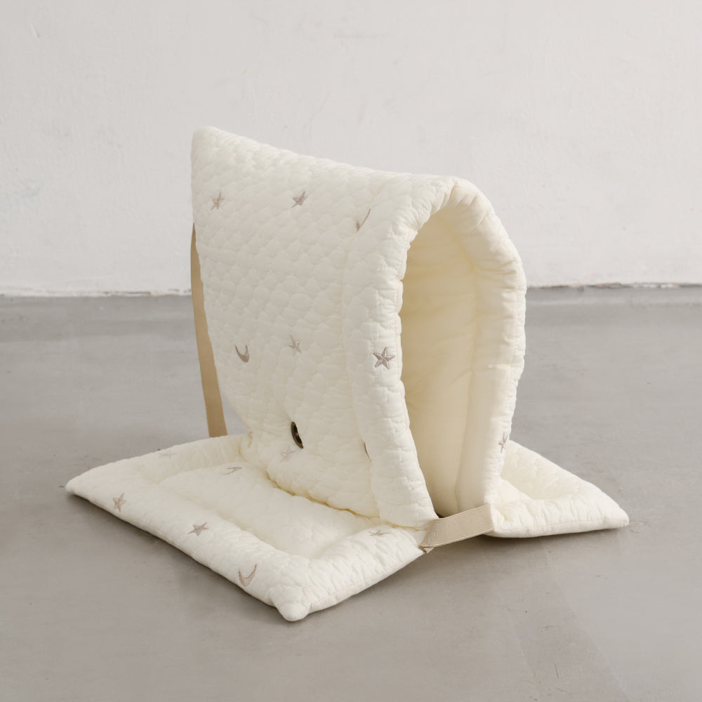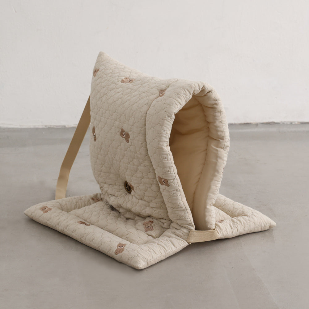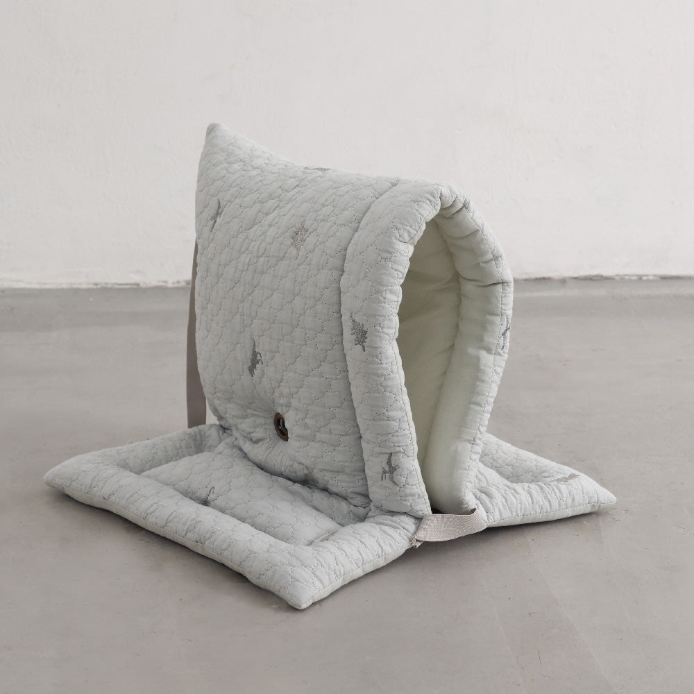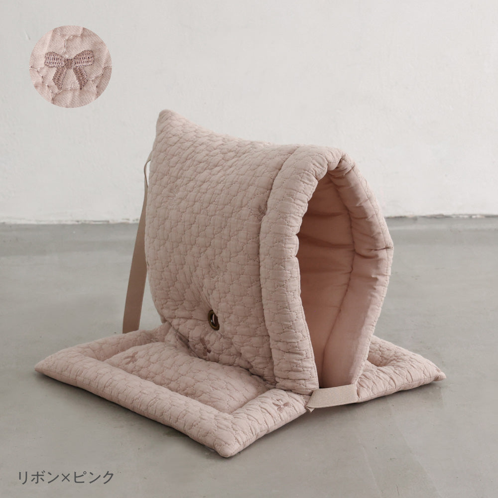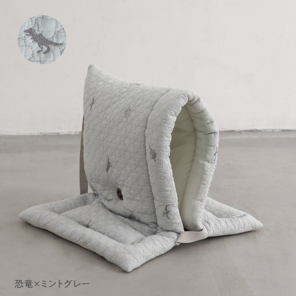 メインの中綿は防炎性能試験に合格した難燃綿(中綿)を使用、中綿の柔らかいクッションがお子さまの頭にしっかりフィット。丈夫なキルト生地に中綿をたっぷり詰め込んだクッションで、お子さまの頭から肩までを、しっかり覆ってくれます。※表面のキルト生地は難燃ではありません