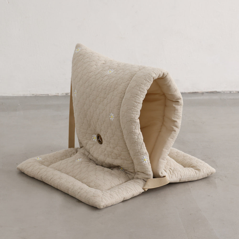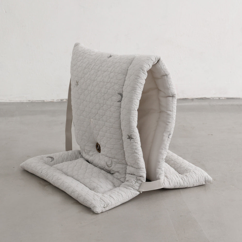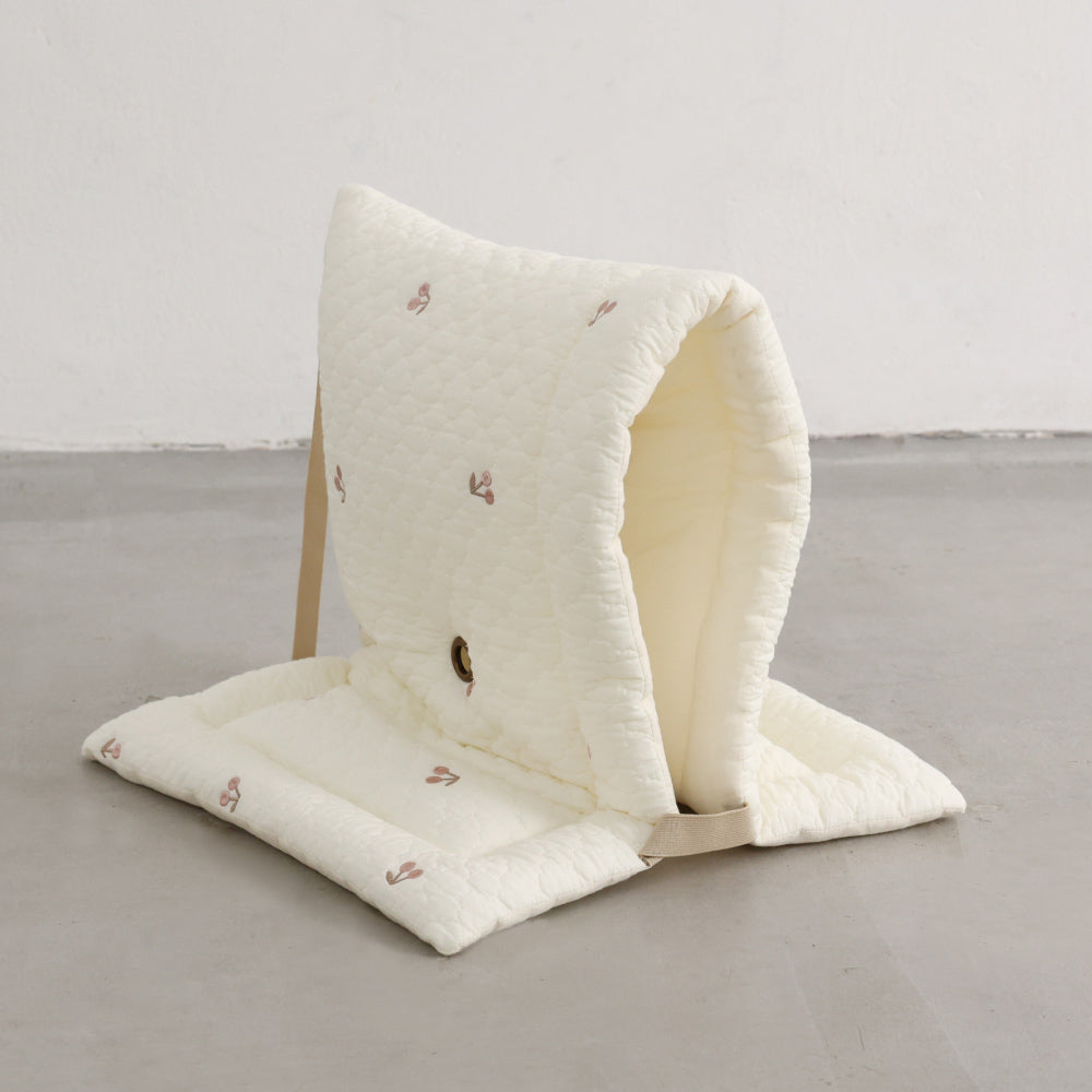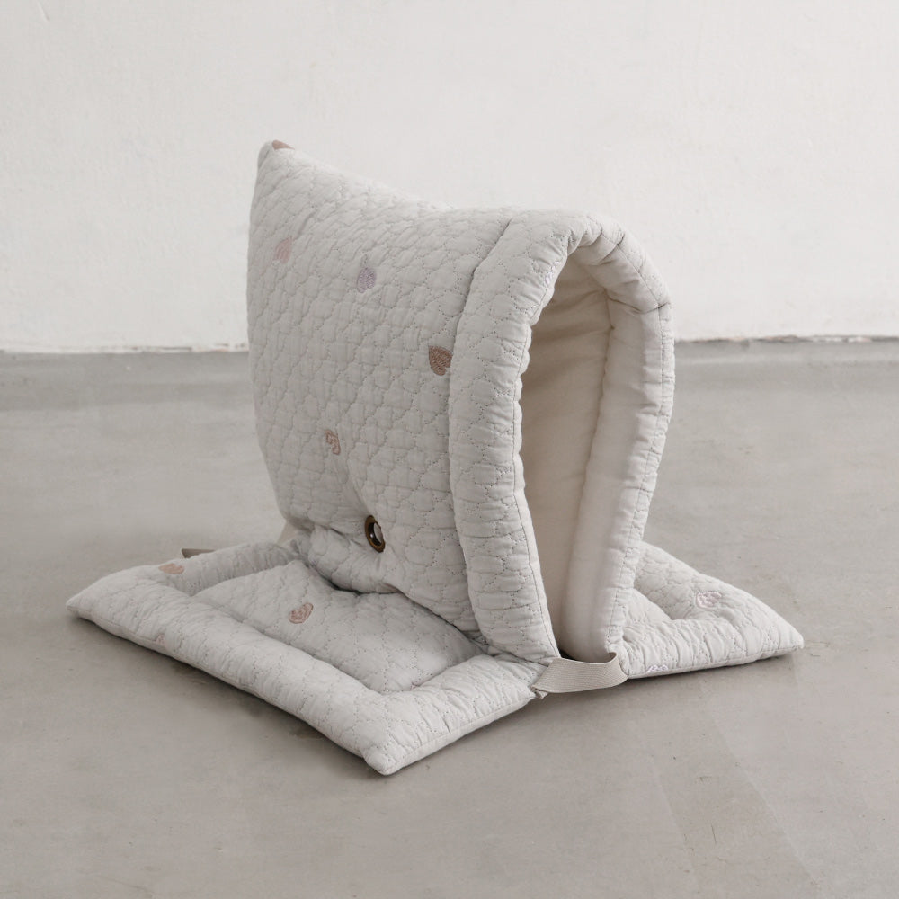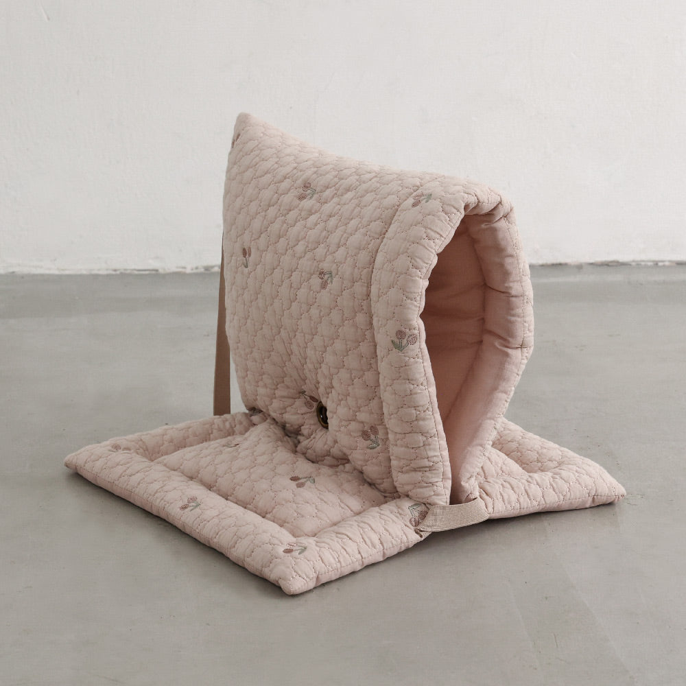 本体側面には、お子さまでも簡単に装着できるゴムバンド付き。椅子の背もたれに通して座布団としてもお使いいただけます。