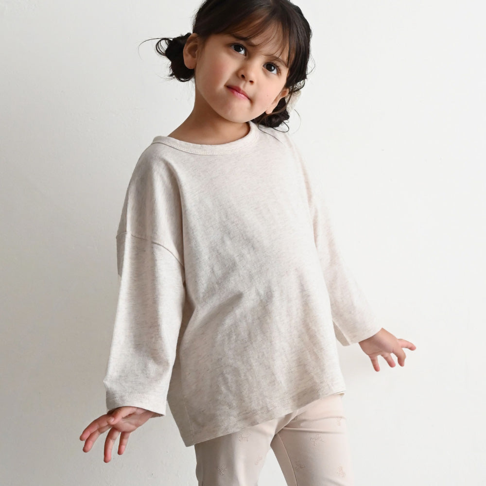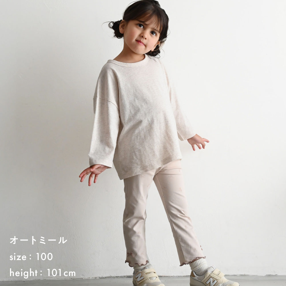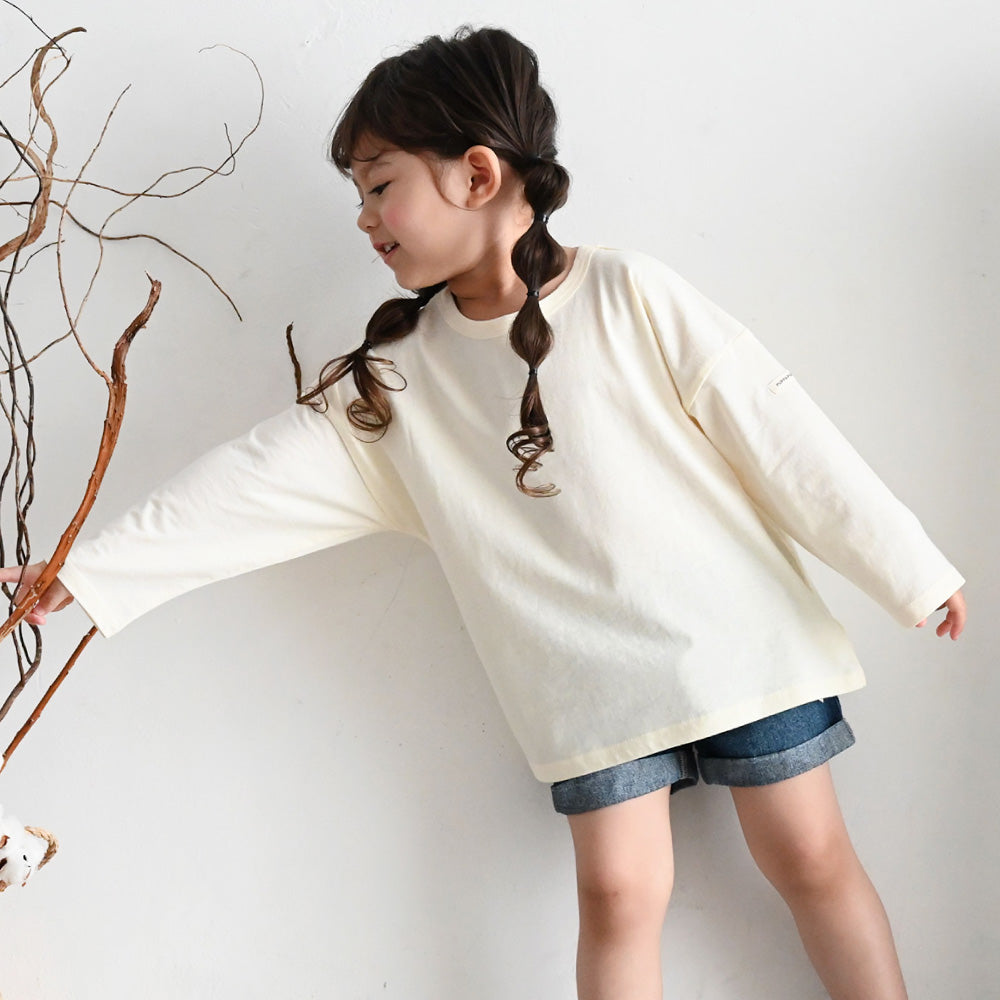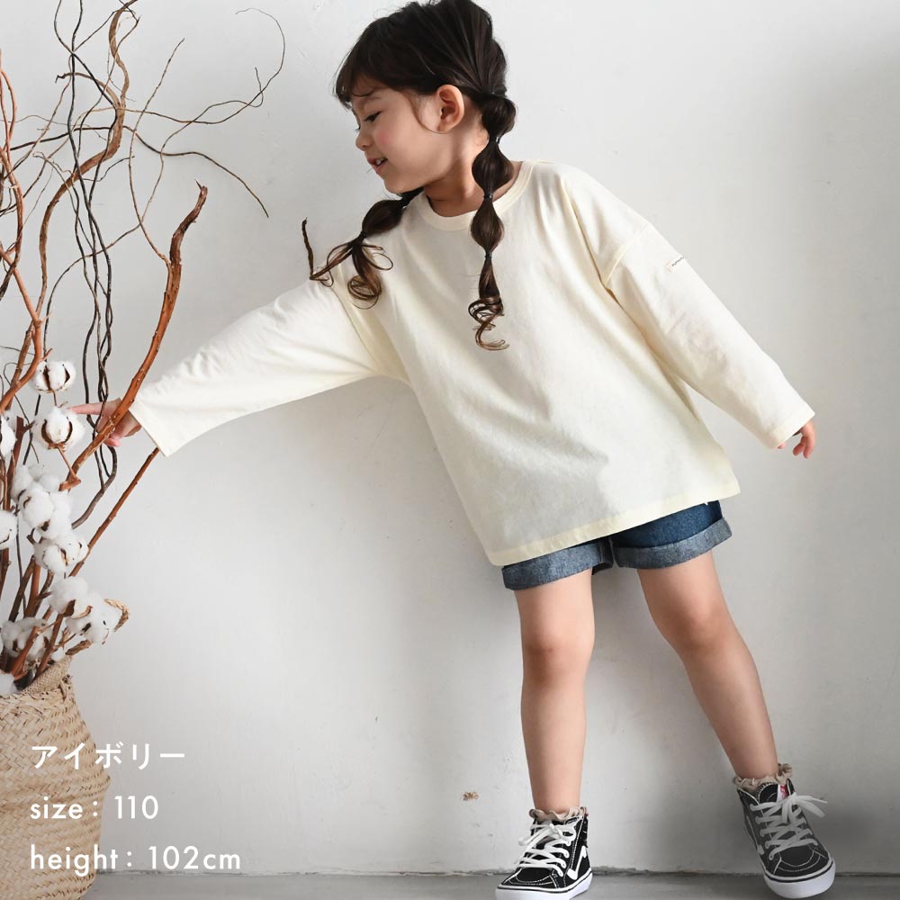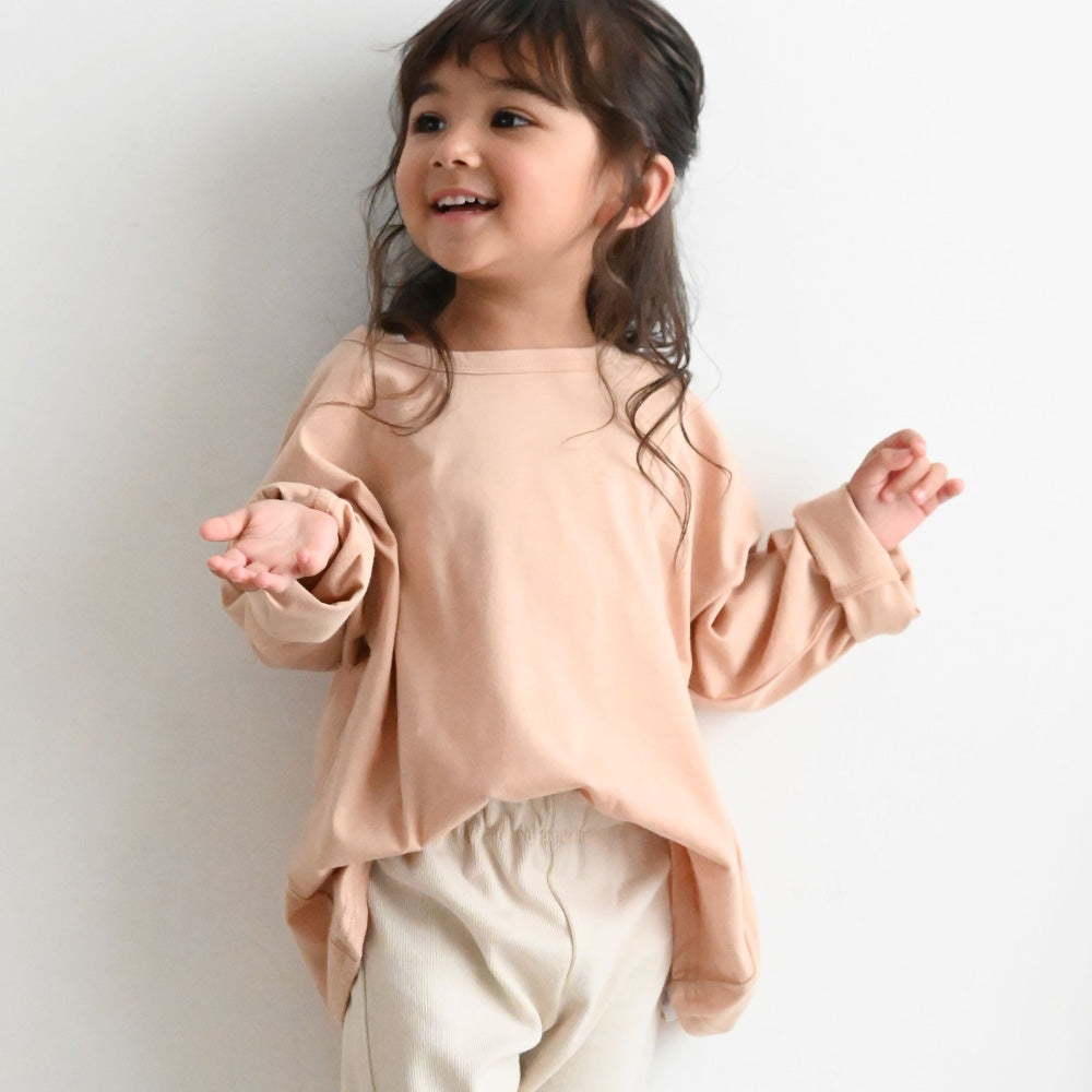 キッズもママも嬉しいコットン100%の天竺素材で、さらっと、やわらかな肌触り。ベビー服・キッズ服として程よい厚さで、長いシーズンお使いいただけます。(こちらは衿ぐりも含めてすべて綿100%です。)