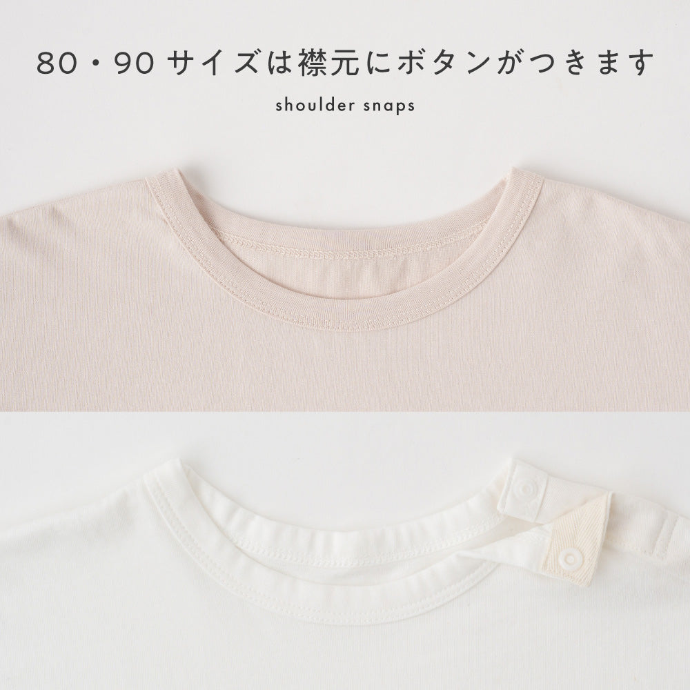80サイズと90サイズは肩がスナップボタン仕様です。そのため、かぶりの服でもボタンを外して着せられるので、襟元がよれにくくスムーズにお着替えができます。お着替え頻度の高い赤ちゃん服・ベビー服・子供服ではこの仕様がおすすめです。