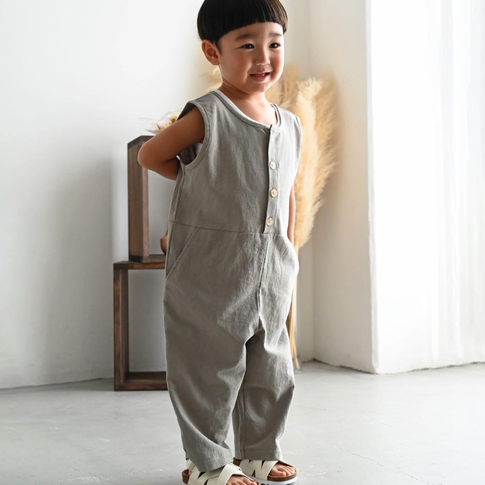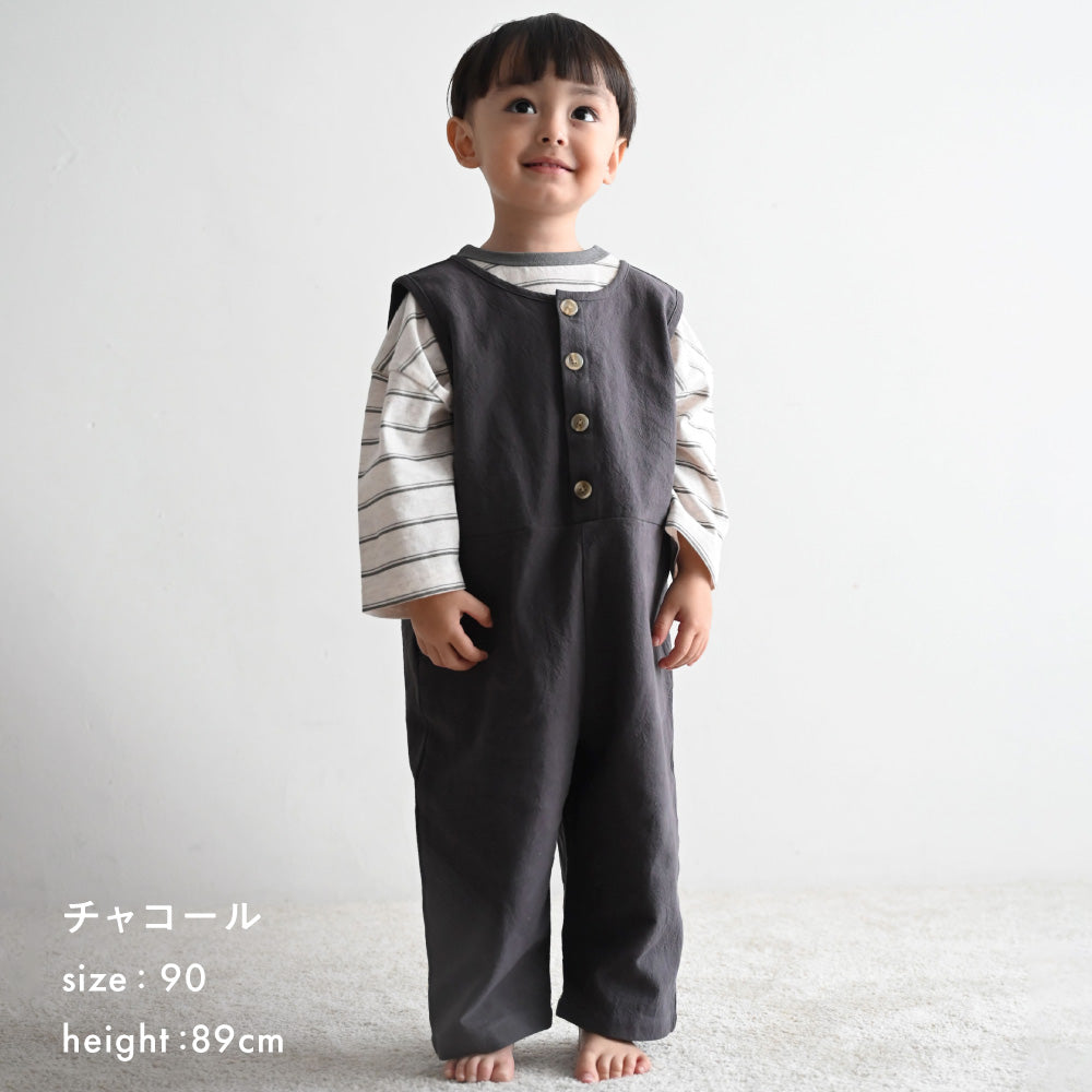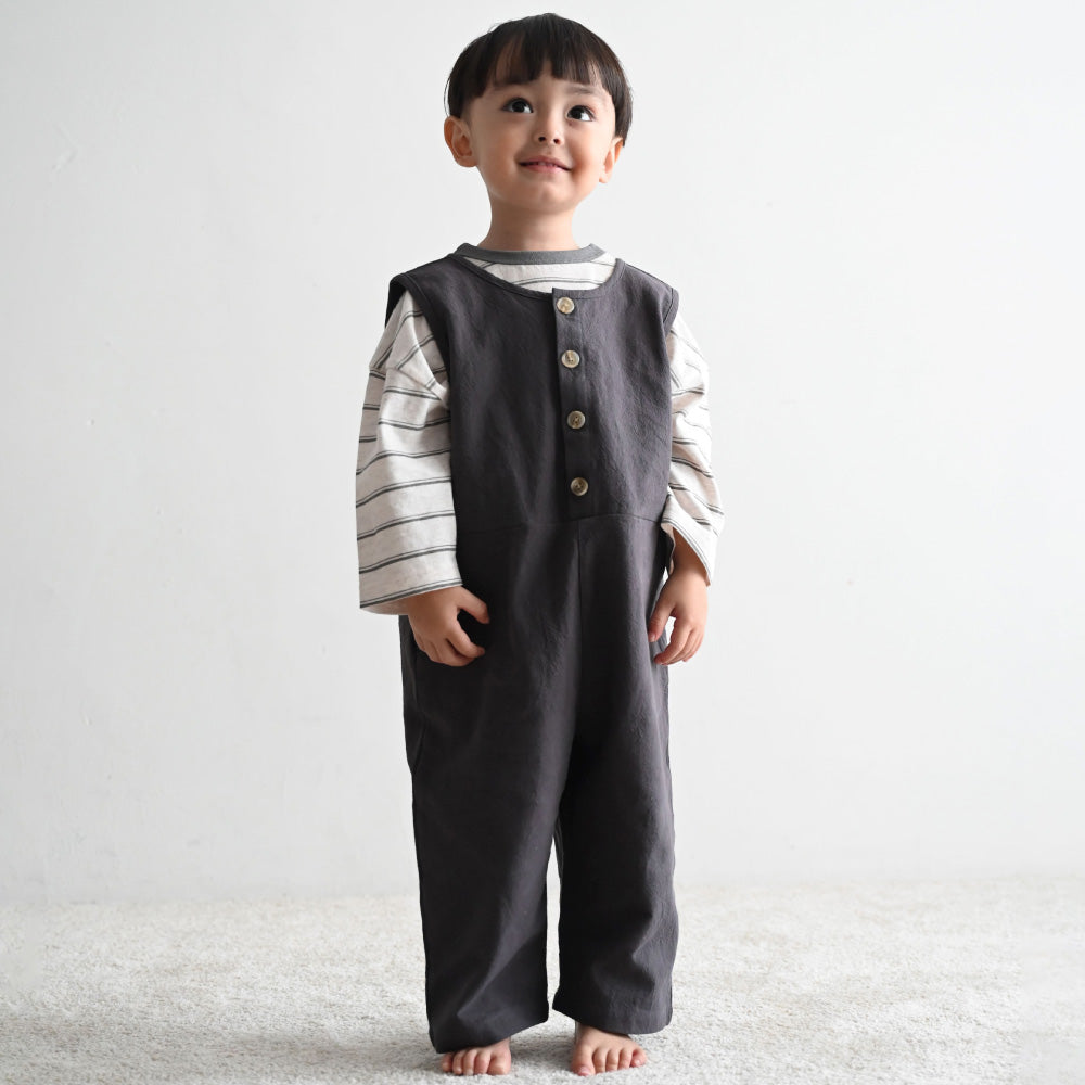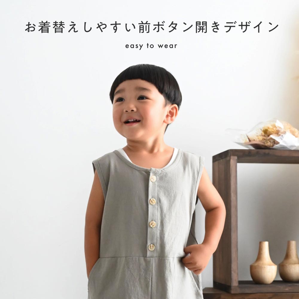 小さな子供でも脱ぎ着がしやすい前面ボタン開きのデザインです。細かいディティールにも子供服ならではの配慮を。