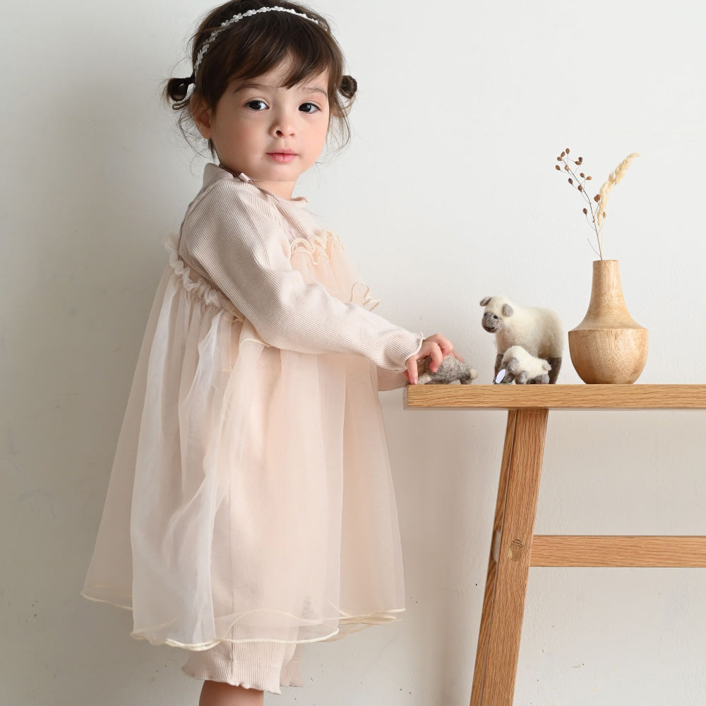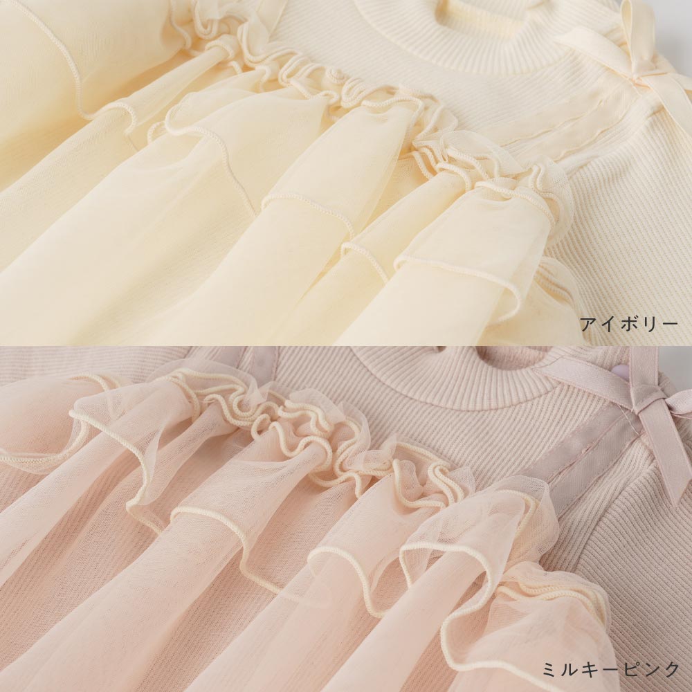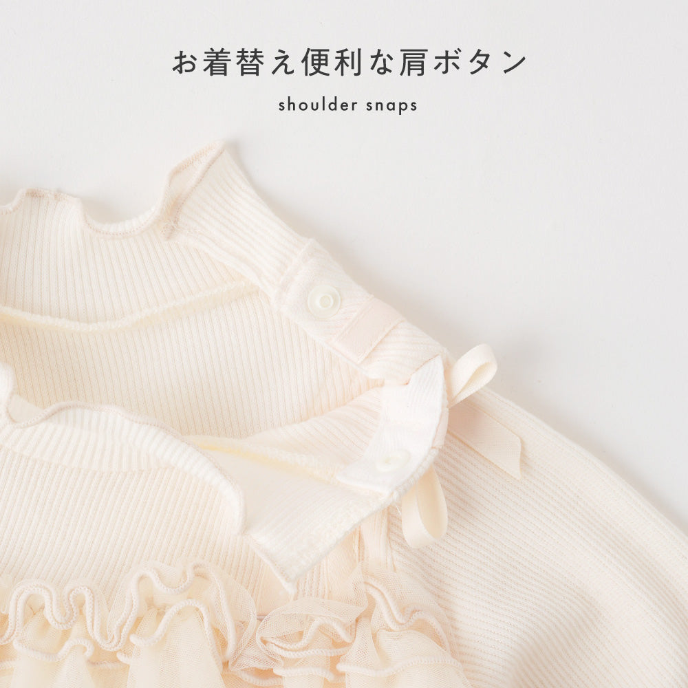 フリル状の柔らかな仕上がりがかわいい衿周り、袖口、足口部分はゴワゴワ・チクチクしない柔らかなメローロック。細かいディティールにベビー服ならではの配慮を。