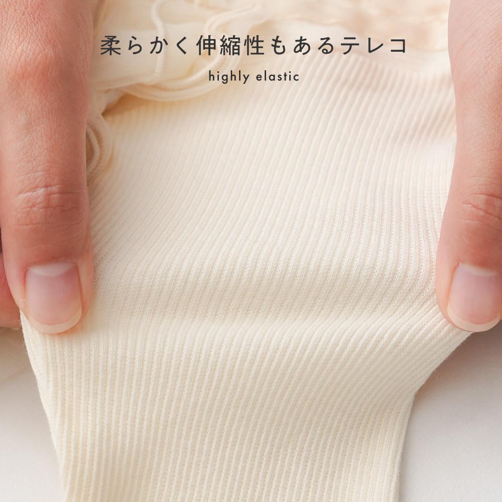 柔らかでしなやかな伸縮性のあるリブ編みのテレコは、肌触りが良く、身体に心地よくフィットします。シワになりにくく、型崩れしにくいのも長所です。