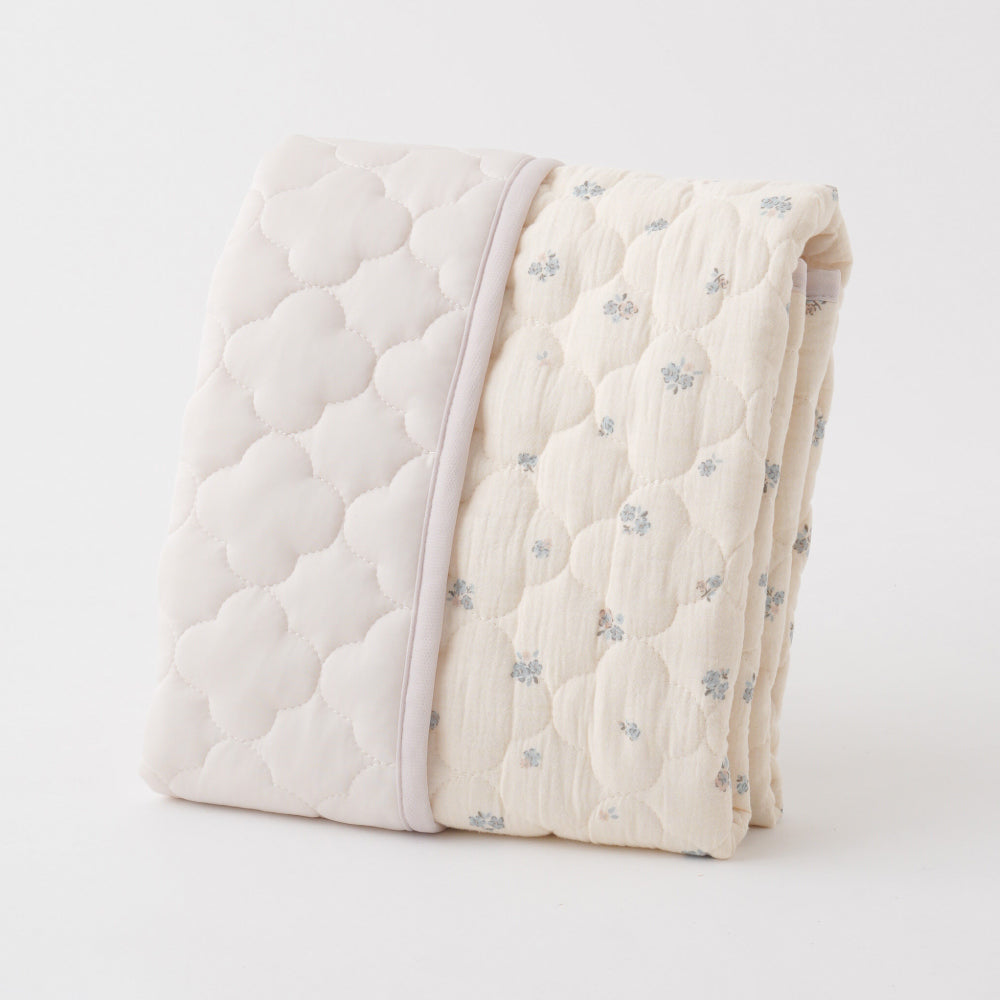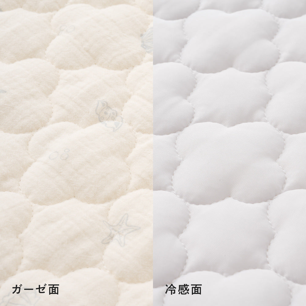 夏場はひんやり気持ちいい接触冷感面を、春・秋は肌当たりやわらかなガーゼ面で。中綿入りのふんわりキルトを使用した、春・夏・秋の3シーズンお使いいただける敷きパッドです。