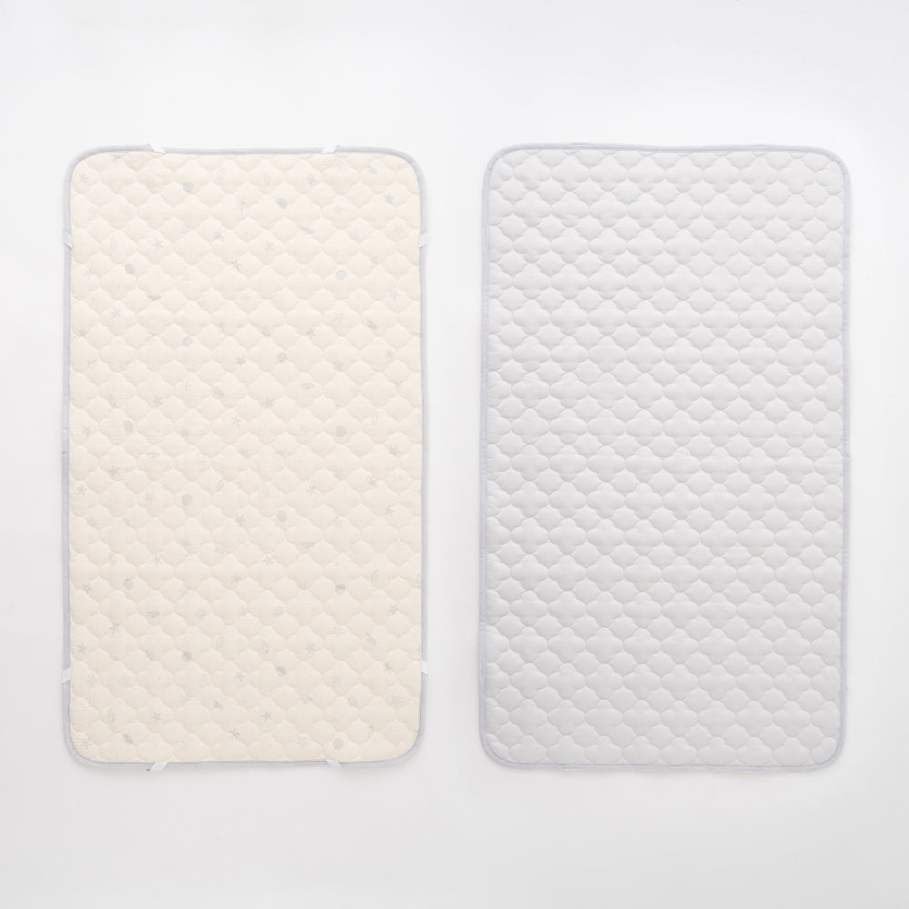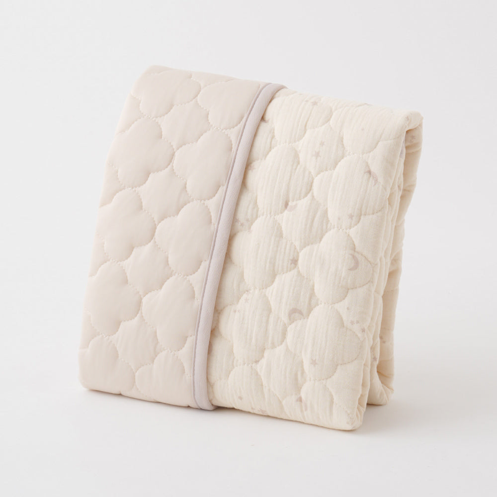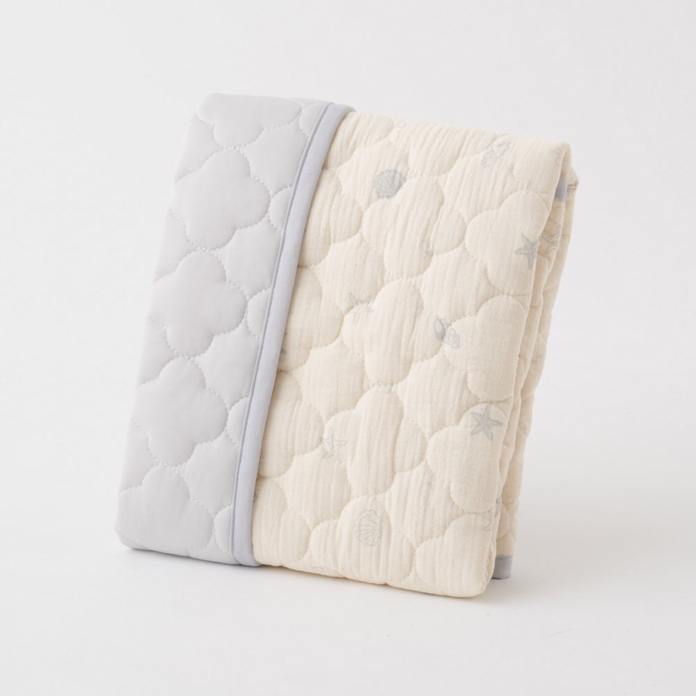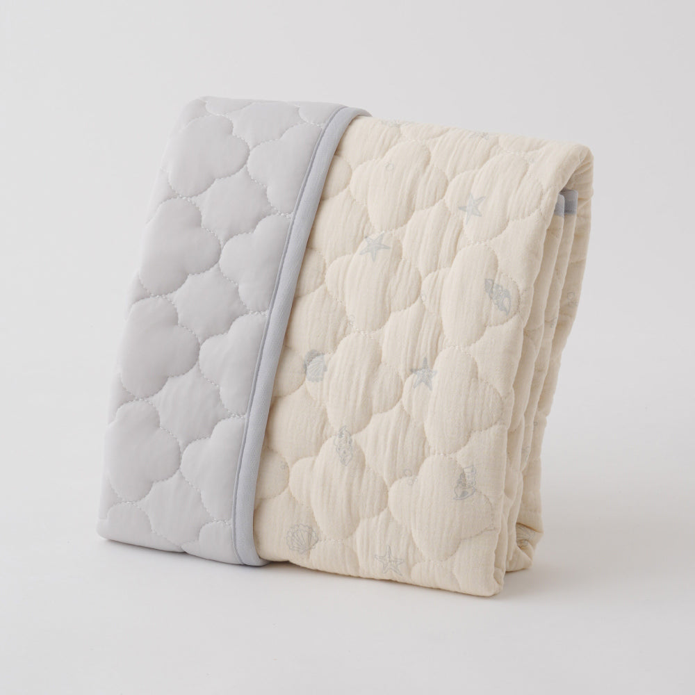 片面は吸水性、通気性のいい綿100%のオーガニック2重ガーゼを、もう片面はひんやり気持ちいい接触冷感生地を使用。ひんやりとした肌ざわりで、汗っかきな赤ちゃんに気持ちのいい使用感です。いいとこどりのリバーシブルタイプなので、春から秋まで長くお使いいただけます。