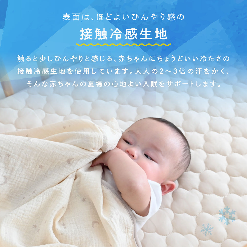 触ると少しひんやりと感じる、赤ちゃんにちょうどいい冷たさの接触冷感生地を使用しています。大人の2~3倍の汗をかく、そんな赤ちゃんの夏場の心地よい入眠をサポートします。※本製品は赤ちゃん用のため、接触冷感生地は大人の方で少しひんやりするぐらいの生地を使用しております。