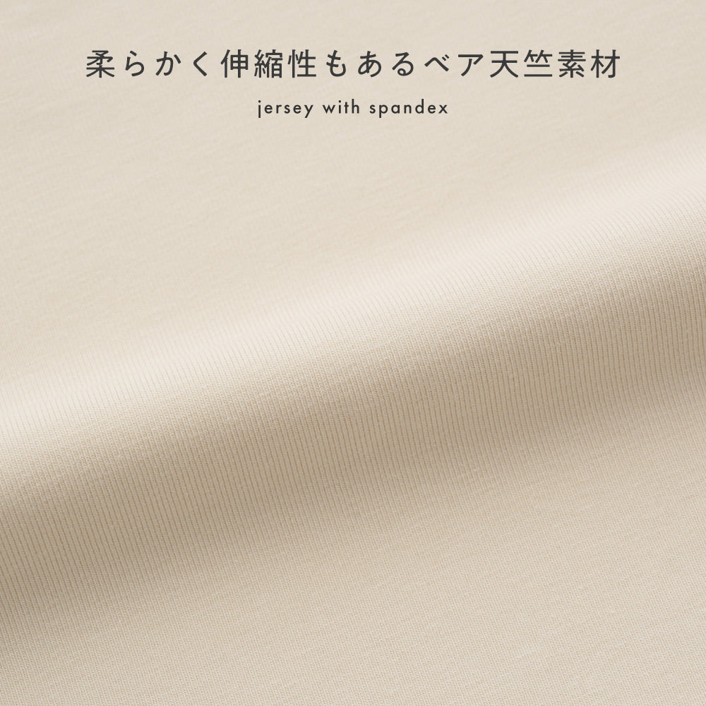• 柔らかでしなやかな伸縮性のある天竺生地は、肌触りが良く、身体にやさしくフィットします。シワになりにくく、型崩れしにくいのも長所です。