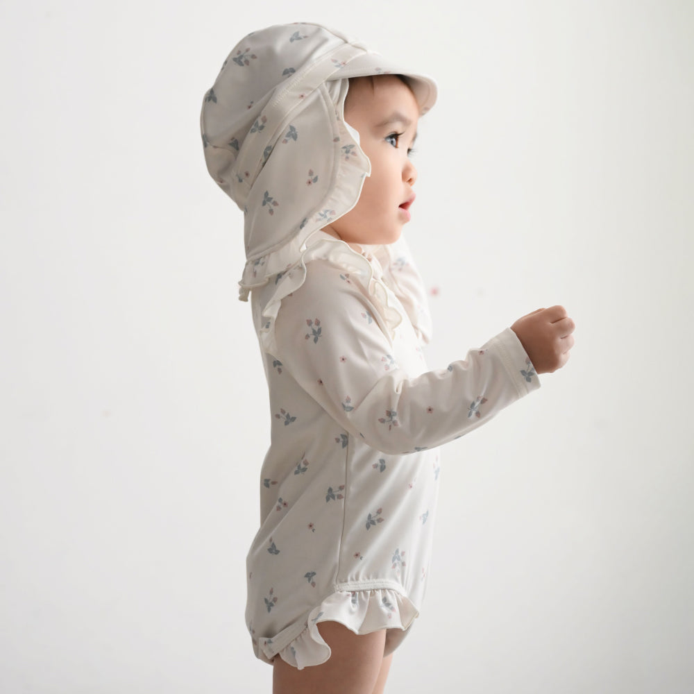 同デザインのスイムキャップはかわいいのにしっかり紫外線対策で、前はつば付きで後ろはネックシェード(日よけたれ)付き。セットでのご購入がおススメ。キャップ無しも選択できます。